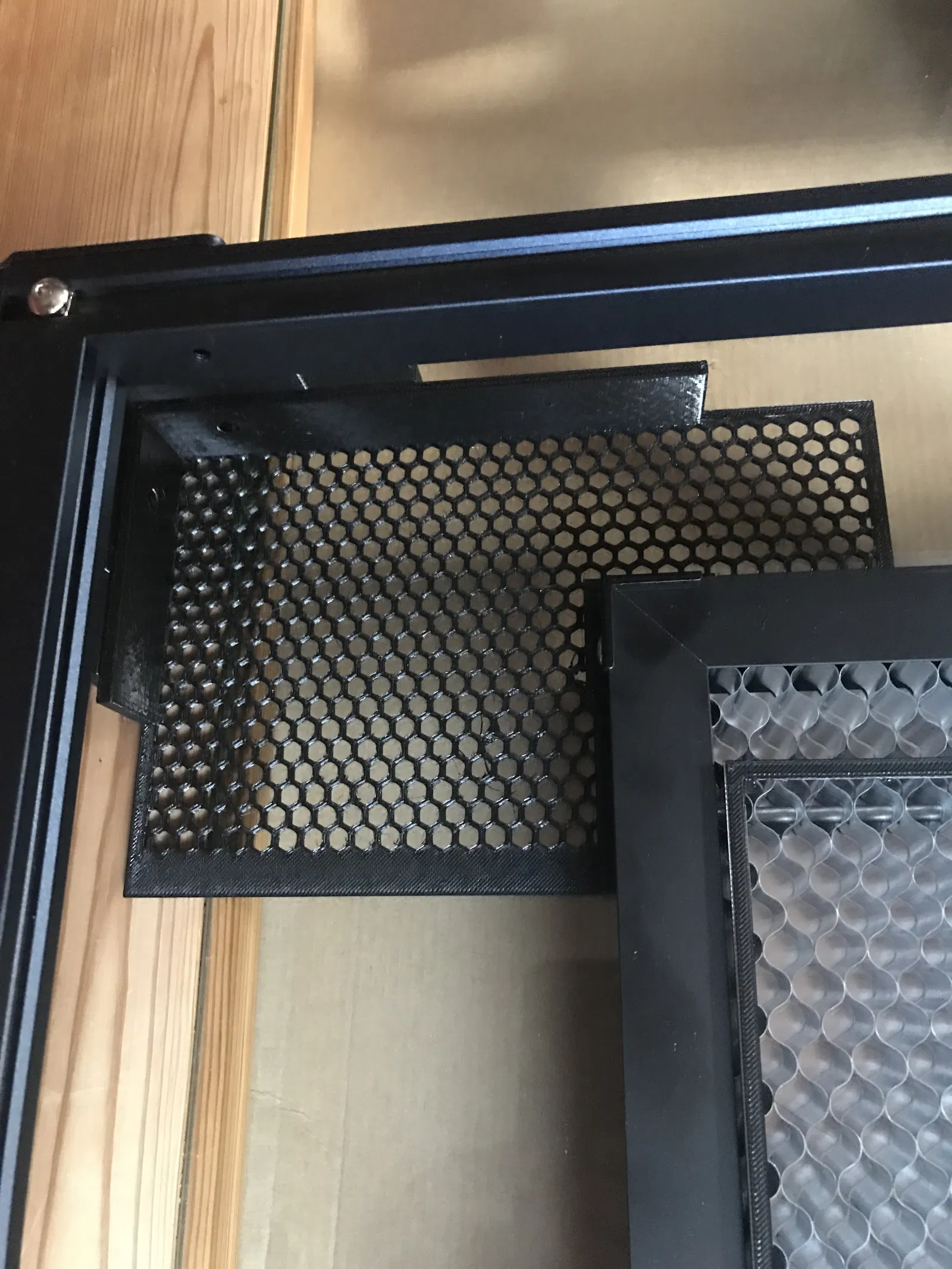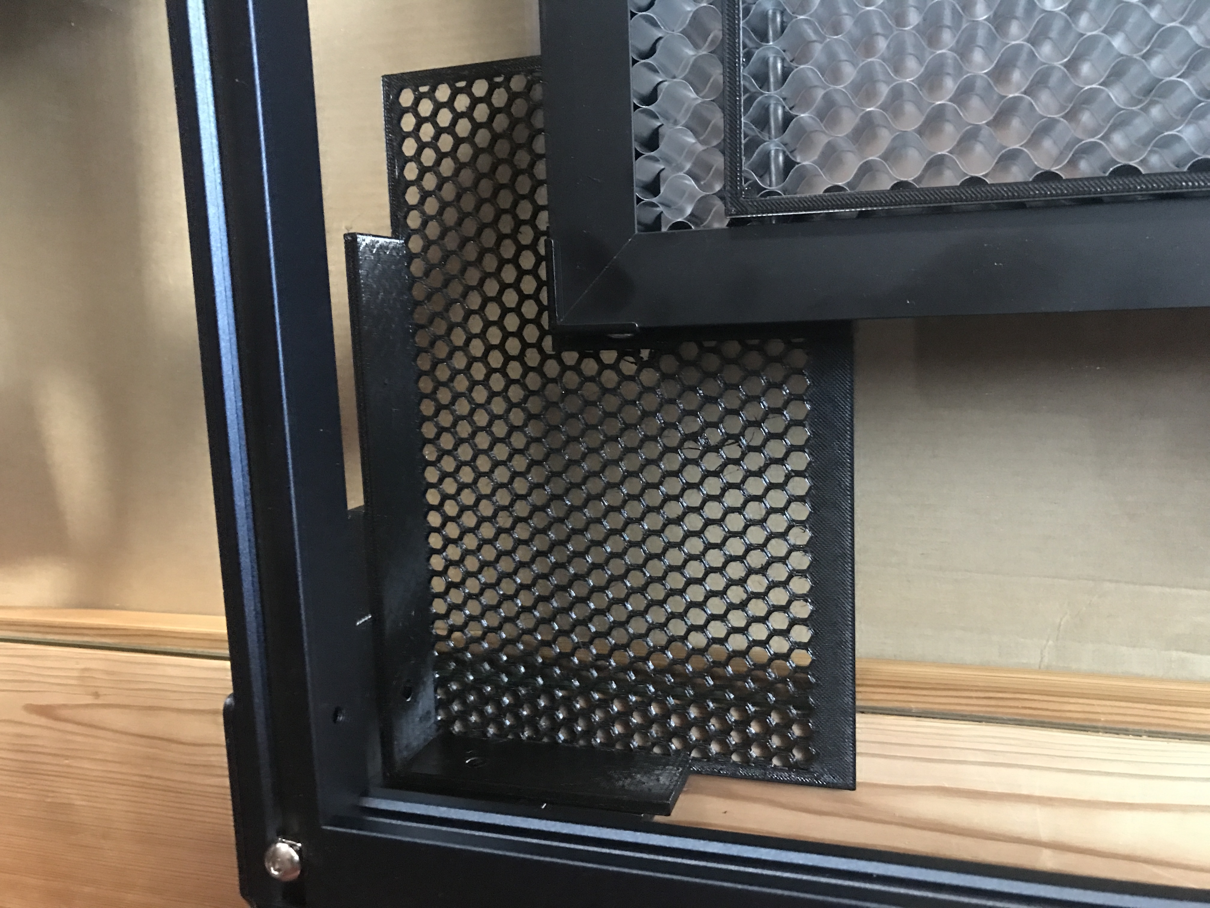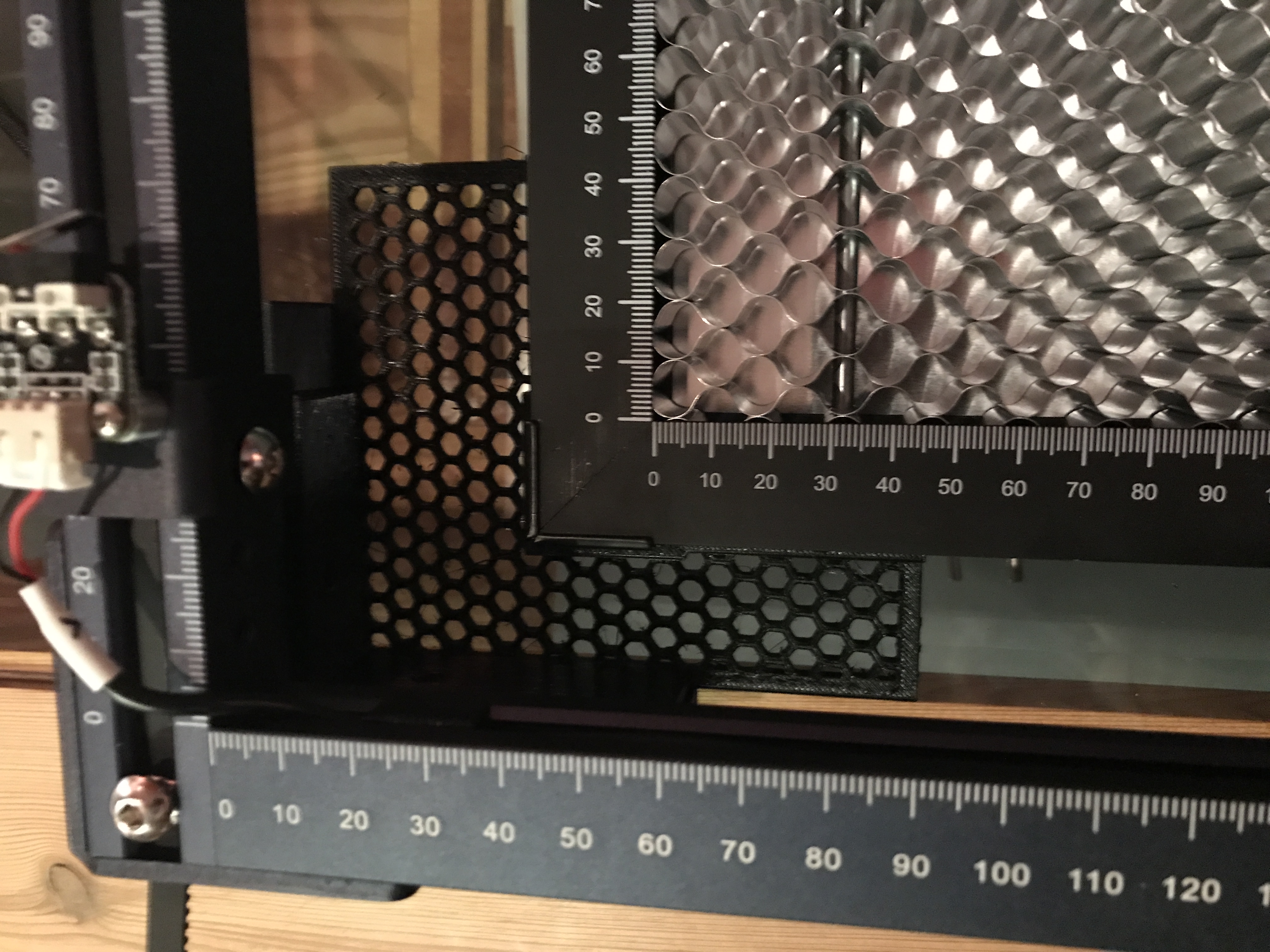 Tấm này được gọi là “tấm tổ ong”. Nó nên được đặt ở đâu đó trong khung lõi sculpfun (các bộ phận đại diện cho trục Y) của máy laser - tốt nhất là cạnh bên trong hoặc góc của nó thẳng hàng với vị trí gốc 0 của đầu laser... và tất nhiên là thẳng hàng với khung lõi.