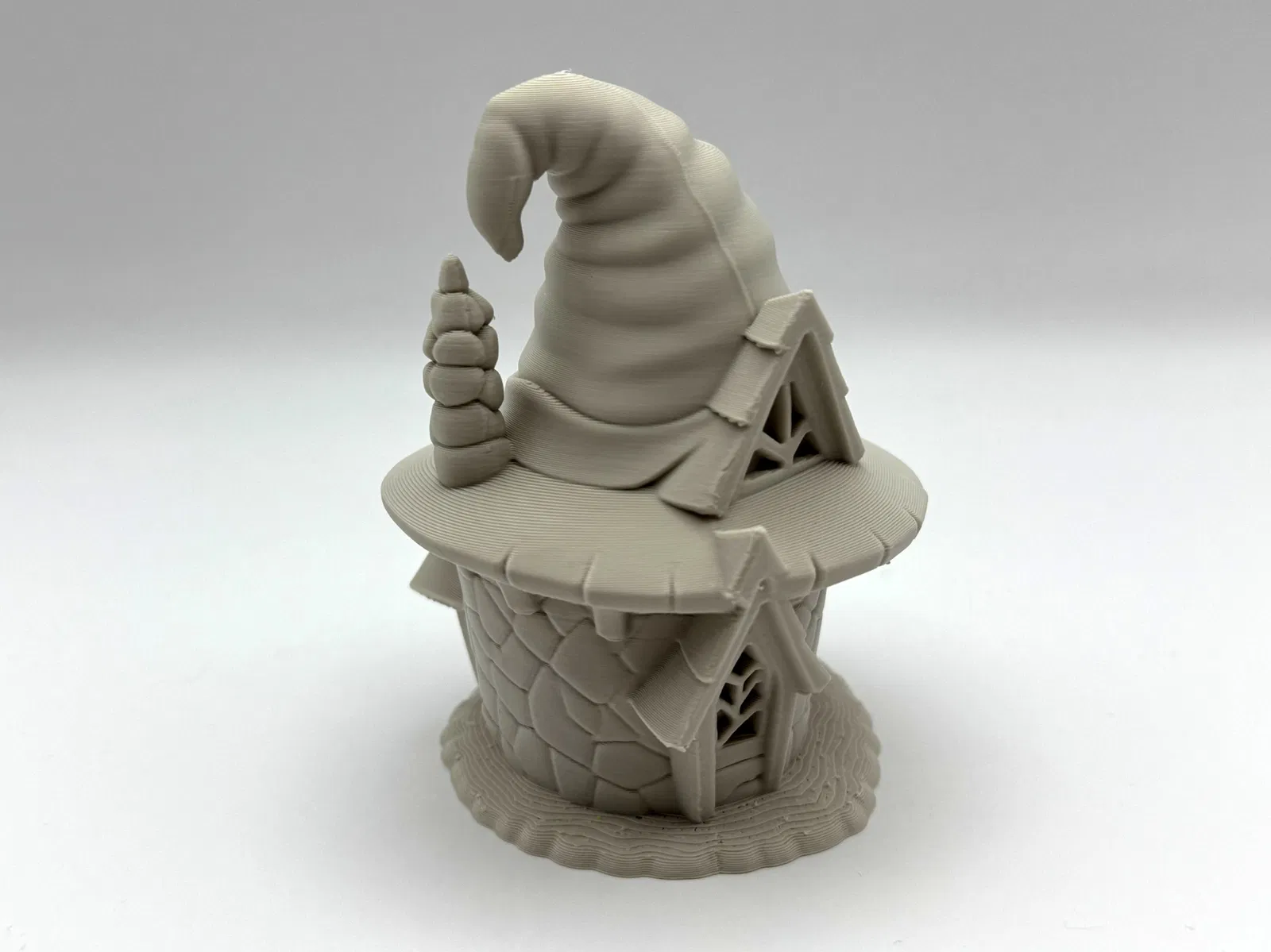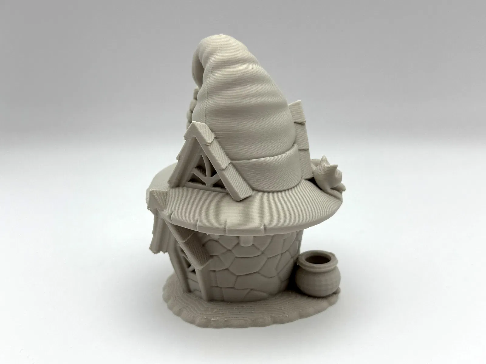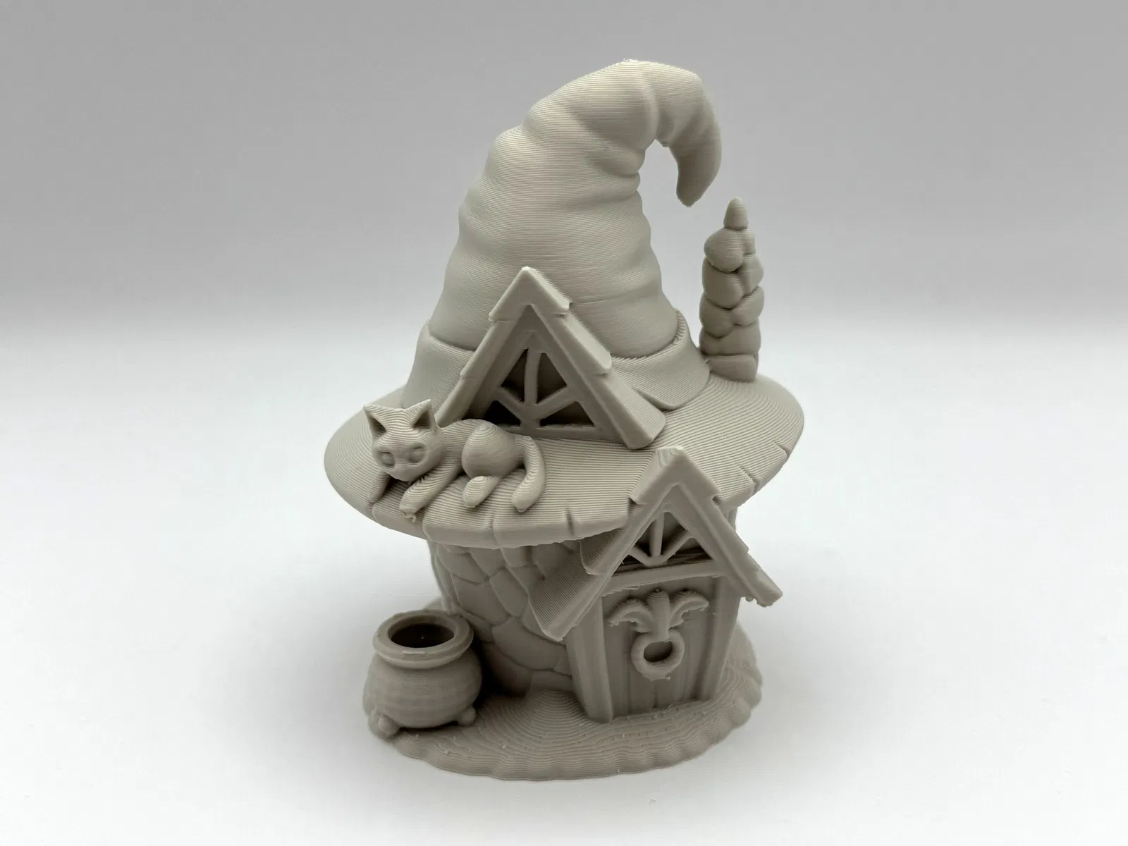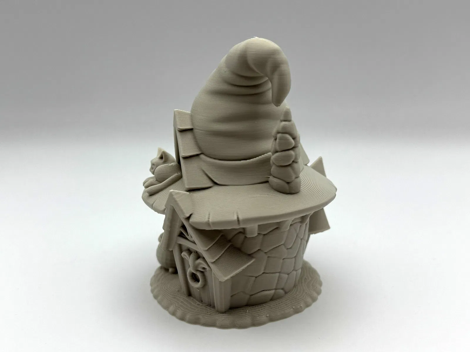 Mang đến cho kệ sách hay khu vườn cổ tích của bạn một chút quyến rũ Halloween với ngôi nhà tí hon trong truyện cổ này: móng đá, mái nhà hình chóp nhọn của phù thủy, mèo cưng đang lim dim trên mái hiên.