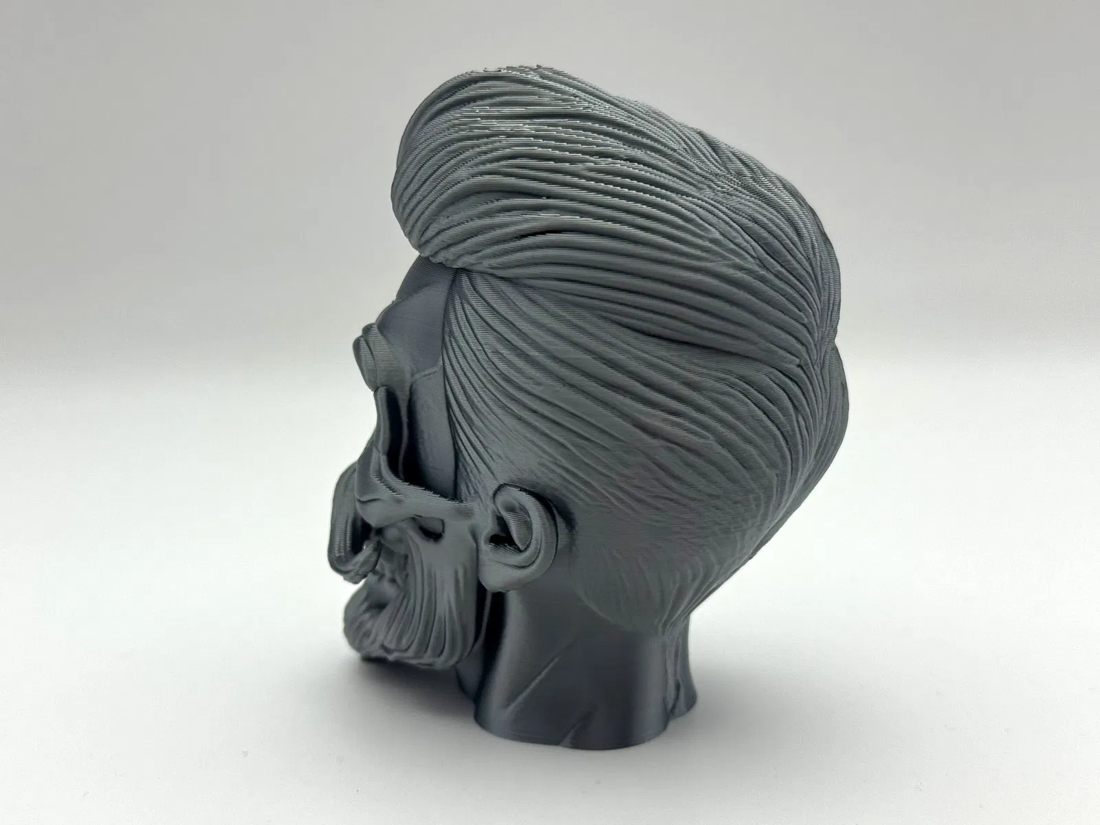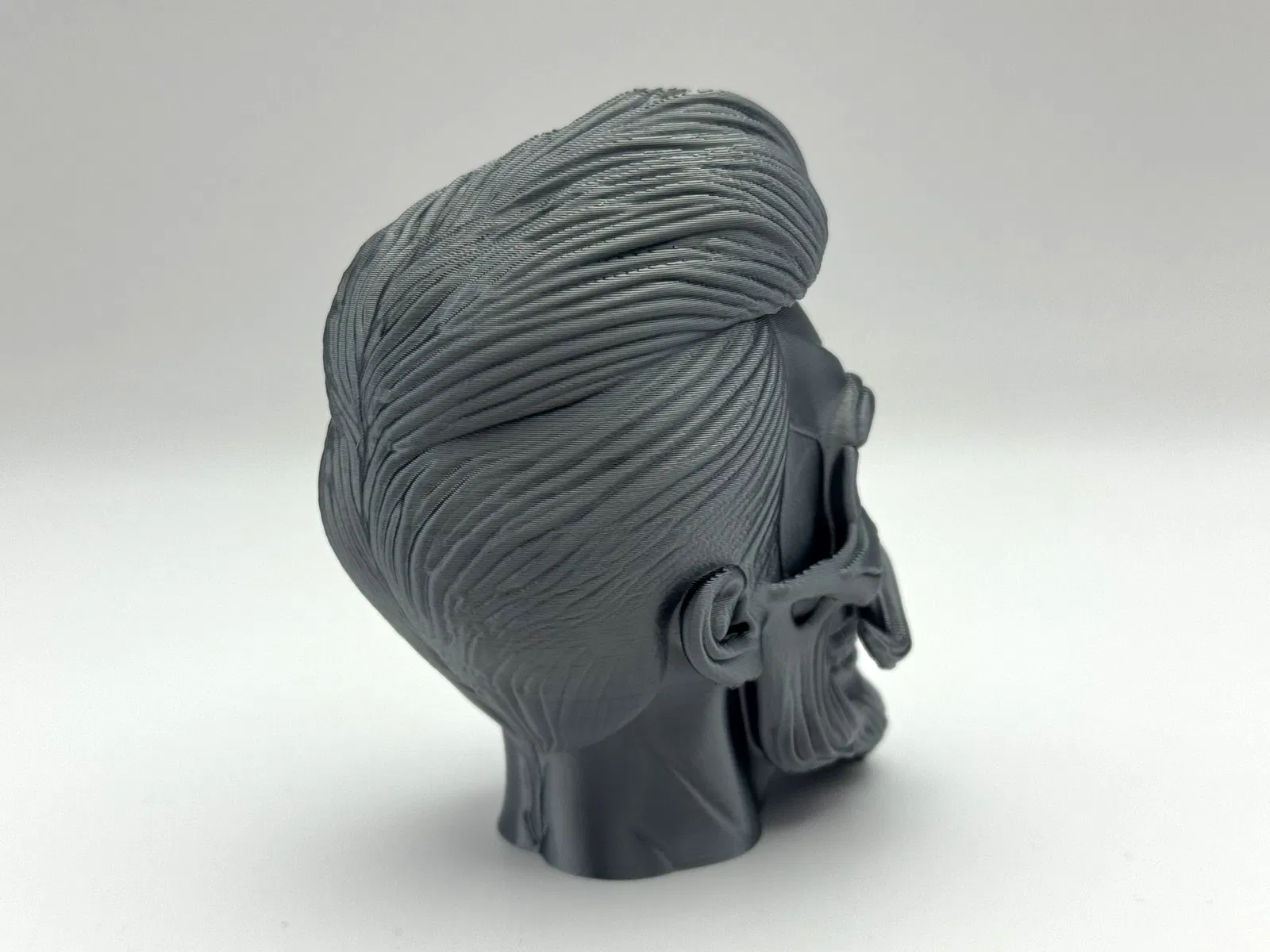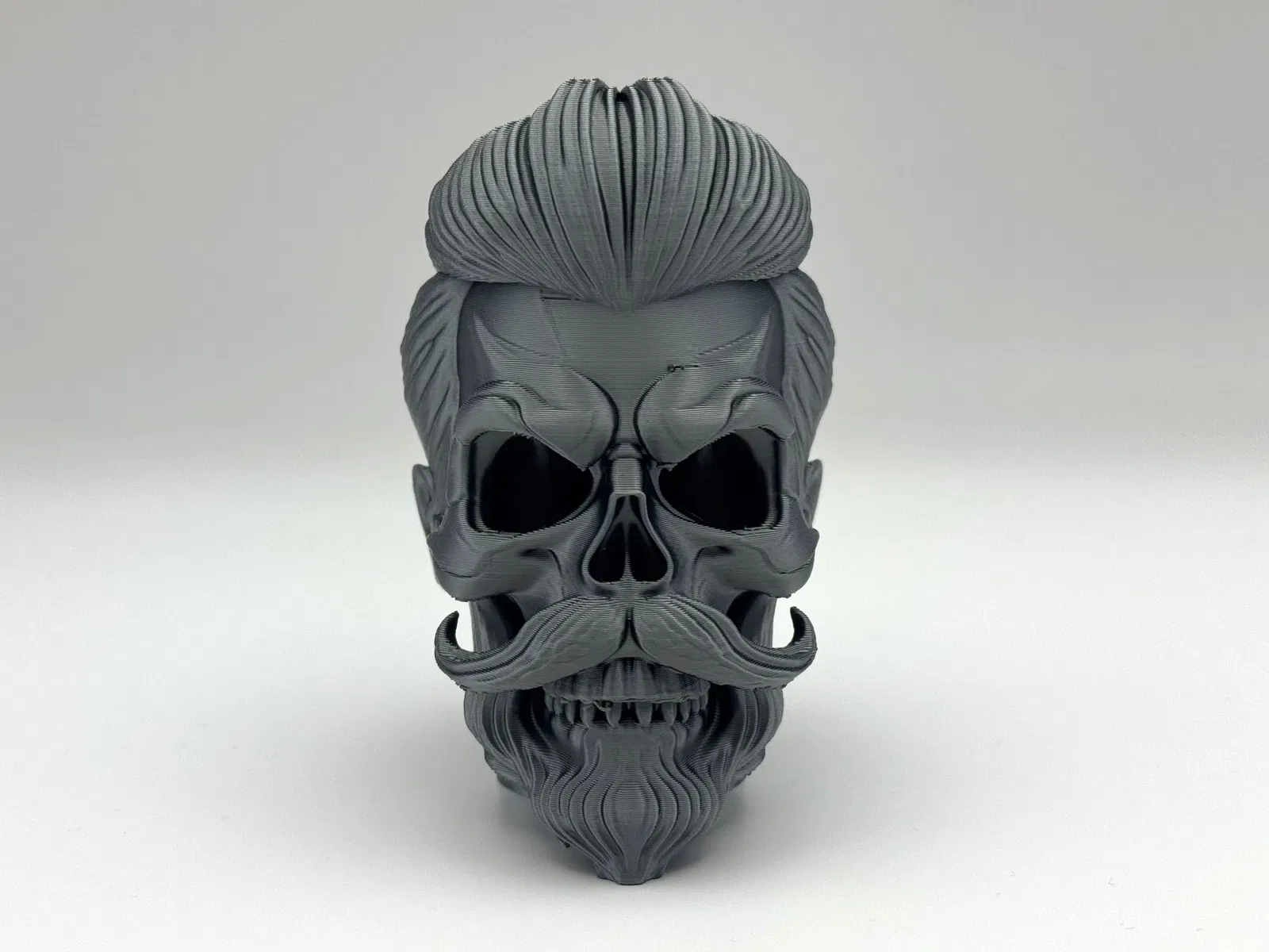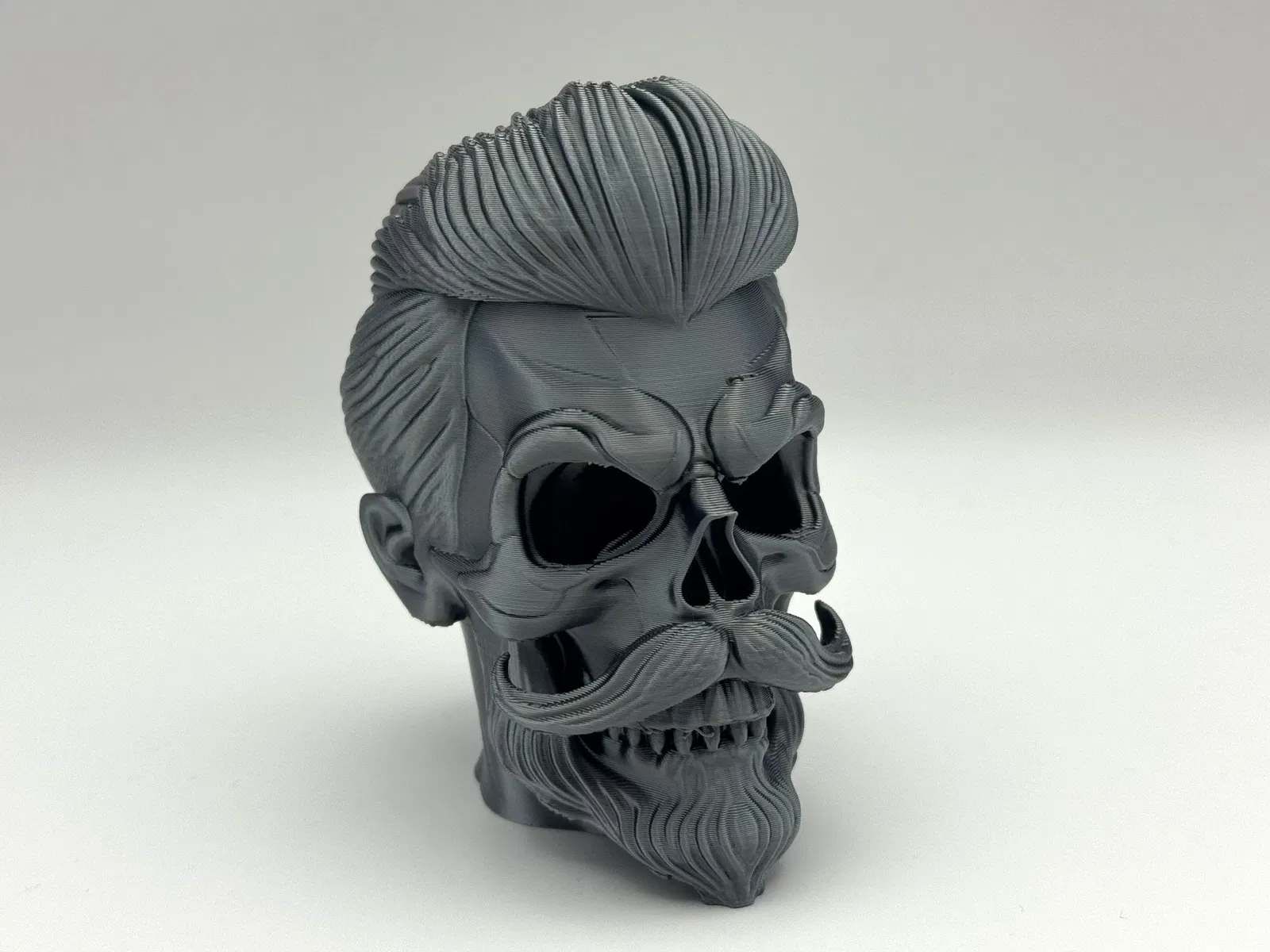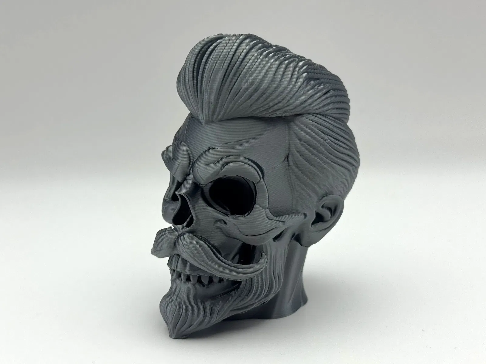 Tượng Đầu Lâu Phong Cách, với mái tóc pompadour bóng mượt, ria mép uốn cong và bộ râu chạm khắc tinh xảo trên khuôn mặt xương xẩu đang cười. Cần hỗ trợ hữu cơ để in ấn. Giấy phép thương mại có sẵn qua Patreon.