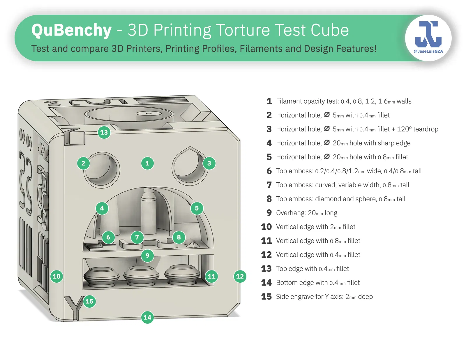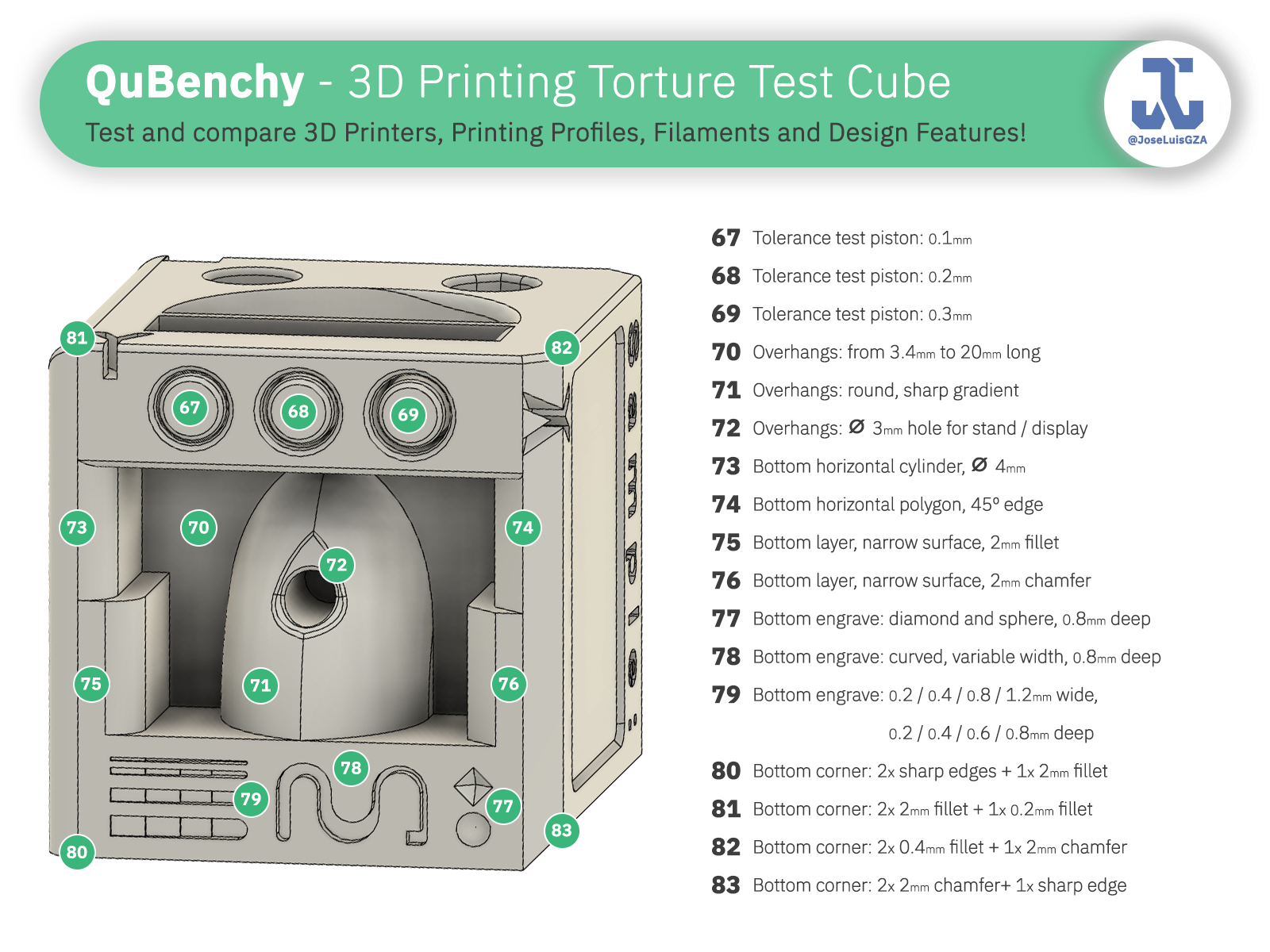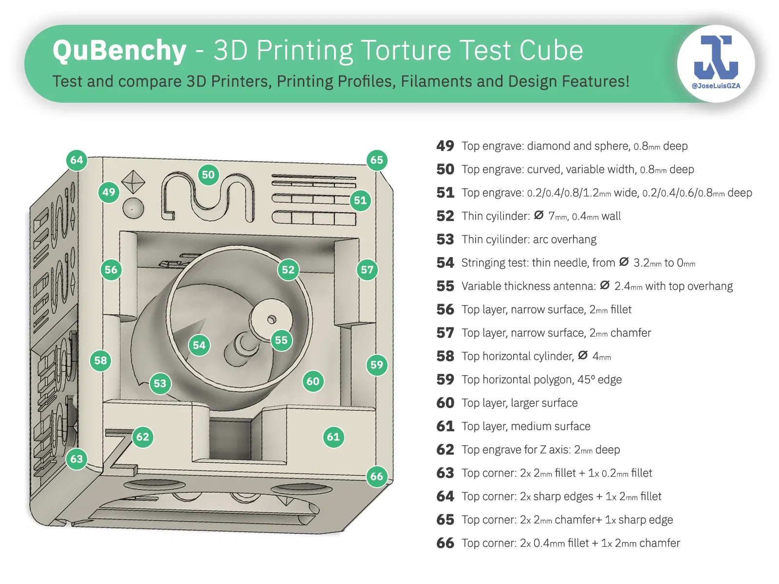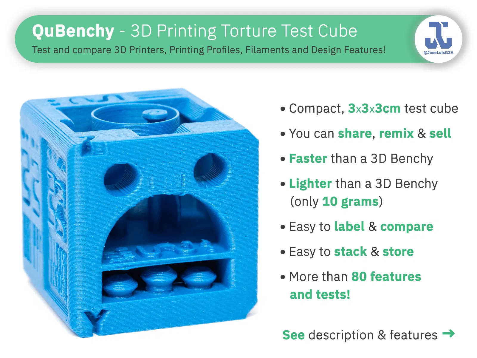 Tôi đã nhét hơn 80 bài test và tính năng khác nhau vào một khối lập phương tra tấn 3x3x3cm tiện lợi, dễ in, dễ đánh giá, so sánh và lưu trữ. Và tôi chia sẻ nó với cộng đồng in 3D theo giấy phép CC BY SA 4.0! Bạn có thể chia sẻ, chỉnh sửa và sử dụng QuBenchy cho mục đích thương mại. Đăng QuBenchies của bạn ở phần bình luận nha!