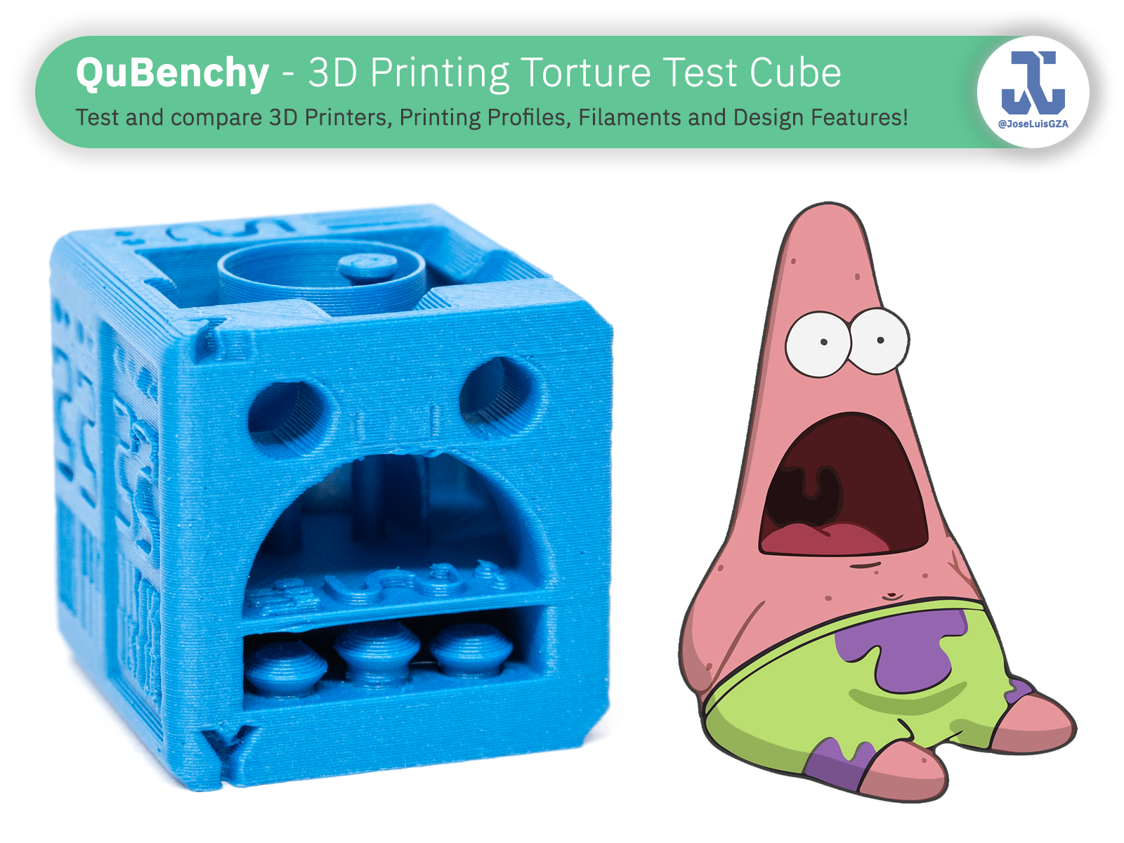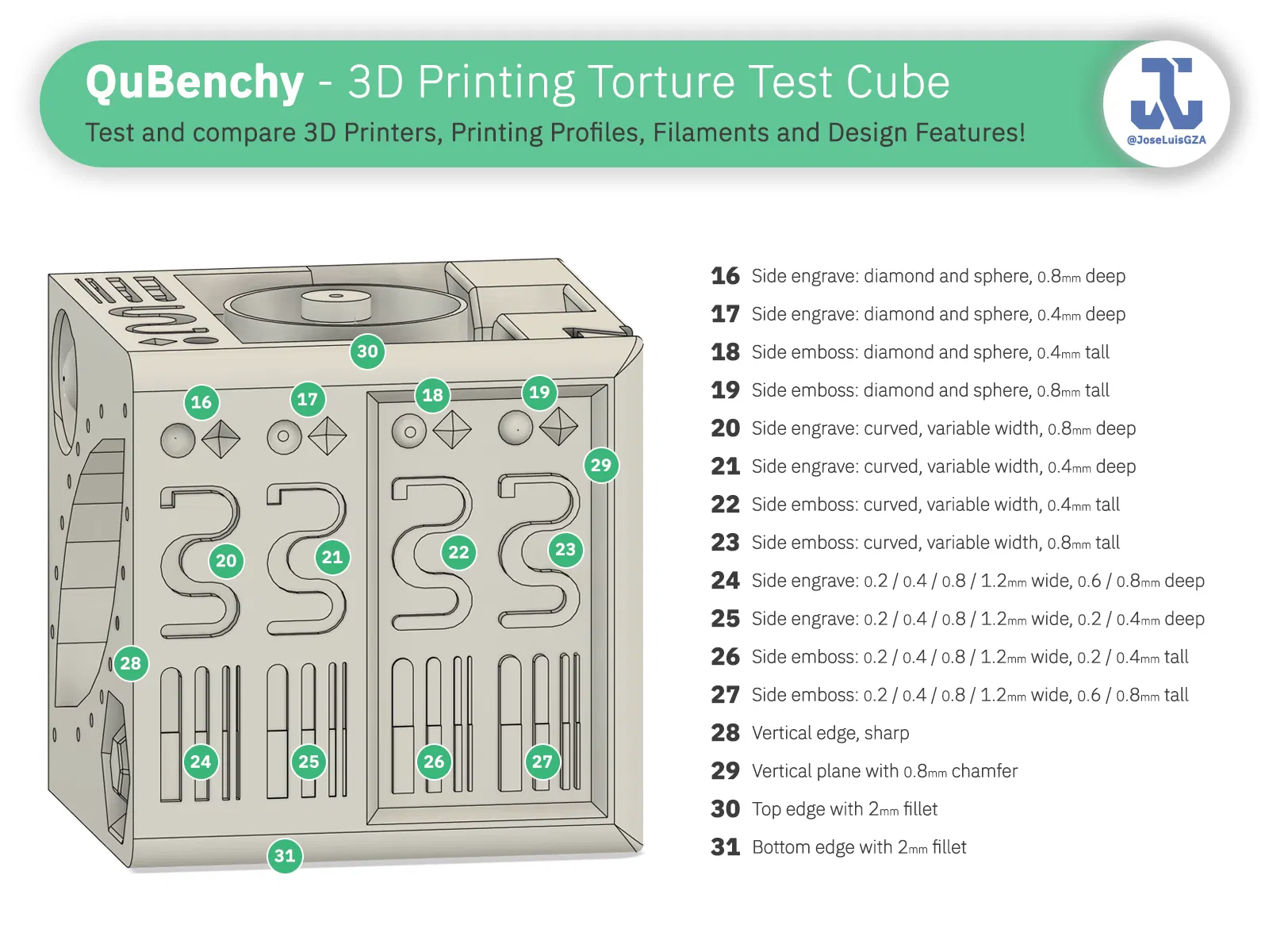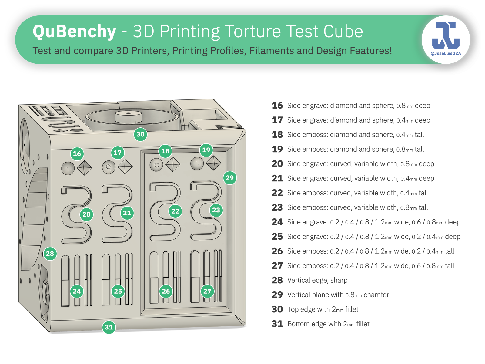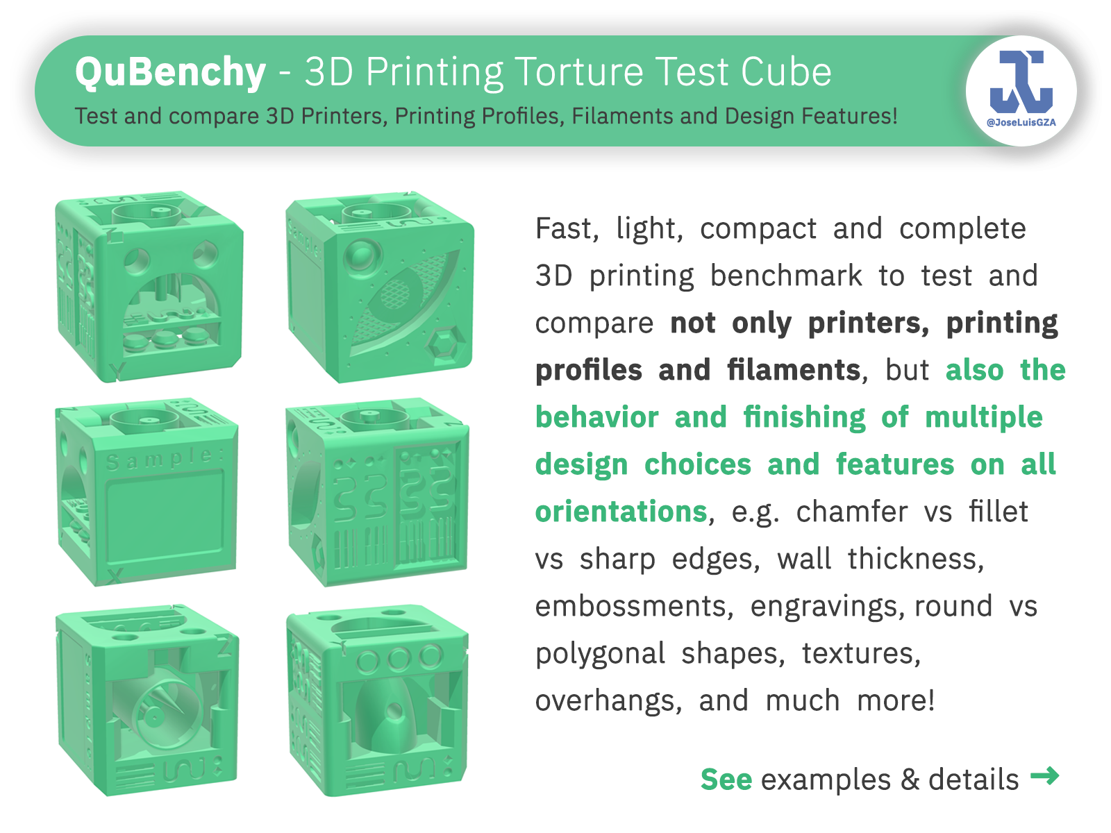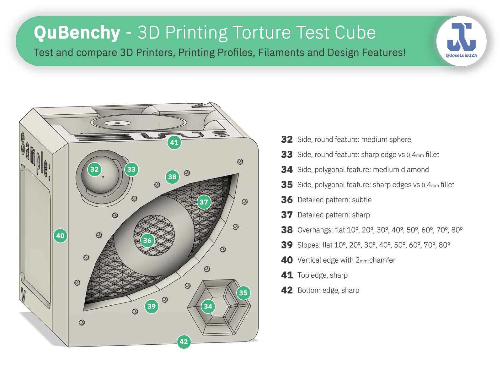 Tôi đã nhét hơn 80 bài test và tính năng khác nhau vào một khối lập phương tra tấn 3x3x3cm tiện lợi, dễ in, dễ đánh giá, so sánh và lưu trữ. Và tôi chia sẻ nó với cộng đồng in 3D theo giấy phép CC BY SA 4.0! Bạn có thể chia sẻ, chỉnh sửa và sử dụng QuBenchy cho mục đích thương mại. Đăng QuBenchies của bạn ở phần bình luận nha!