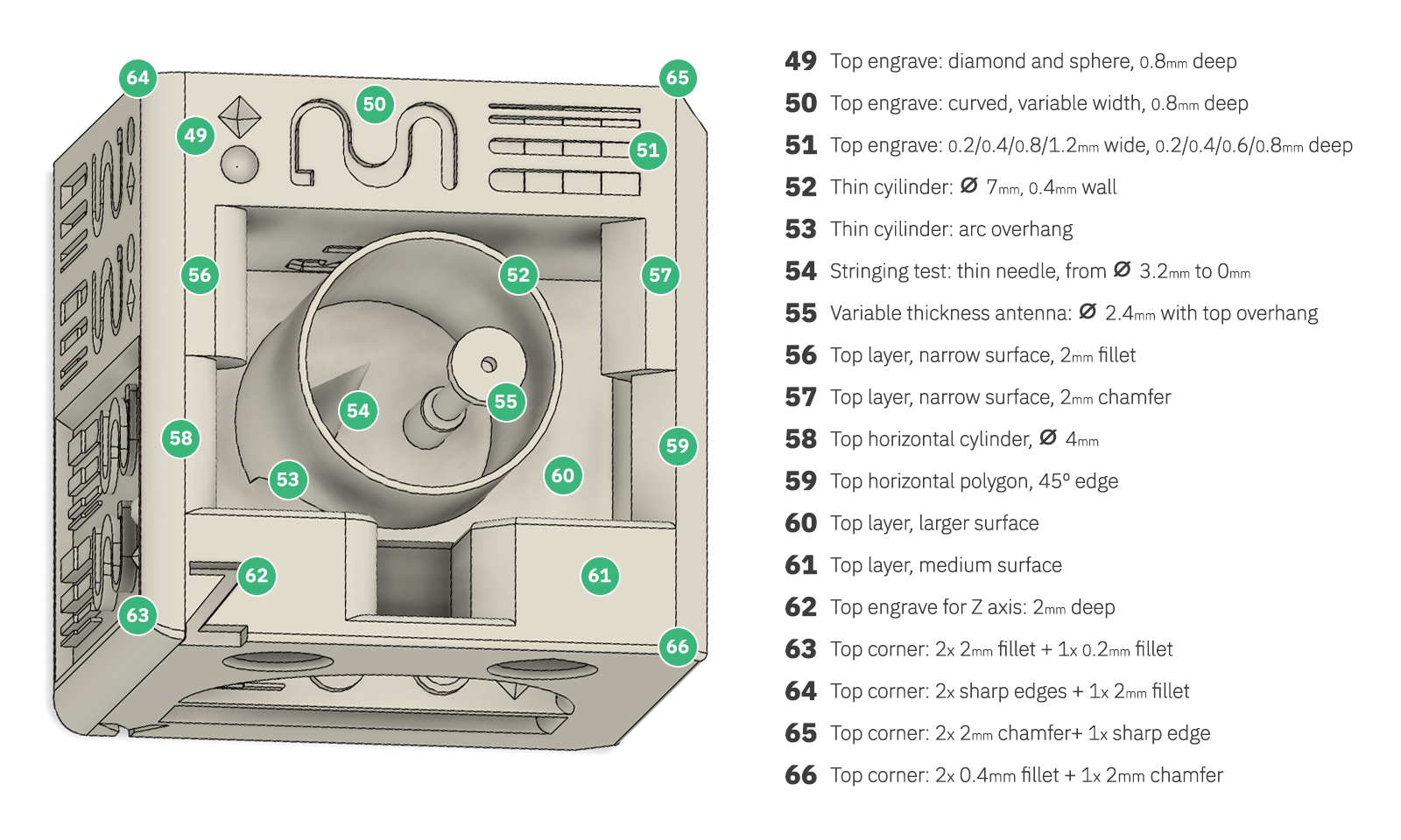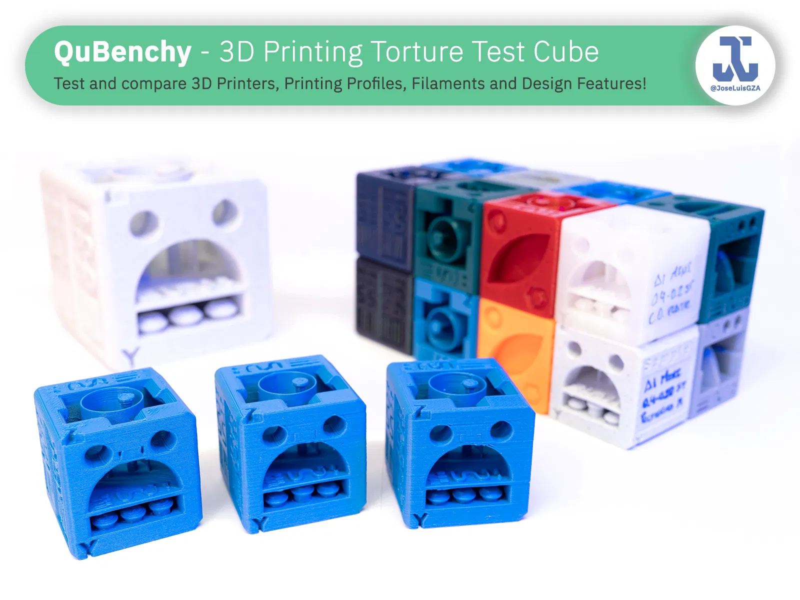 QuBenchy là bài kiểm tra độ bền in 3D mới, được thiết kế để ép máy in của bạn tới giới hạn. Nó bao gồm hơn 80 bài kiểm tra trong một khối 3x3x3cm, đánh giá nhiều khía cạnh như chamfer, fillet, độ dày tường, khắc chìm và chìa ra. Lý tưởng để so sánh máy in, profile và filament.