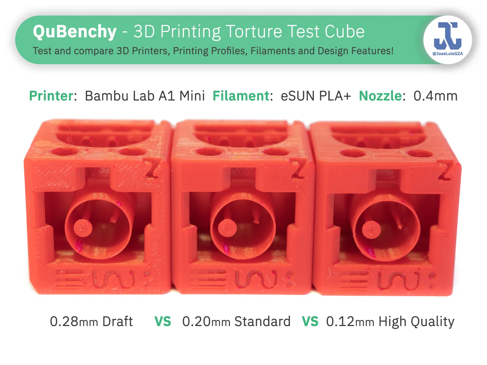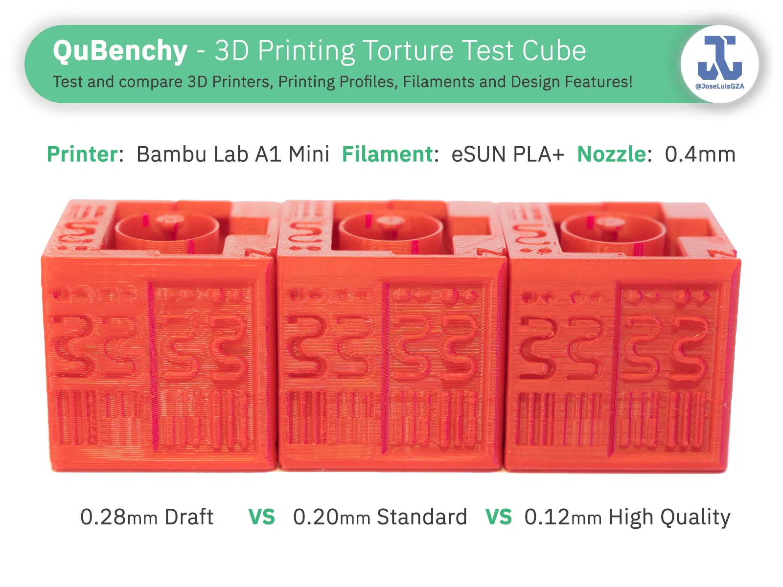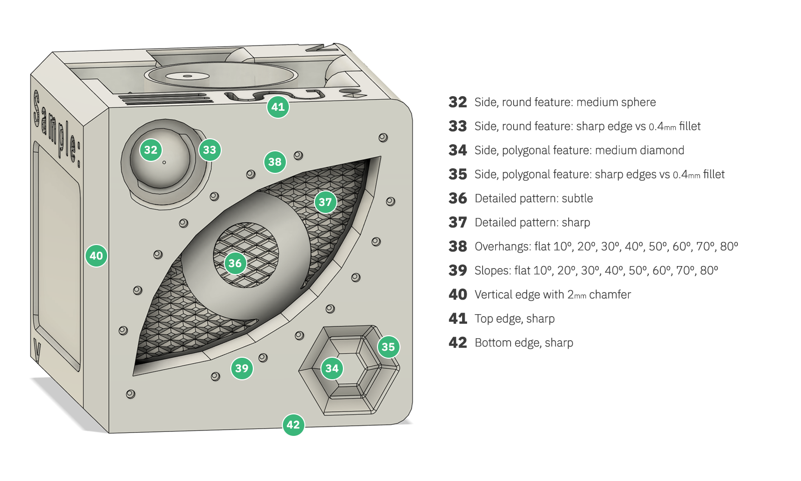Chính vì mấy lý do này - và nhu cầu của bản thân lúc thiết kế cái - mà tôi đã tạo ra QuBenchy. Một benchmark in 3D mở, nhanh, nhẹ, gọn và hoàn chỉnh để thử nghiệm và so sánh không chỉ máy in, profile in và filament, mà còn cả hành vi và hoàn thiện của nhiều lựa chọn thiết kế và tính năng trên mọi hướng, ví dụ: vát cạnh vs bo tròn vs cạnh sắc, độ dày tường, dập nổi, khắc chìm, hình tròn vs đa giác, vân bề mặt, chỗ chìa ra, và còn nhiều nữa!