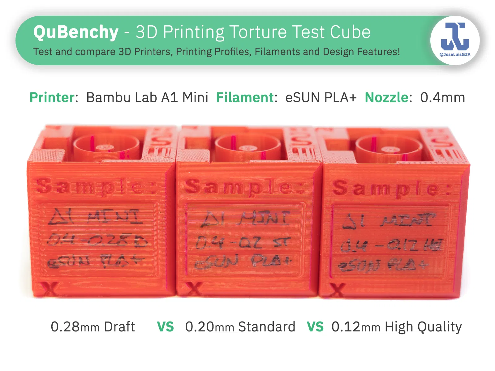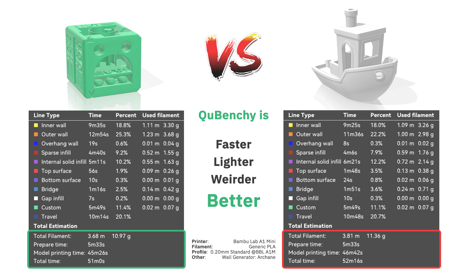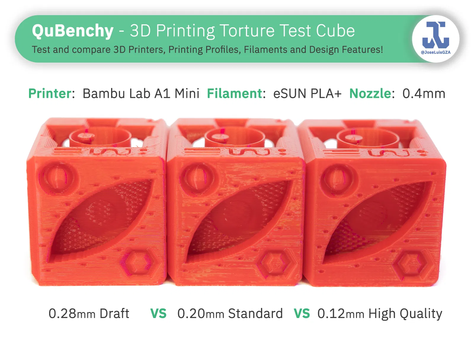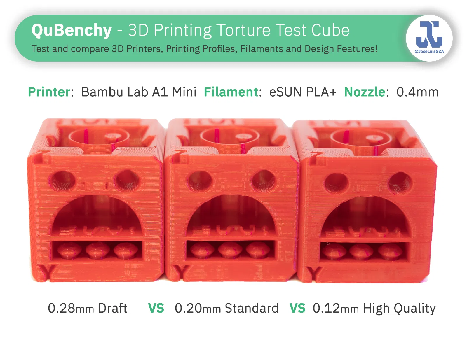Chính vì mấy lý do này - và nhu cầu của bản thân lúc thiết kế cái - mà tôi đã tạo ra QuBenchy. Một benchmark in 3D mở, nhanh, nhẹ, gọn và hoàn chỉnh để thử nghiệm và so sánh không chỉ máy in, profile in và filament, mà còn cả hành vi và hoàn thiện của nhiều lựa chọn thiết kế và tính năng trên mọi hướng, ví dụ: vát cạnh vs bo tròn vs cạnh sắc, độ dày tường, dập nổi, khắc chìm, hình tròn vs đa giác, vân bề mặt, chỗ chìa ra, và còn nhiều nữa!