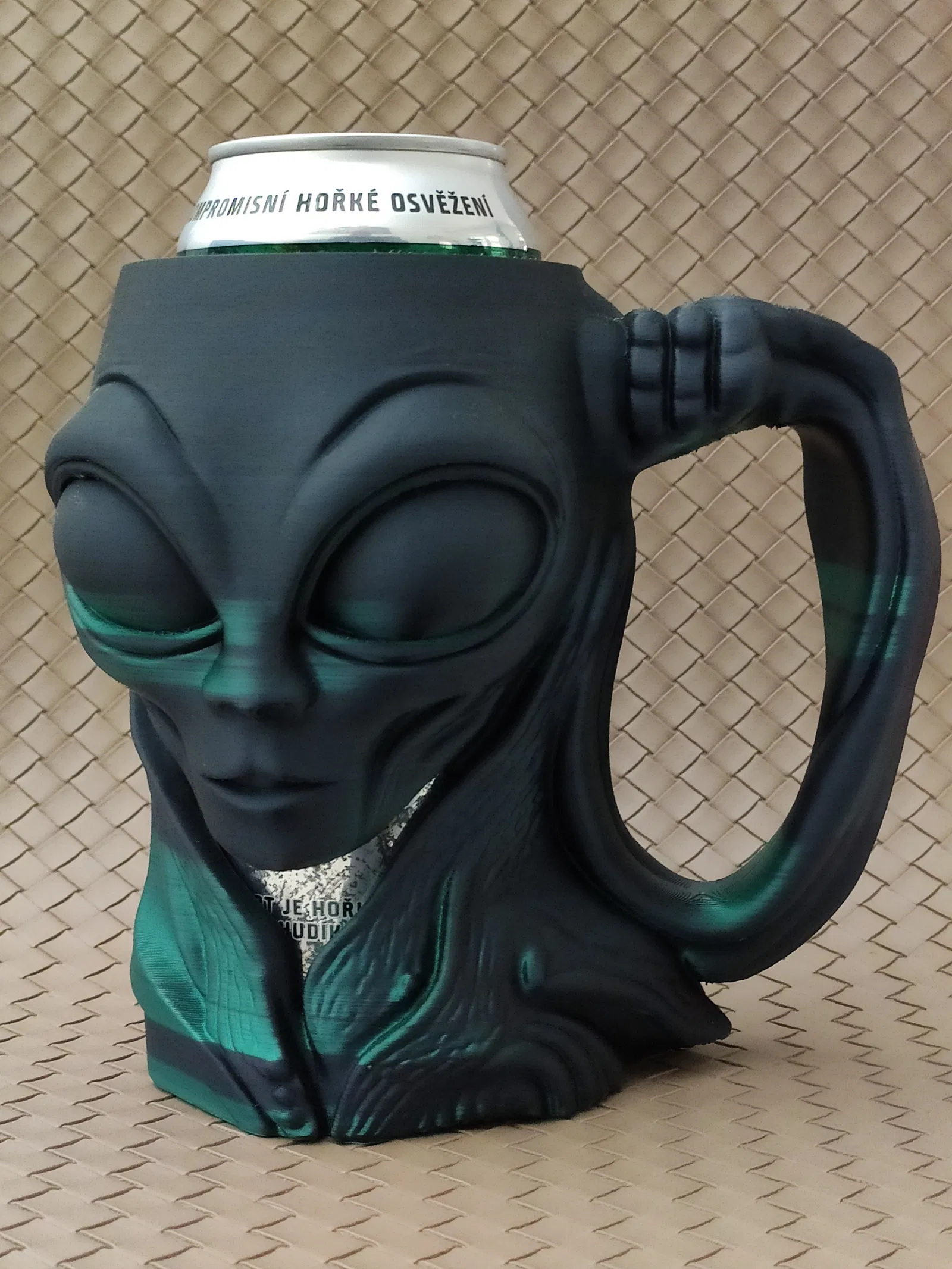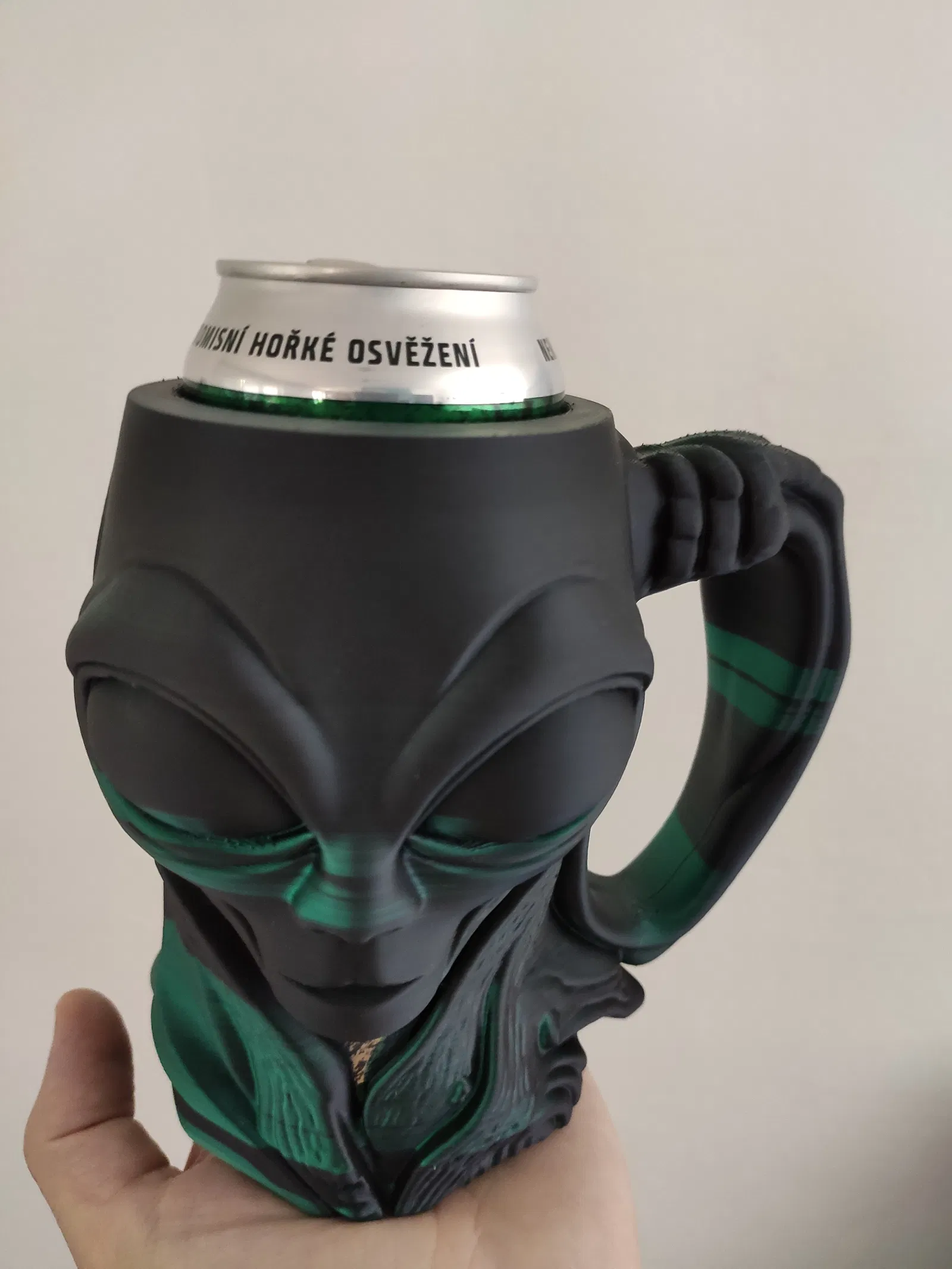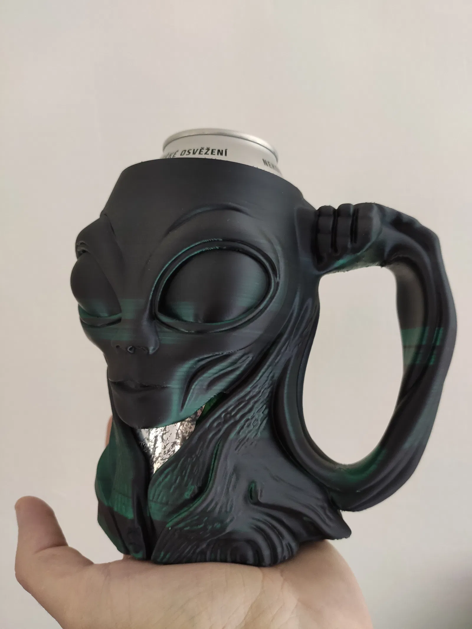 Cái giữ lon hình người ngoài hành tinh xám, vừa lon 0.5L châu Âu. Có thể dùng kèm phôi cho lon 12oz hoặc 330ml mỏng. Khuyến nghị in bằng PLA với layer 0.2mm, 2 tường, 8% gyroid và hỗ trợ cây tự động. Có thể phản chiếu để thay đổi vị trí tay cầm.