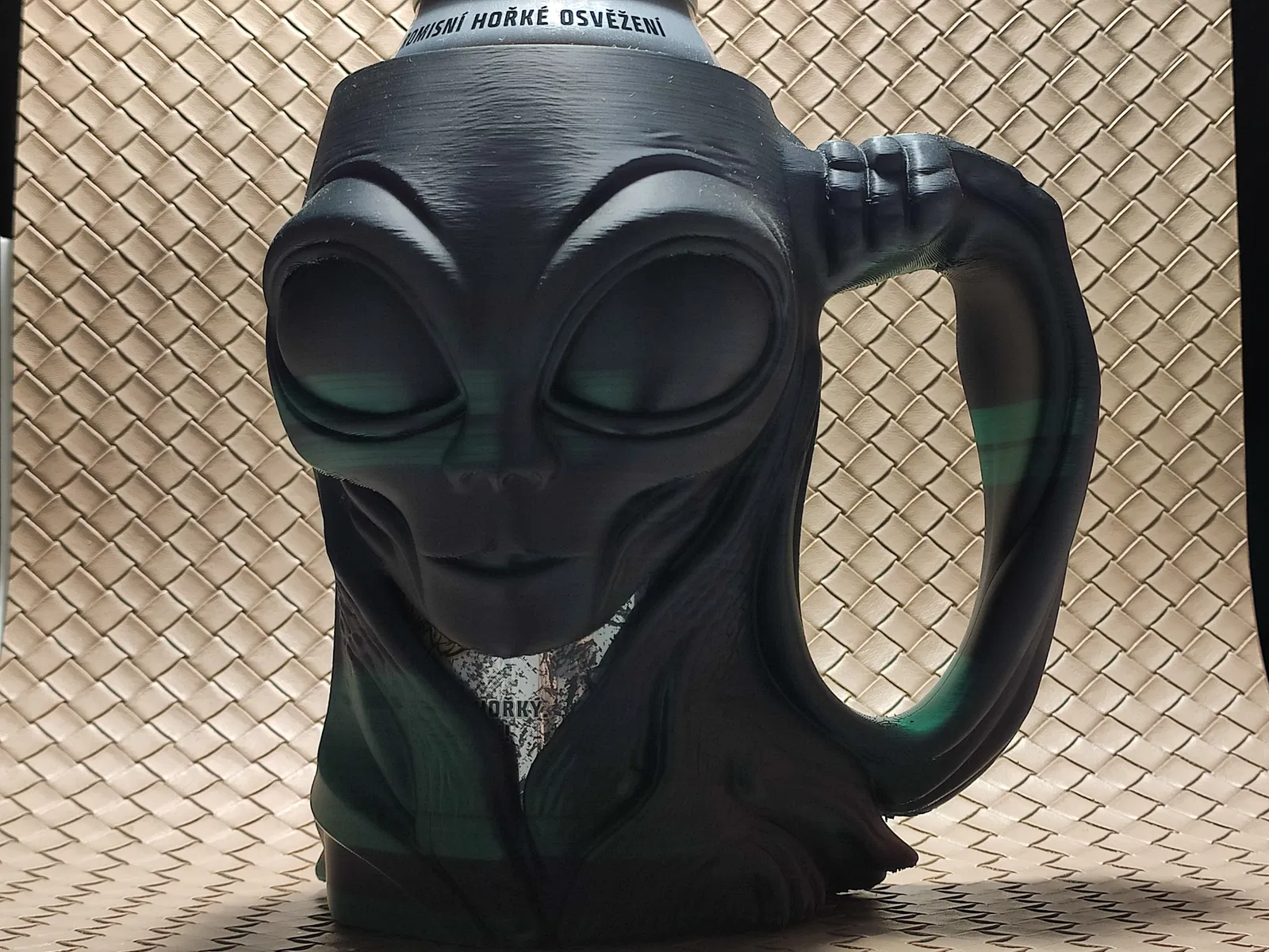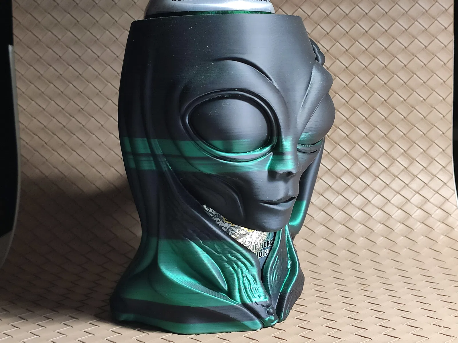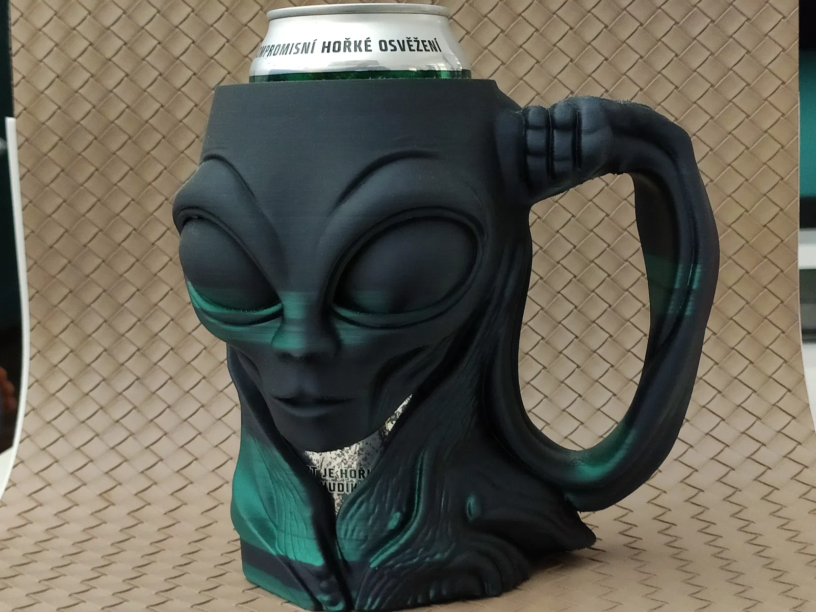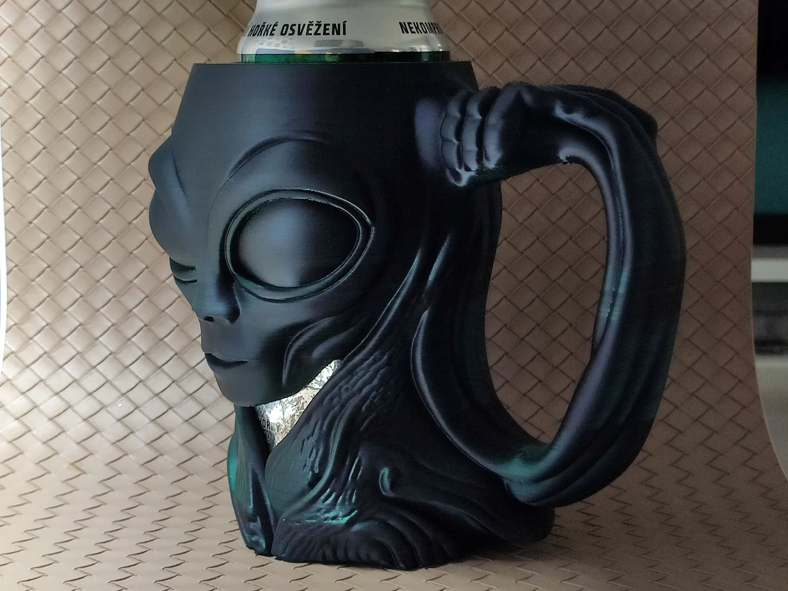 Cái giữ lon hình người ngoài hành tinh xám, vừa lon 0.5L châu Âu. Có thể dùng kèm phôi cho lon 12oz hoặc 330ml mỏng. Khuyến nghị in bằng PLA với layer 0.2mm, 2 tường, 8% gyroid và hỗ trợ cây tự động. Có thể phản chiếu để thay đổi vị trí tay cầm.