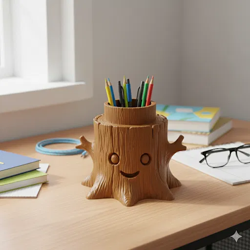 Chỗ cắm viết, bút chì, cọ vẽ hình cây xinh xắn có miệng cười, đặt trên bàn học của bé vừa đẹp vừa gọn. Món đồ trang trí dễ thương cho bàn làm việc.