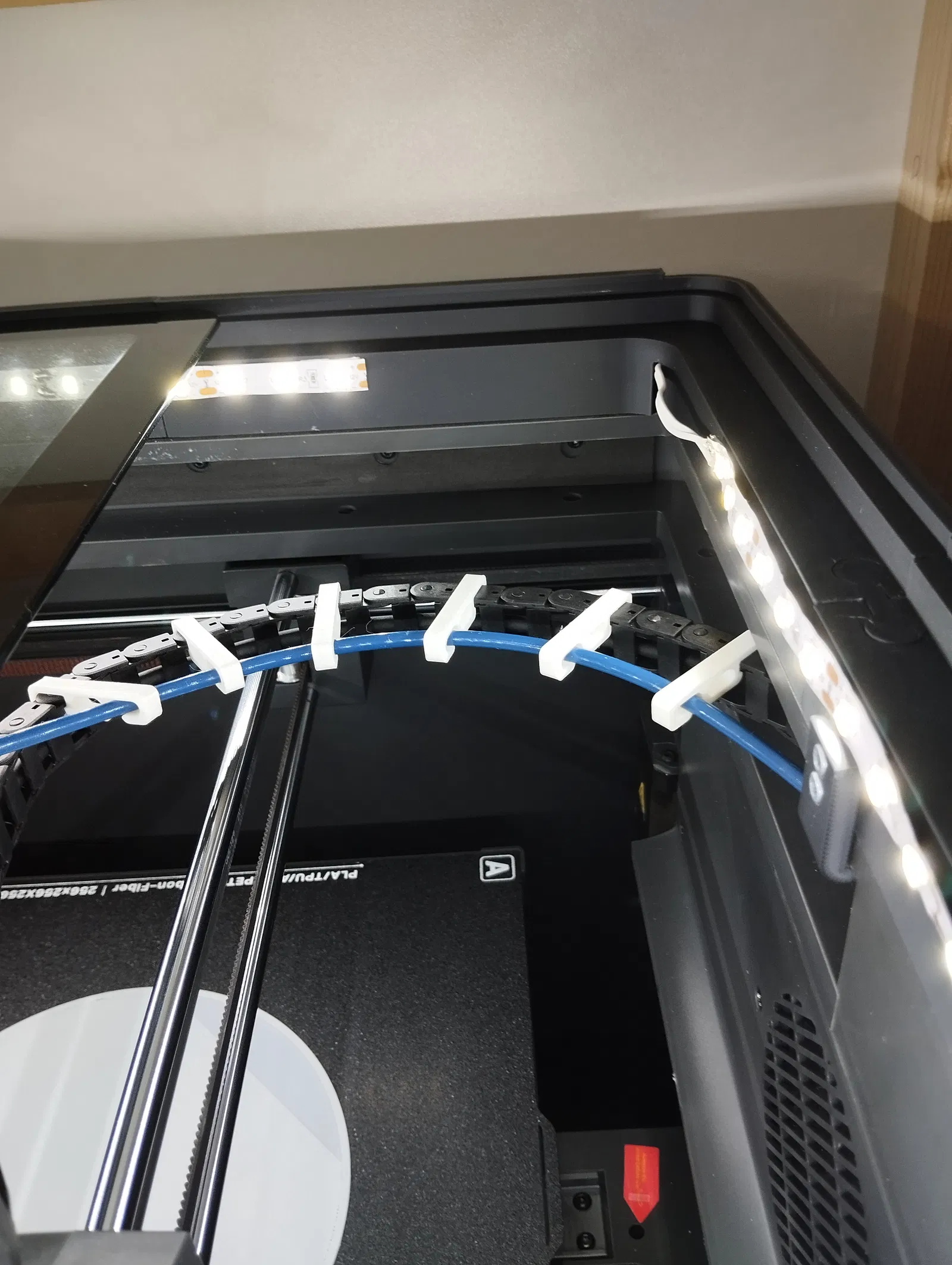 Trên cái Elegoo Centauri Carbon, tui có để ý là cái ống PTFE nó bị gập quá nhiều ở phía trên đầu in, làm cho sợi filament khó đi qua. Tui đã làm (theo ý tưởng của Moto Mongrel trên nhóm Facebook ELEGOO Centauri Carbon Official User Group) một cái “kẹp” để gắn vào cái dây xích cáp và giữ cái ống PTFE cao hơn một chút, nhờ vậy mà cái độ cong của nó rộng hơn.