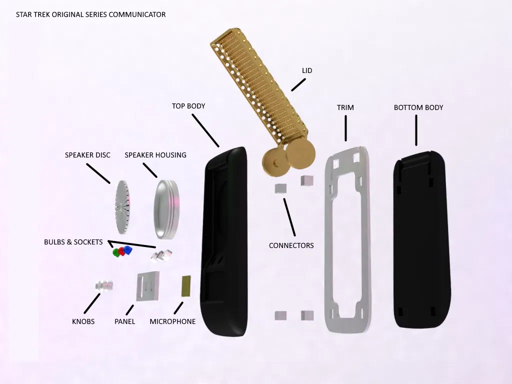 Bộ kit Star Trek TOS Communicator cho fan làm đạo cụ cosplay. Có bản rỗng để gắn linh kiện và bản đặc. Hướng dẫn in chi tiết, lưu ý dùng support cho nắp và thân, và có thể dùng "detect thin walls" cho các chi tiết nhỏ. Có kèm giá đỡ.