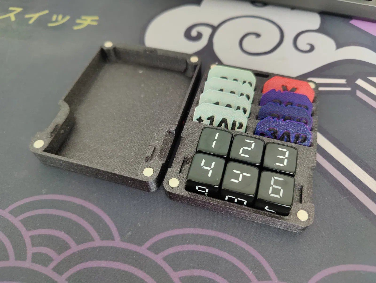 Tui hổng có thích lụm lặt mấy cái token nhỏ xíu đi kèm mấy hộp starter của Gundam Card Game, nên tui mới làm cái hộp nhỏ để đựng mấy viên xúc xắc cỡ 16mm với mấy cái token của tui. Hộp này có kích thước bằng với một cái sleeve của Dragon Shield luôn nha. Khi mở hộp ra, có mấy cái cục nhỏ nhỏ để bạn có thể chồng cái đế lên nắp một cách chắc chắn.
