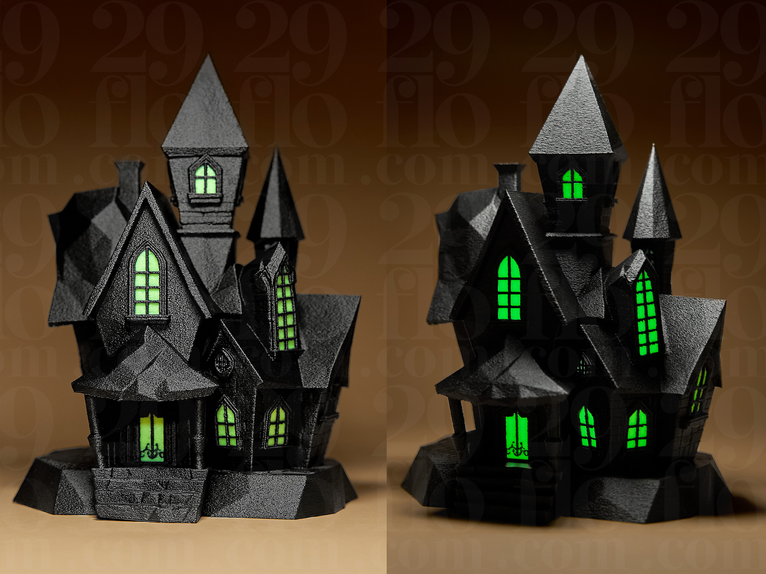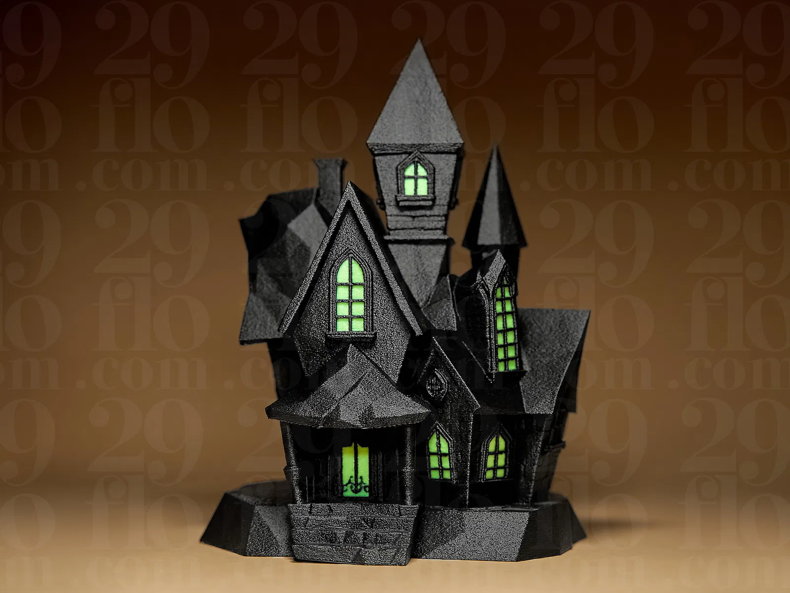 Mô hình Ngôi Nhà Ma Ám phát sáng trong đêm, hoàn hảo cho mùa Halloween. Hướng dẫn in chi tiết bao gồm cài đặt đầu phun, độ dày lớp, ruột, hỗ trợ, loại sợi nhựa (PLA Matte Charcoal, PLA Glow Green) và hiệu ứng vỏ sần (fuzzy skin). Đảm bảo bám dính tốt vào bàn in để có kết quả tốt nhất.