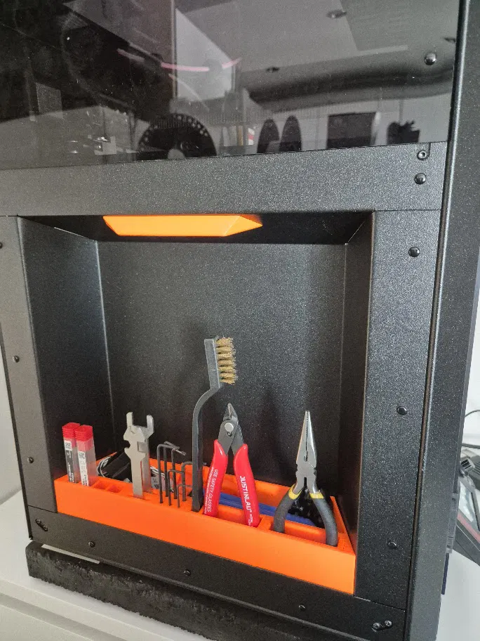 Ban đầu được thiết kế để chứa 3 tấm in, hàng này chứa một ngăn dài duy nhất mà bạn có thể tùy chọn thay thế bằng một đế phẳng ở giữa được in bằng vật liệu FLEX, mở rộng không gian lưu trữ cho các bộ phận nhỏ và dụng cụ như tua vít, gia tốc kế, dao gọt v.v.