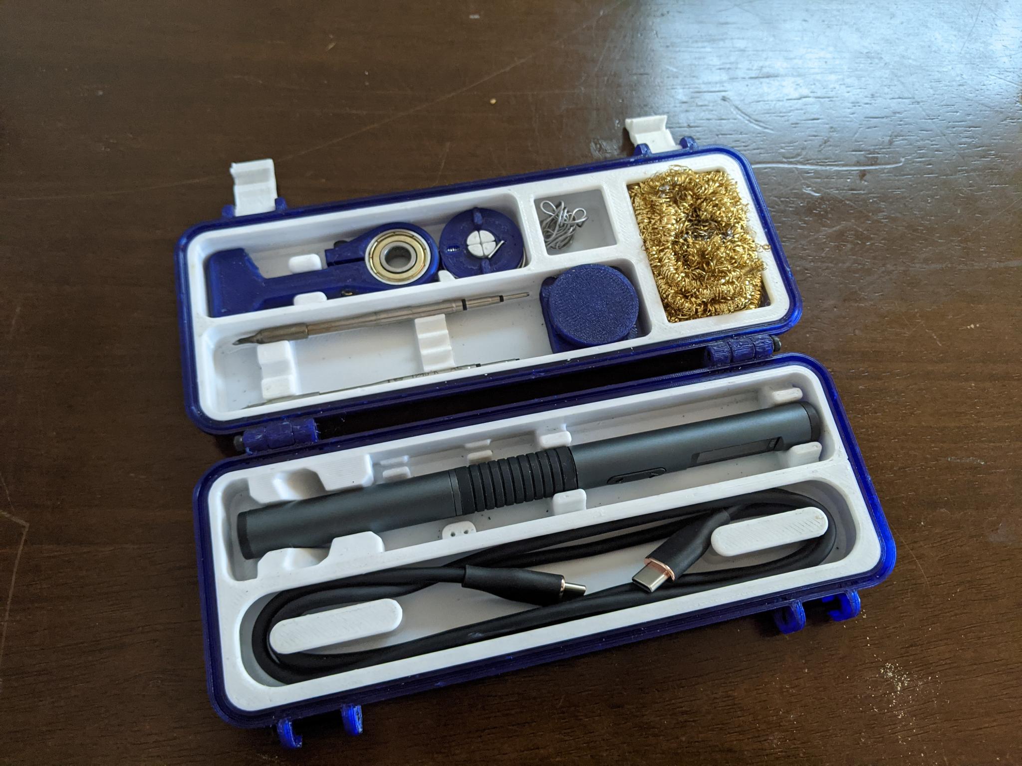 Đã sửa đổi các khay đựng vỏ cứng Alientek của MailBox để thêm không gian cho mỡ hàn ở phía trên và cáp USB ở phía dưới. Có chỗ cho ba mũi hàn, chúng có vẻ khớp vào vị trí khá tốt. Tôi đã bao gồm tất cả các mô hình tôi đã sử dụng để làm vỏ và bao gồm giá hàn và lọ mỡ hàn tôi đã sử dụng làm tệp được phối lại để bạn có thể lấy các tệp gốc. Cuộn thiếc hàn đến từ mô hình hộp Pinecil không vỏ cứng ban đầu.