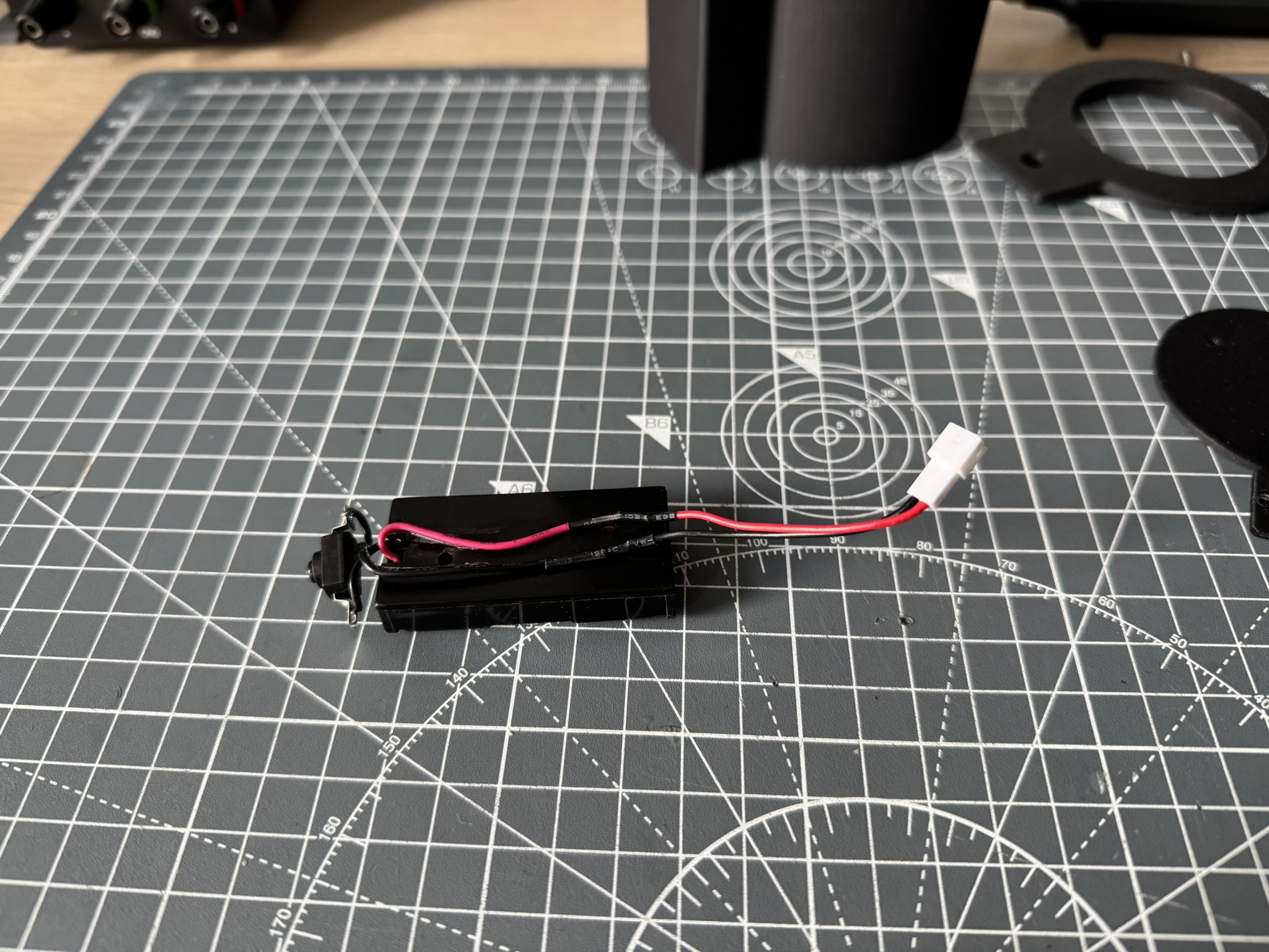 - Hàn nút nhấn vào một trong hai cực ra của hộp pin để tạo mạch hở/kín, nên đi dây ngắn từ hộp pin tới công tắc để nó nằm gọn trên đỉnh.