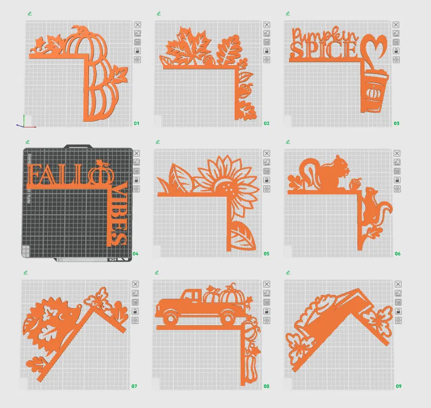 Có 9 mẫu khác nhau cho góc cửa đơn giản, một màu cho mùa Thu. Bạn có thể chỉnh kích thước XY tùy thích nhưng độ dày Z tối thiểu 2mm là hợp lý nhất. Thử nghiệm với các loại đĩa in, hoa văn trên và dưới, hoặc sử dụng hai loại sợi in để thay đổi diện mạo. Không có hướng dẫn in đặc biệt nào, nhưng hãy đảm bảo in úp mặt có chữ xuống nếu bạn muốn thấy mặt đáy/mặt đĩa khi treo sản phẩm theo chiều thẳng đứng.