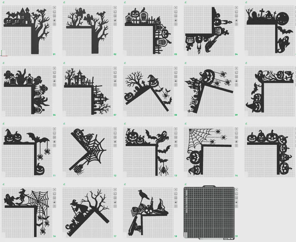 Bộ sưu tập gồm 18 mẫu góc trang trí cửa độc đáo cho mùa Halloween, mang đến không khí rùng rợn và bí ẩn. Dễ dàng in với một màu hoặc tùy chỉnh với đa dạng cách thức để tạo hiệu ứng ấn tượng.