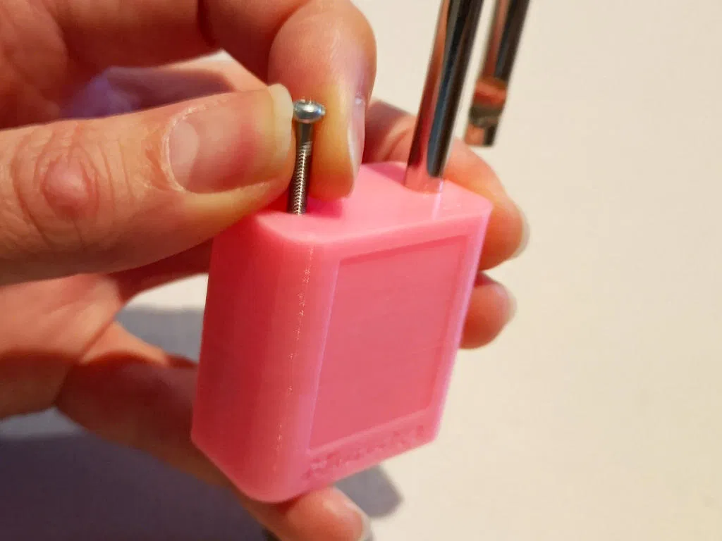 - Mở khóa, đặt vít vào lỗ càng khóa và vặn chặt lại.