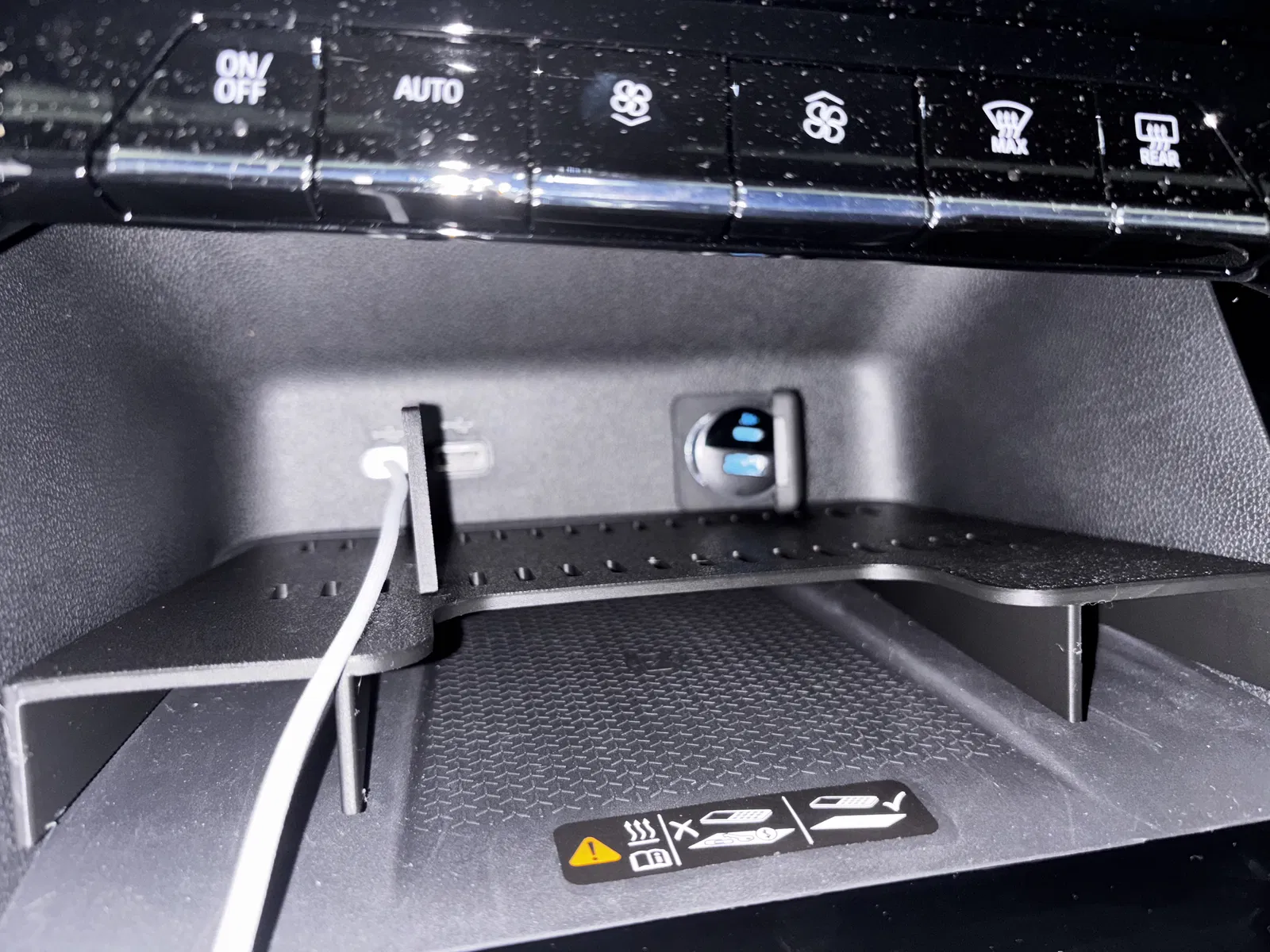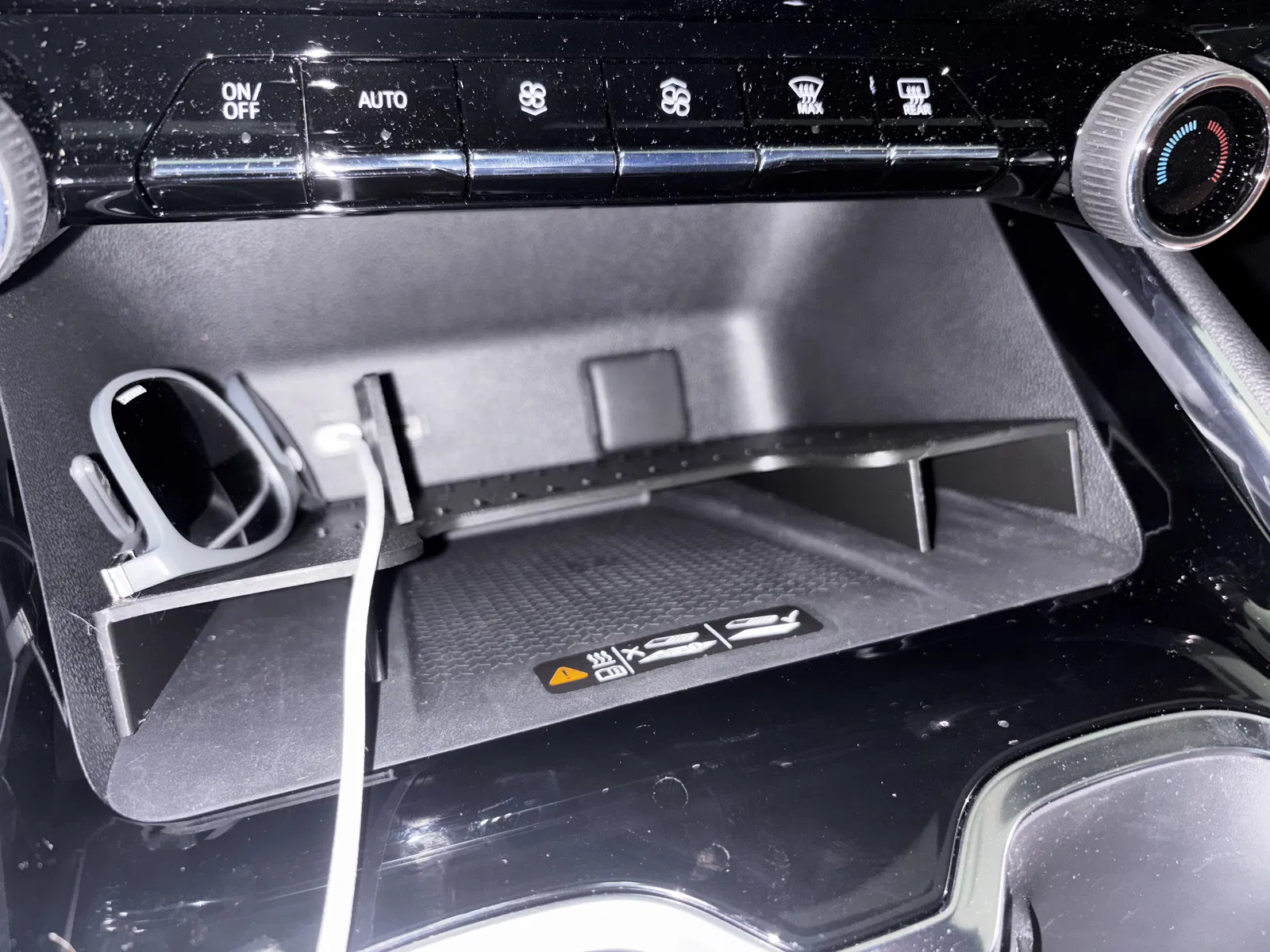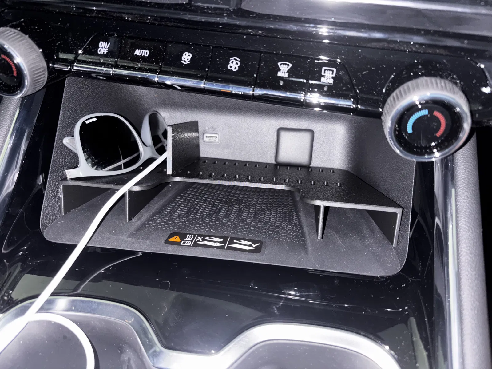 Kệ nhỏ cho hộc đựng điện thoại/hộc sạc Qi trên Chevy Traverse thế hệ thứ 3 (2024, 2025, 2026). Các cổng USB và ổ cắm 12V vẫn có thể truy cập được khi lắp kệ vào. Có các khe rãnh để chia ngăn điều chỉnh được cho kính râm, v.v.