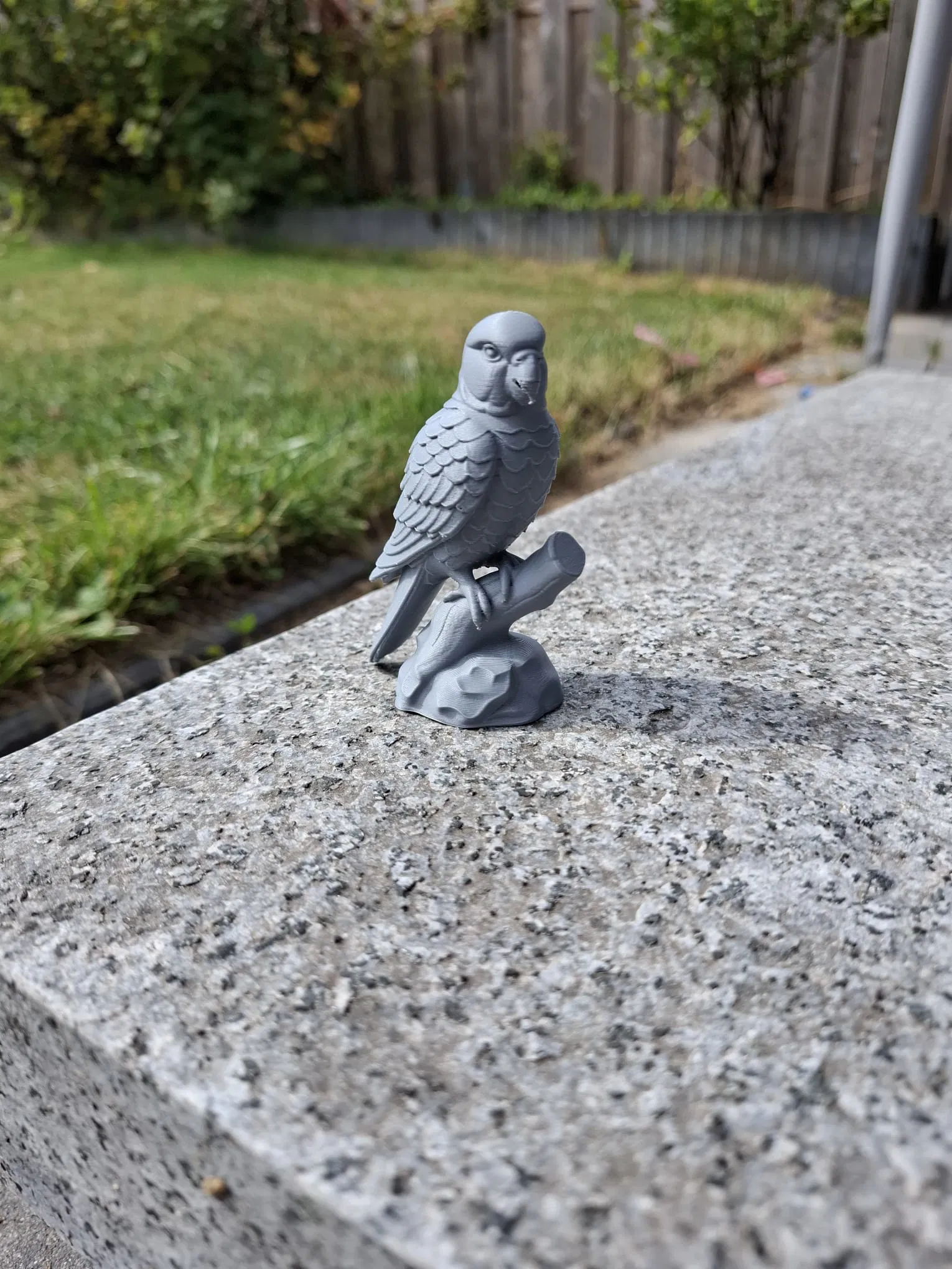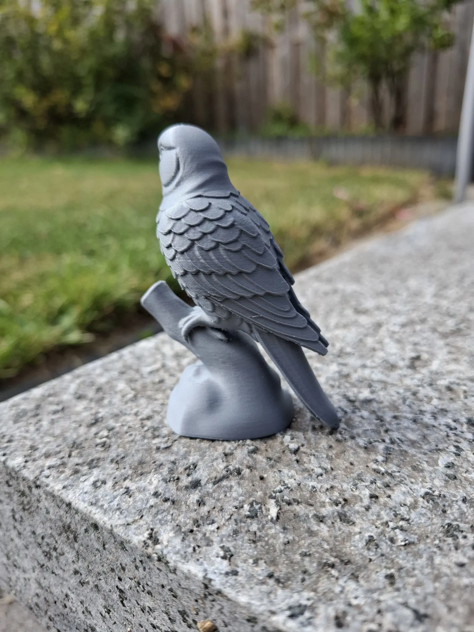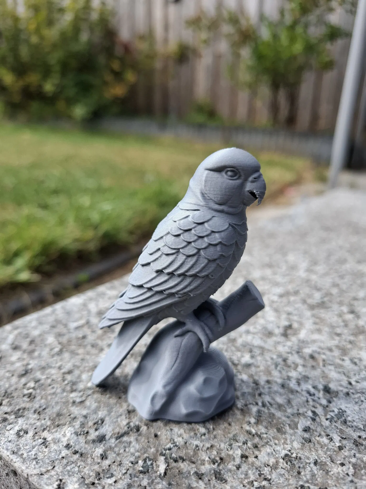 Đậu trên cành cây với đế đá, chú vẹt này có bộ lông được điêu khắc tỉ mỉ, mỏ gọn gàng và tính cách tò mò—sẵn sàng tô điểm cho kệ sách, chậu cây hay bàn làm việc tại nhà của bạn.