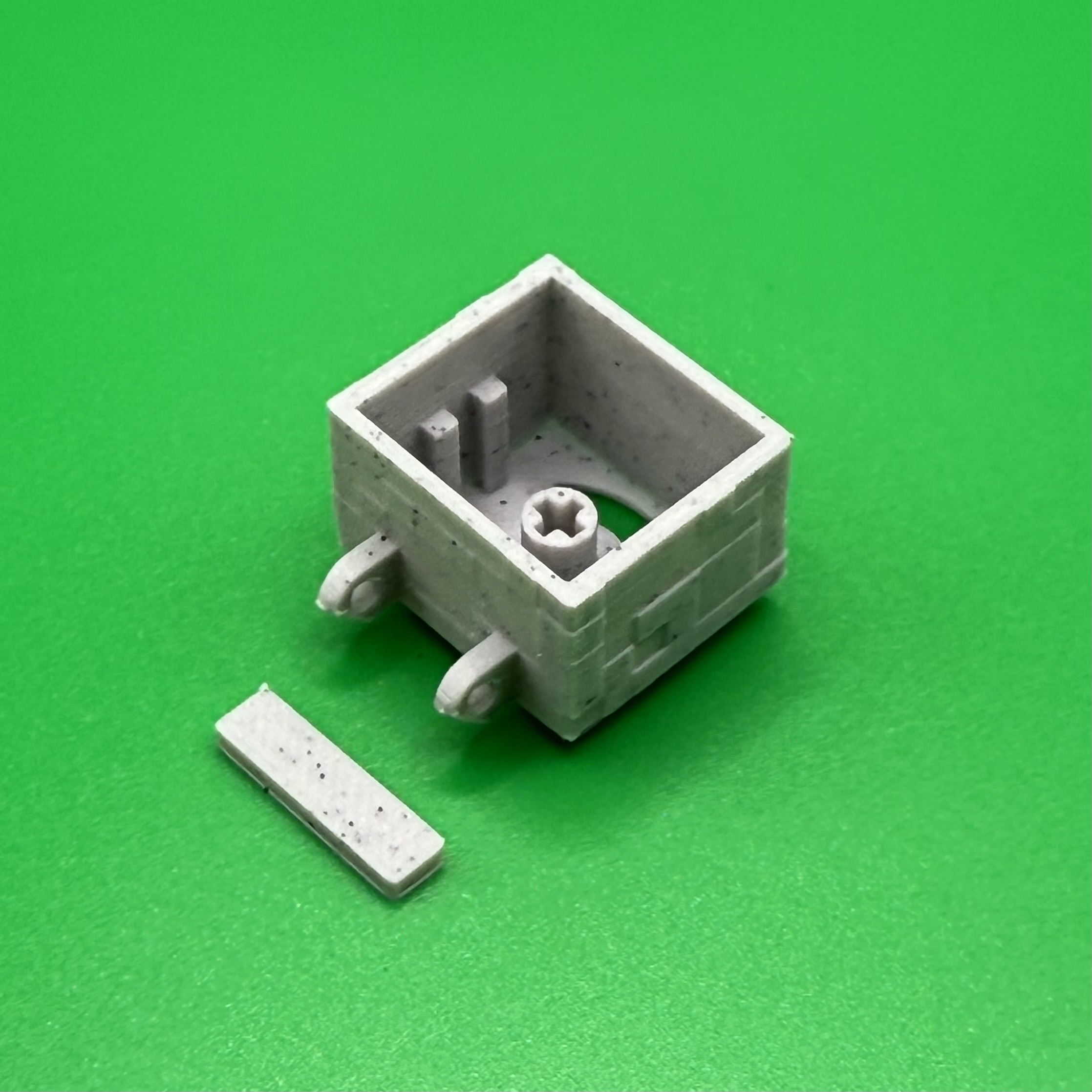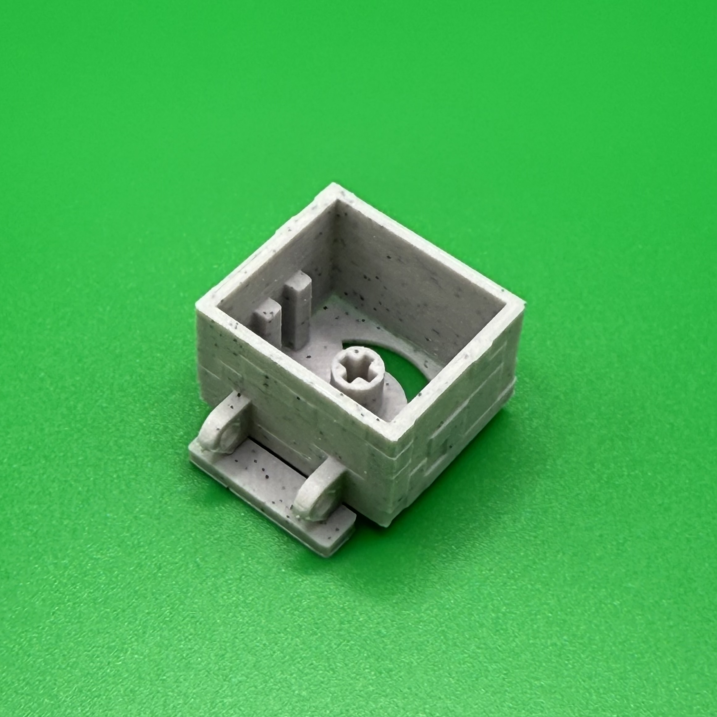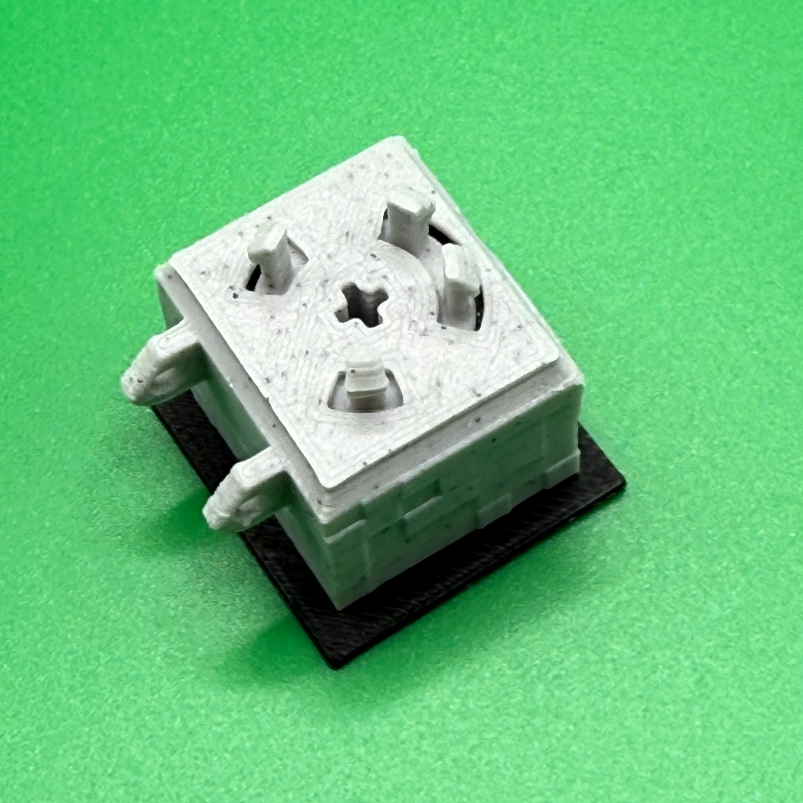 Bước 8: Lắp switch bàn phím cơ vô đầu. Lưu ý hướng lắp. Piston là hình chữ nhật và nên hướng về hai thanh dẫn hướng. Switch sẽ không vô nếu xoay 90°/270° so với hướng này.