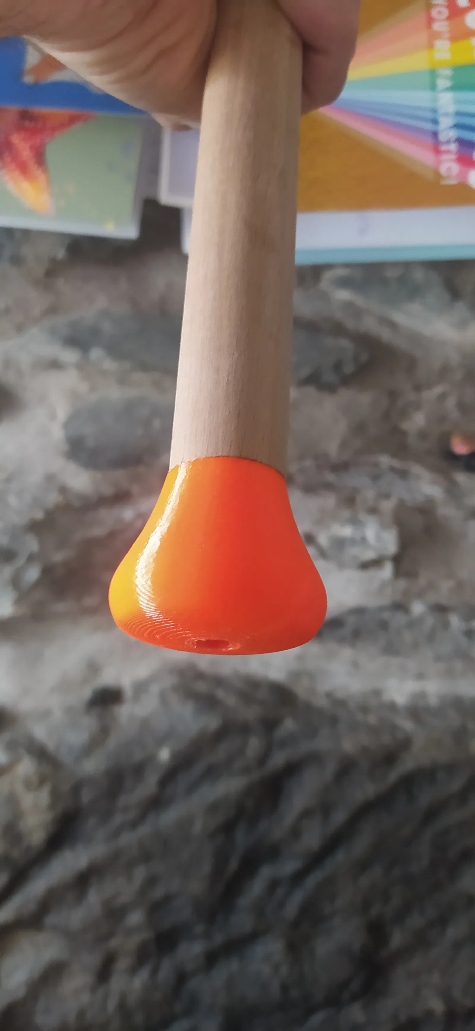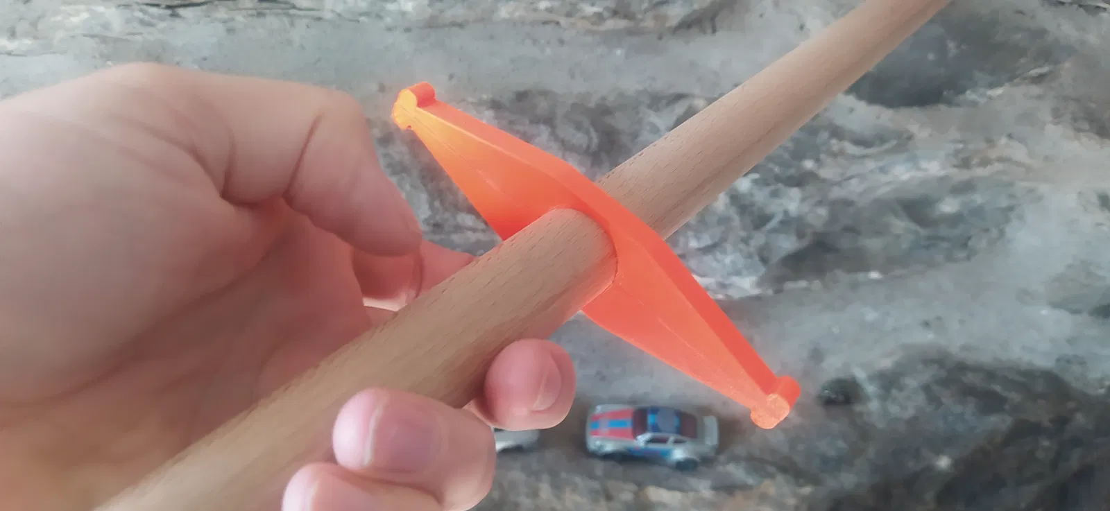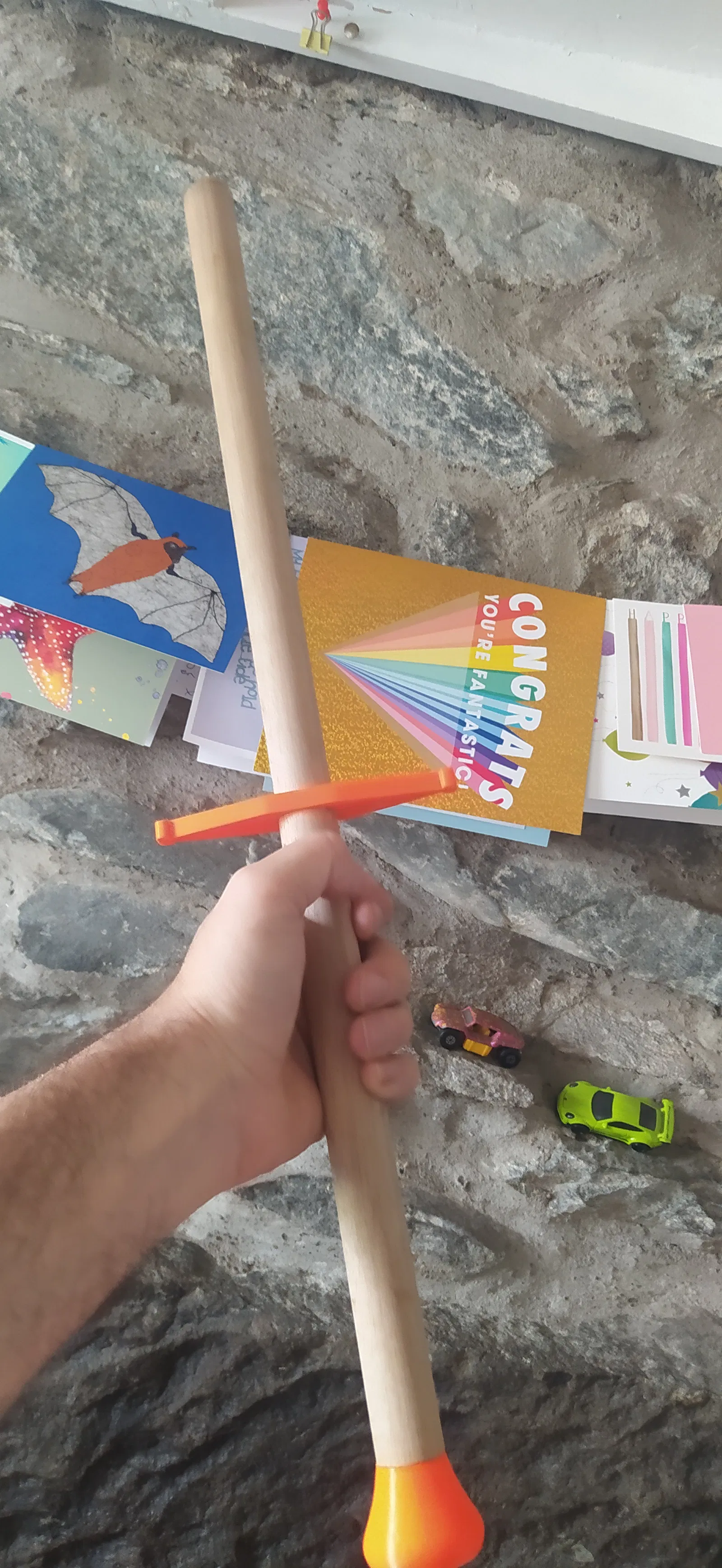 Dạo gần đây tui mới bắt đầu tập HEMA (Historical European Martial Arts), mà chủ yếu là tập kiếm dài kiểu Đức. Nhà tui thì nhỏ, trần thấp nên xài mấy cây kiếm dài cả mét bằng nhựa hay kim loại là không ổn rồi. Ban đầu tui xài một khúc gỗ tròn đường kính 25mm, nhưng mà nó không có định hướng lưỡi kiếm hay định hướng phần kiếm hai tay nên tui muốn cải thiện nó. Cái mô hình kiếm hai tay này cho phép giữ lại được chút định hướng, tui in nó làm 2 phần trên máy Mini+ bằng nhựa PETG của Prusament rồi dán lại với nhau. Phần chuôi kiếm tui cũng dán keo rồi thêm con ốc nữa cho chắc ăn là nó nằm ở giữa luôn. Ở đầu kia của khúc gỗ 25mm, tui khoan lỗ và nhét mấy cục chì vô để trọng tâm nó cách phần kiếm hai tay khoảng 6cm. Đương nhiên là nó nhẹ hơn kiếm tập bằng nhựa hay kiếm Feder bằng thép rồi, nhưng mà trọng tâm nó tương tự vậy nên cũng tập luyện tương đối chính xác được.