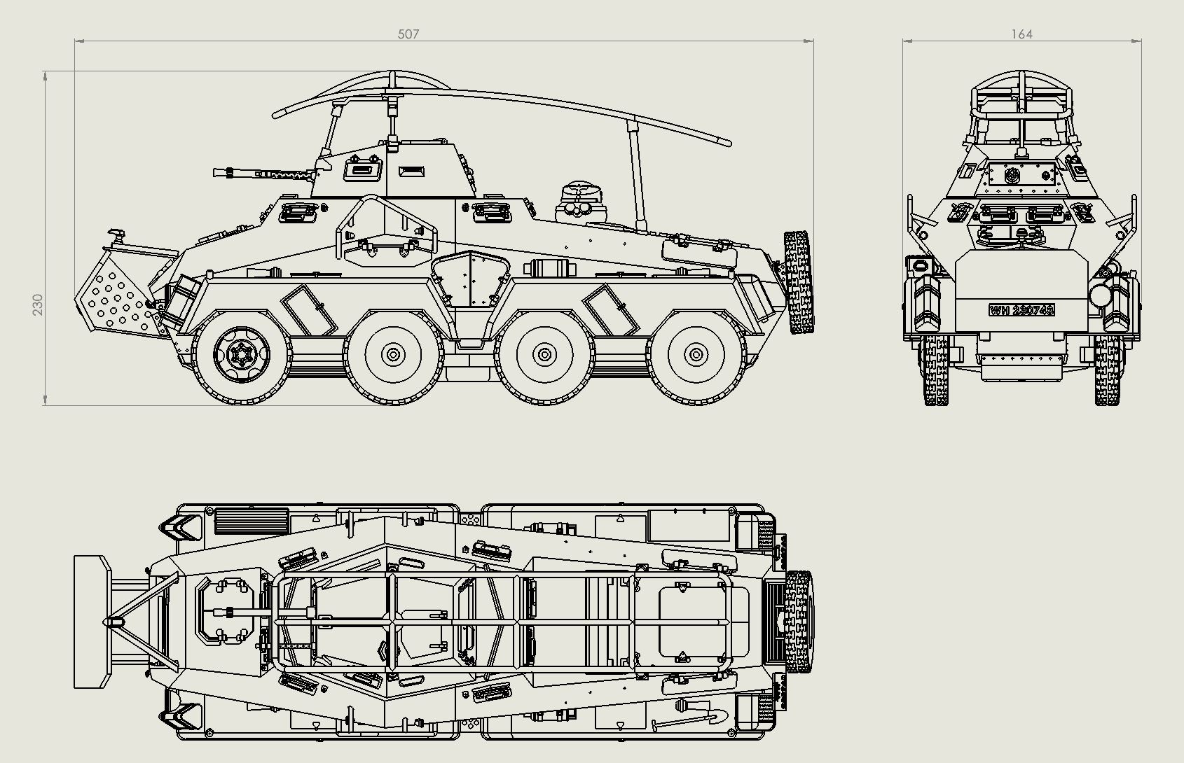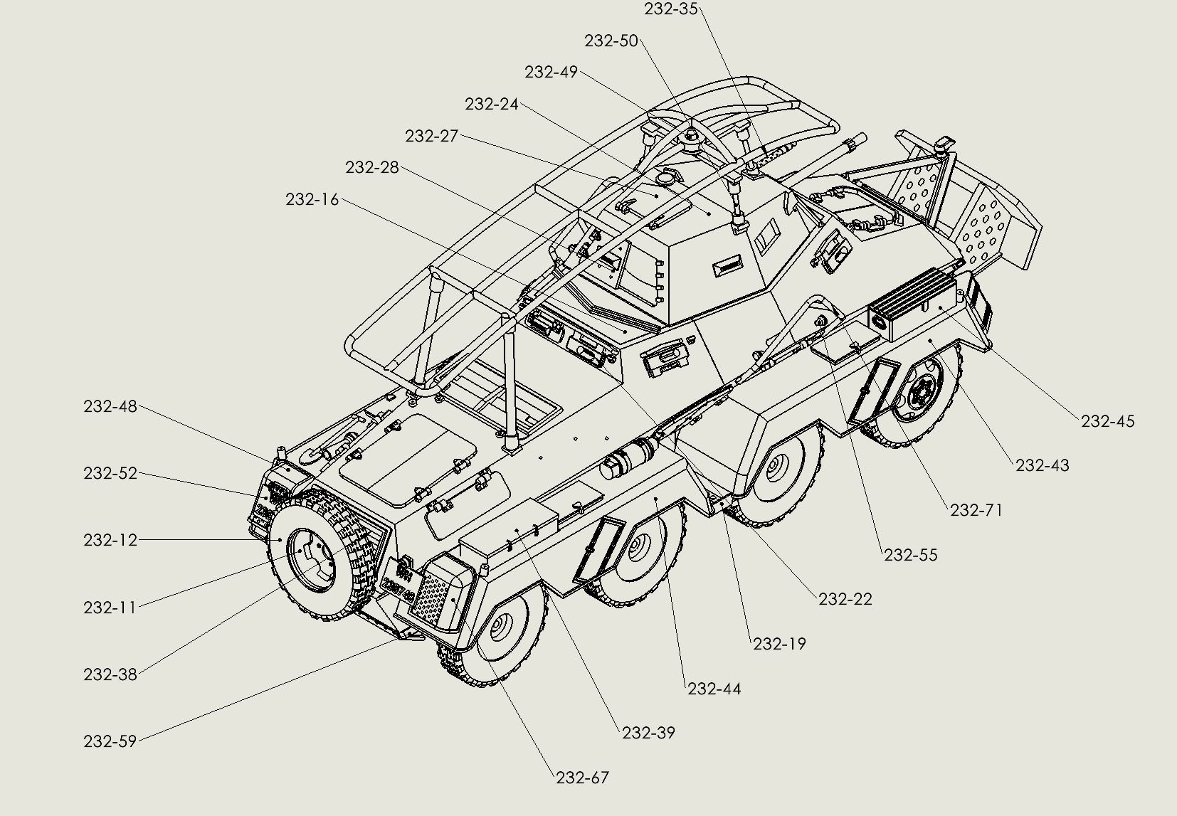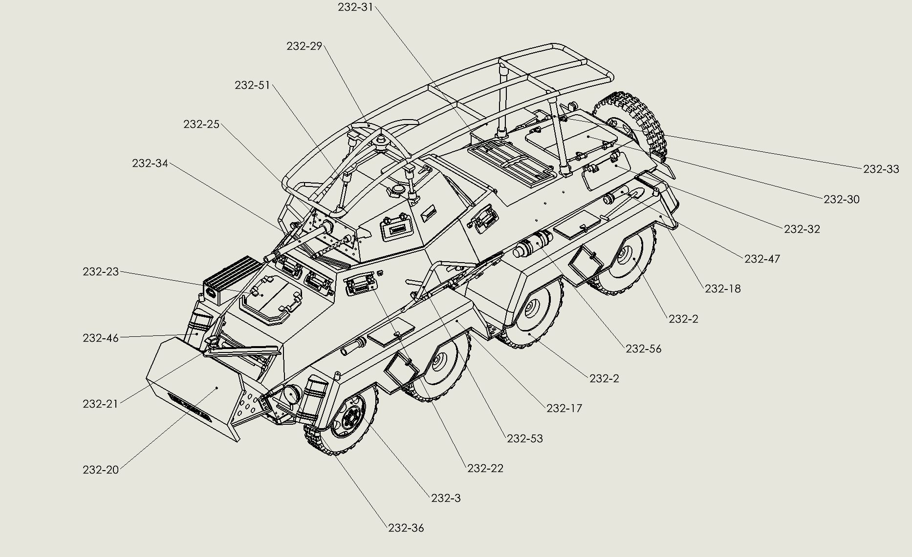 Sd.Kfz. 232 là mẫu xe trinh sát bọc thép 8 bánh lái của Đức Quốc xã. Mô hình này tái hiện chân thực cơ chế lái độc đáo, nơi 8 bánh xe có thể điều khiển theo cặp. Đặc biệt, tháp pháo được trang bị ăng-ten lớn với giá đỡ chữ L đặc trưng. In bằng PLA, yêu cầu khoảng 1 mét dây 1mm cho bản lề cửa và hệ thống lái.