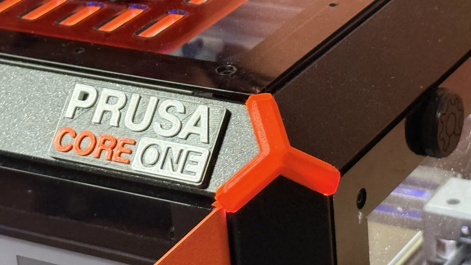 Để dễ thấy hơn, cái bản mẫu tui in màu cam. Nếu in bằng PETG đen thì mấy cái nắp góc này sẽ hòa hợp với kiểu dáng của vỏ Prusa Core One và gần như tàng hình luôn.
