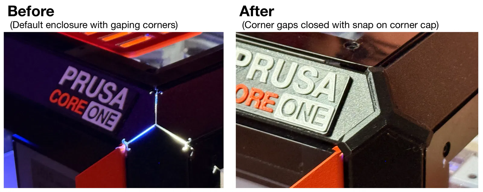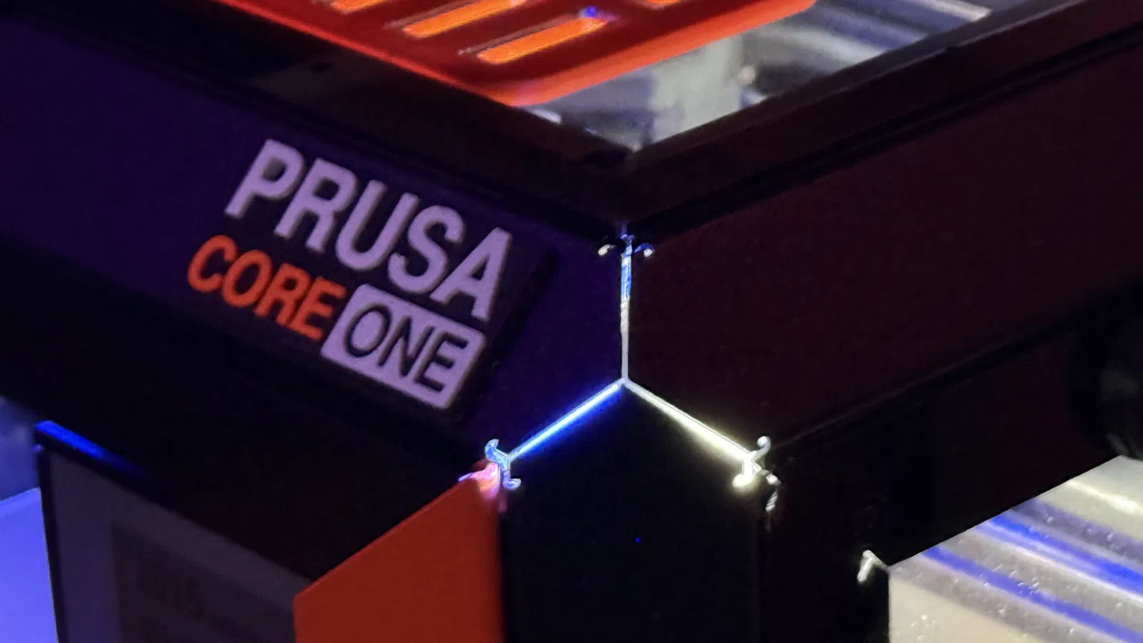 Cái vỏ của Prusa Core One tuy đẹp nhưng chưa được kín khí cho lắm, nếu bạn gắn đèn LED bên trong thì hơi nóng và ánh sáng sẽ lọt ra ngoài qua mấy khe hở ở góc, chỗ các thanh nhôm gặp nhau.