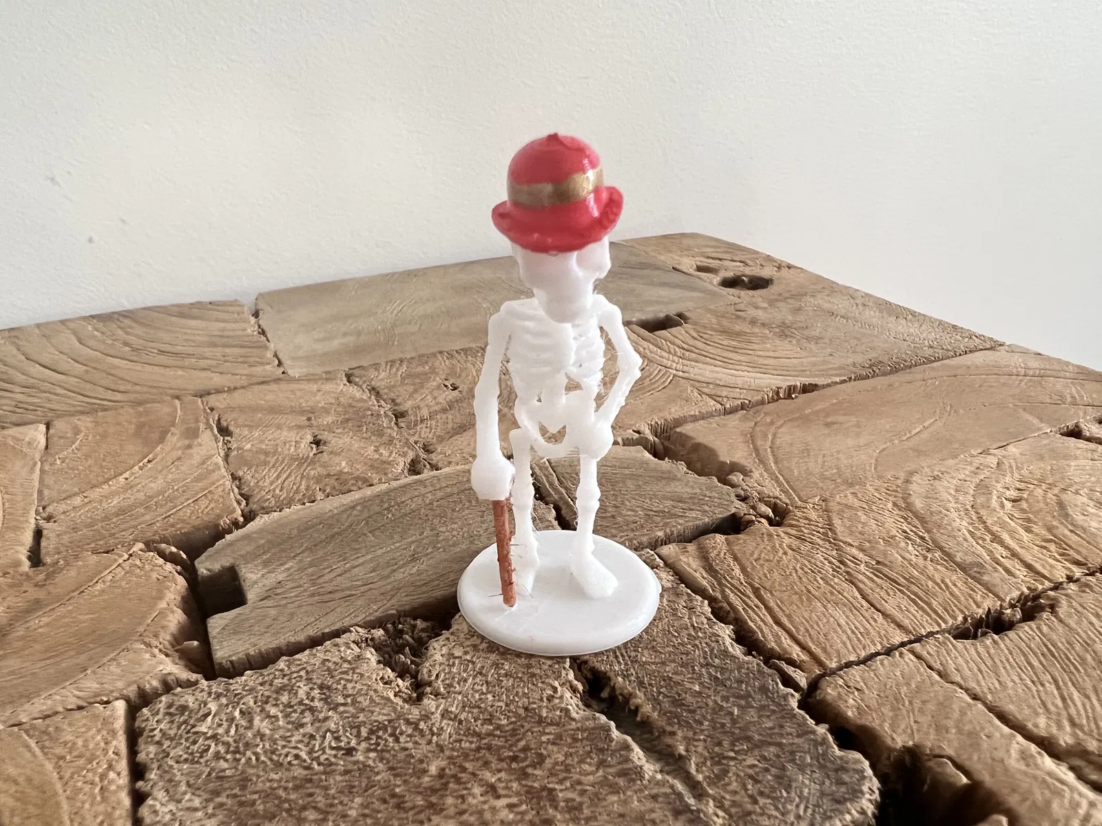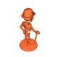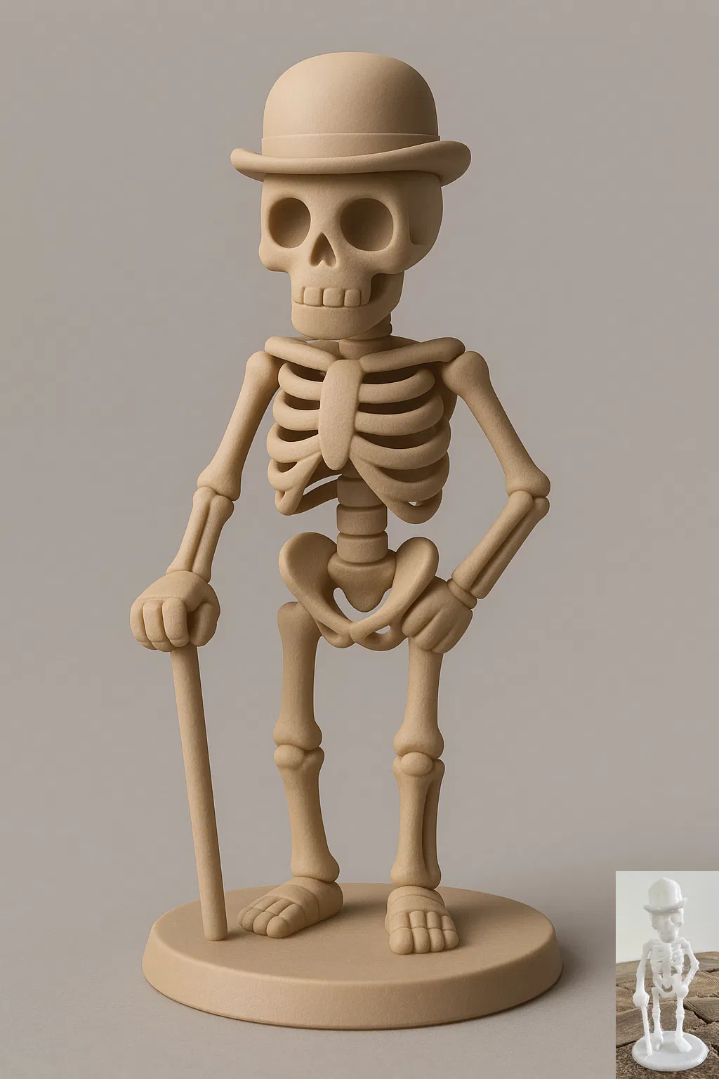 Mô hình 3D bộ xương cũ được tạo bởi AI, thích hợp làm đồ trang trí, tượng, hình nhỏ. Mô hình có mũ và gậy, mang phong cách cổ điển.