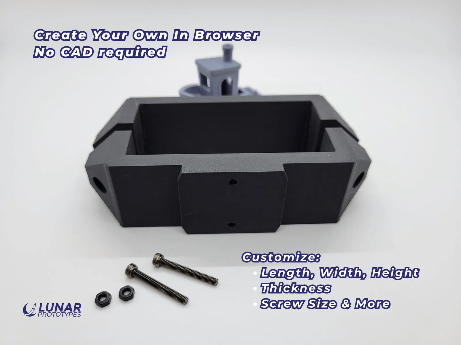 Điều chỉnh kích thước, chiều cao, khoảng hở và nhiều hơn nữa để bản in ra đúng như bạn mong muốn. Tuỳ chỉnh trên website Lunar Prototypes. Không cần Slicer hay CAD.