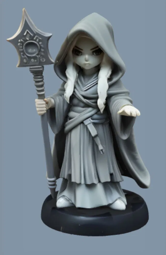 Nữ Pháp Sư Trùm Khăn Bí Ẩn: Miniature D&D AI tạo hình, hoàn hảo cho D&D, Pathfinder, ttrpg. Nhân vật pháp sư với quyền trượng, áo choàng bay bổng. Dễ sơn, file STL tối ưu, thích hợp cho mọi chiến dịch. Lỗi nhỏ ở mặt và tay.
