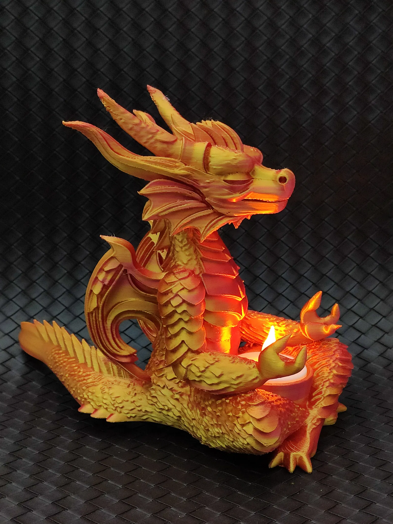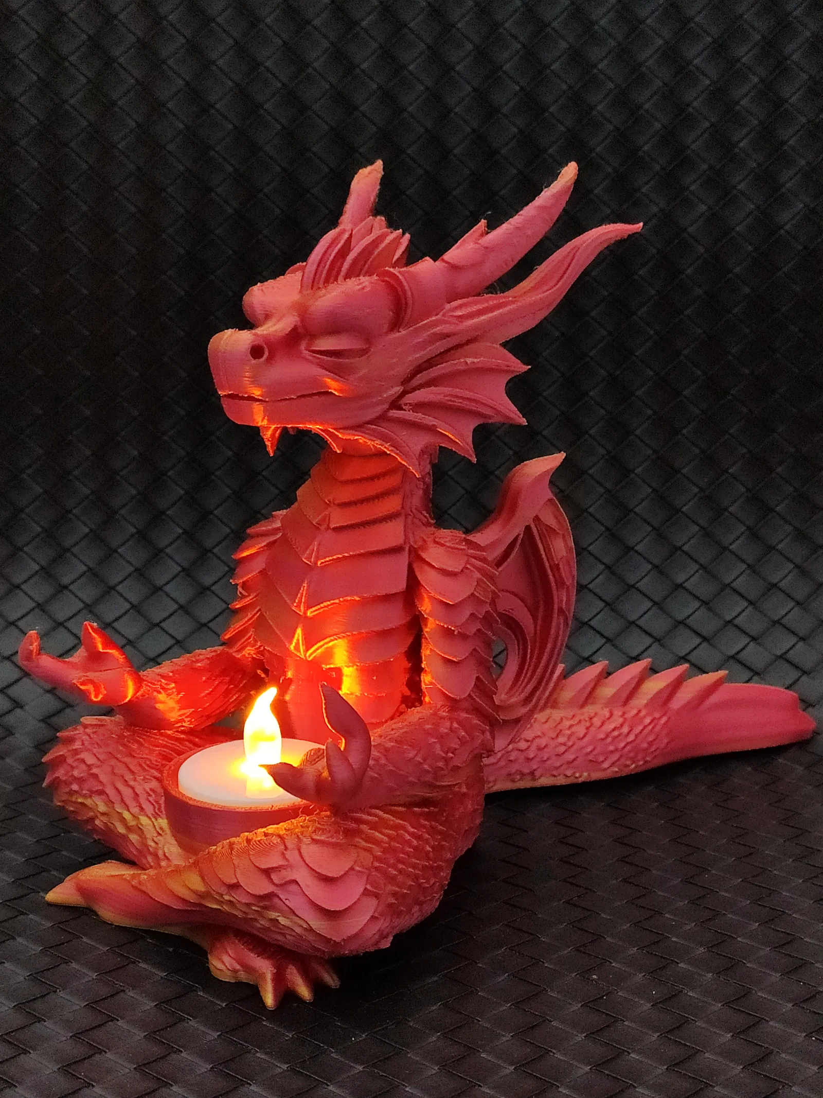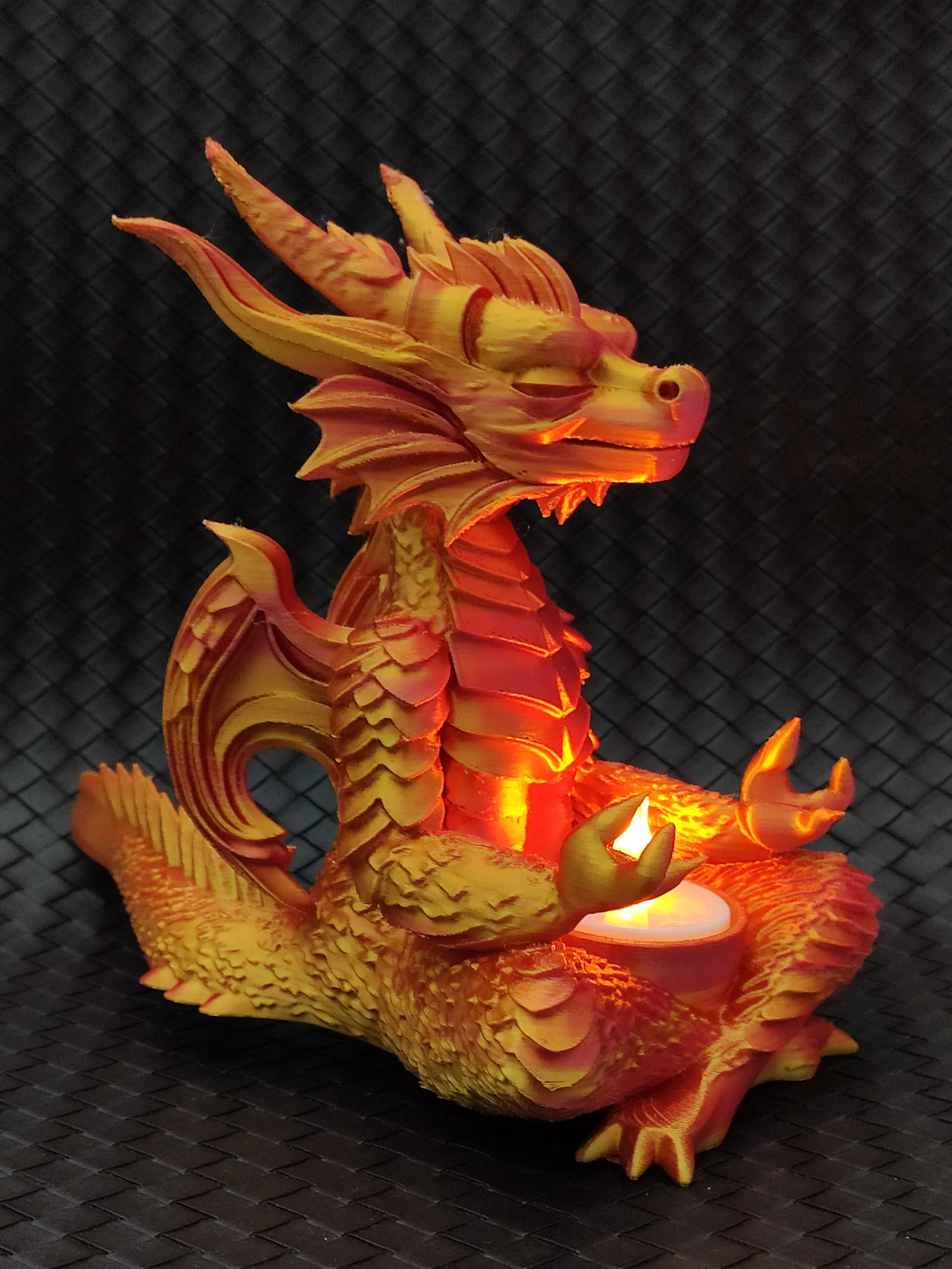 Chân nến LED hình Rồng Thiền Định. Có thể tùy chỉnh kích thước, phù hợp với nến tealight tiêu chuẩn 37mm. In bằng PLA với cài đặt lớp 0.16mm, 2-3 lớp tường, 10% gyroid, và supports dạng cây.