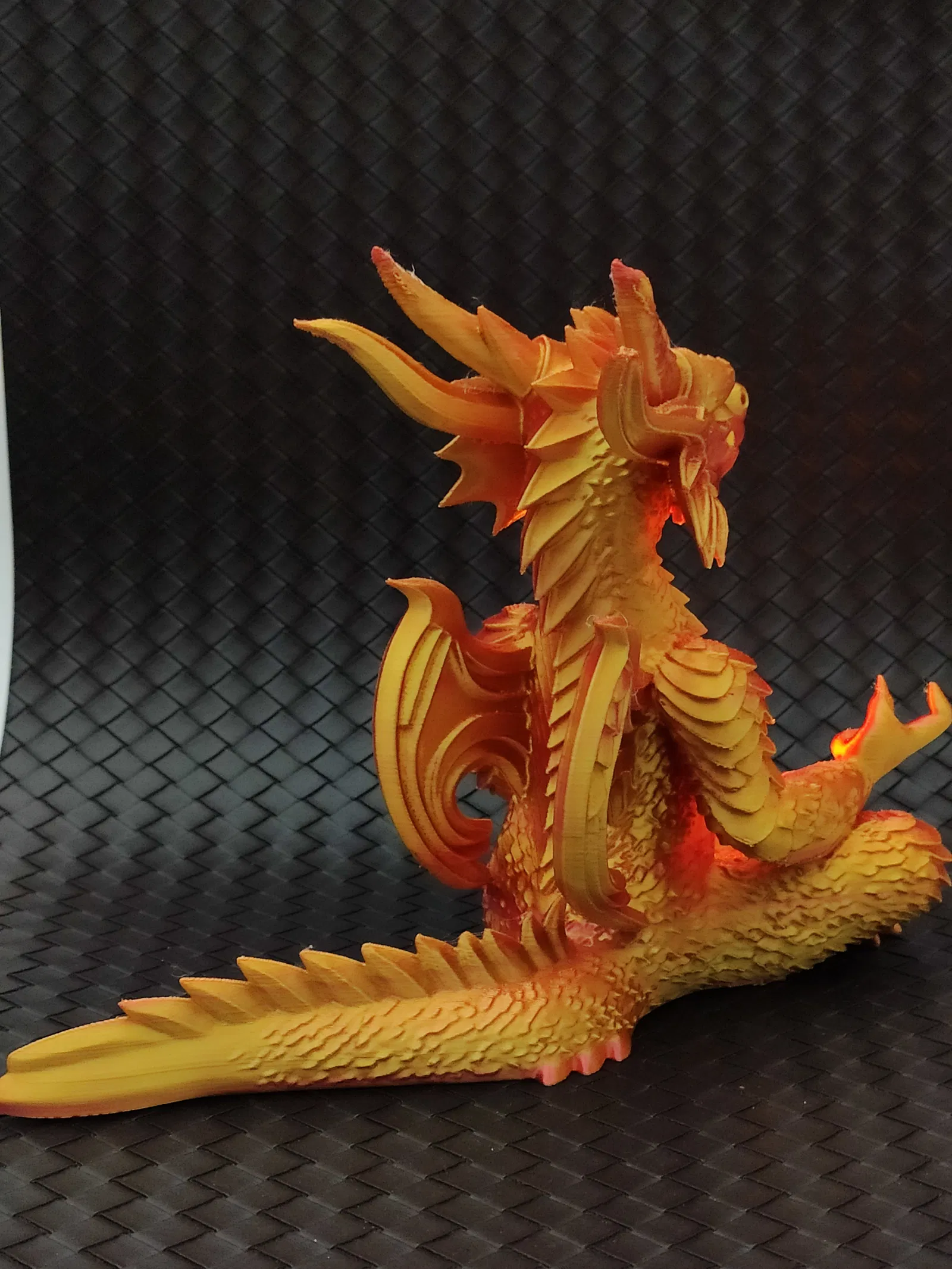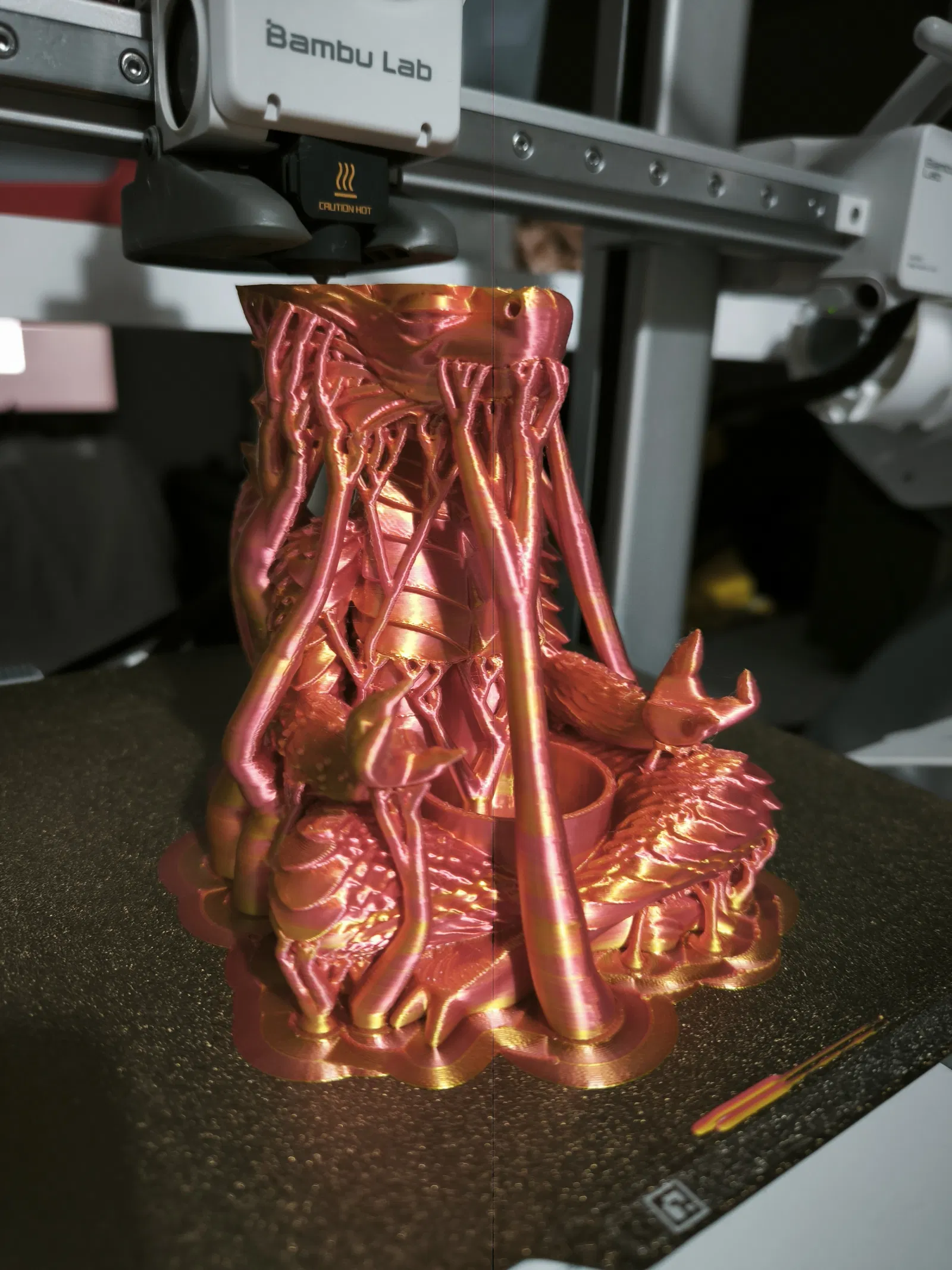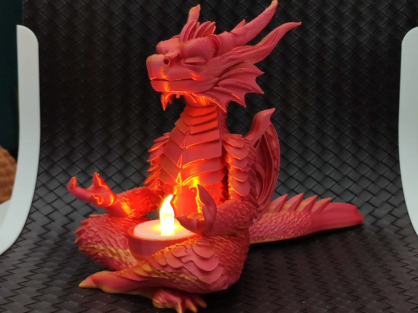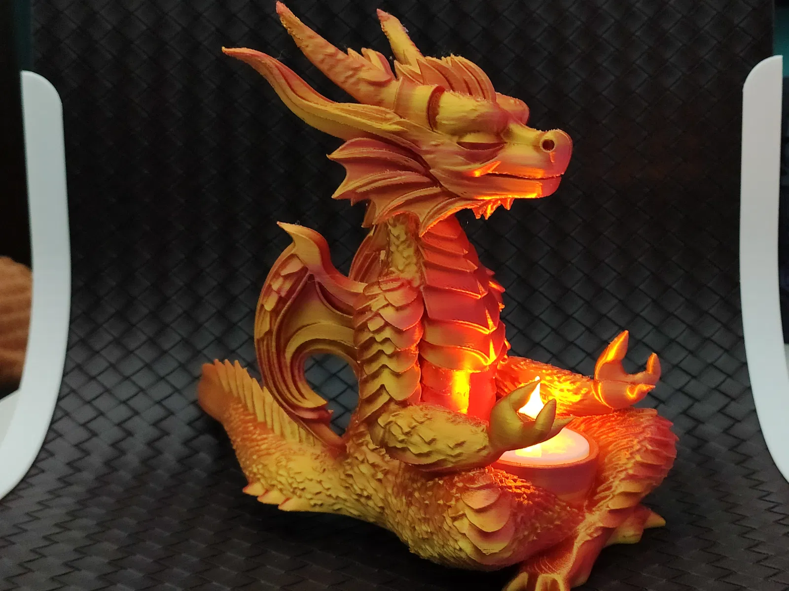 Chân nến LED hình Rồng Thiền Định. Có thể tùy chỉnh kích thước, phù hợp với nến tealight tiêu chuẩn 37mm. In bằng PLA với cài đặt lớp 0.16mm, 2-3 lớp tường, 10% gyroid, và supports dạng cây.