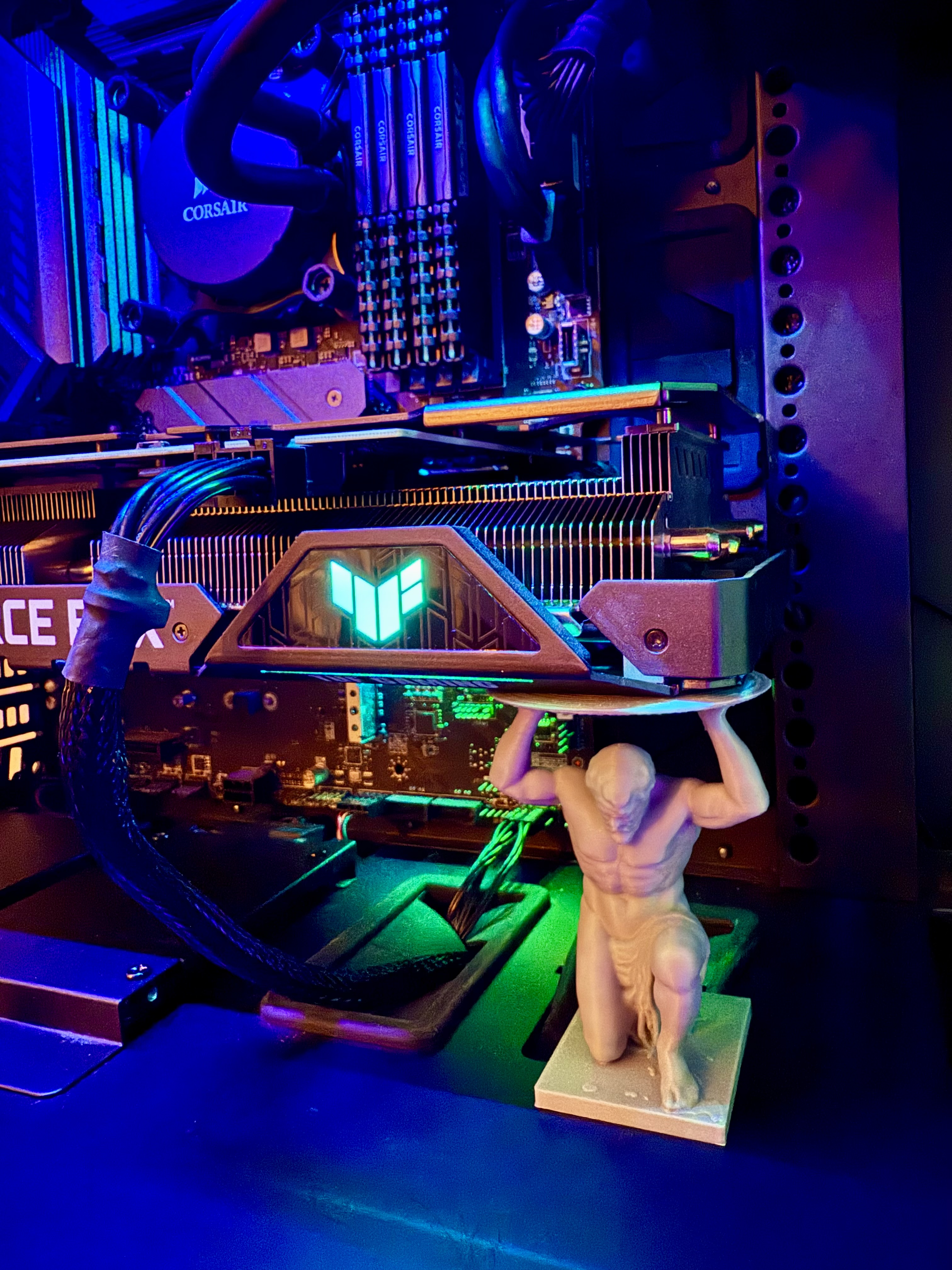 Trang bị cho dàn PC của bạn giá đỡ GPU thiết kế Atlas độc đáo. Vừa chống xệ card hiệu quả, vừa là điểm nhấn trang trí thần thoại bắt mắt cho case gaming. Dễ lắp đặt, hỗ trợ card nặng. In bằng PLA/PETG.