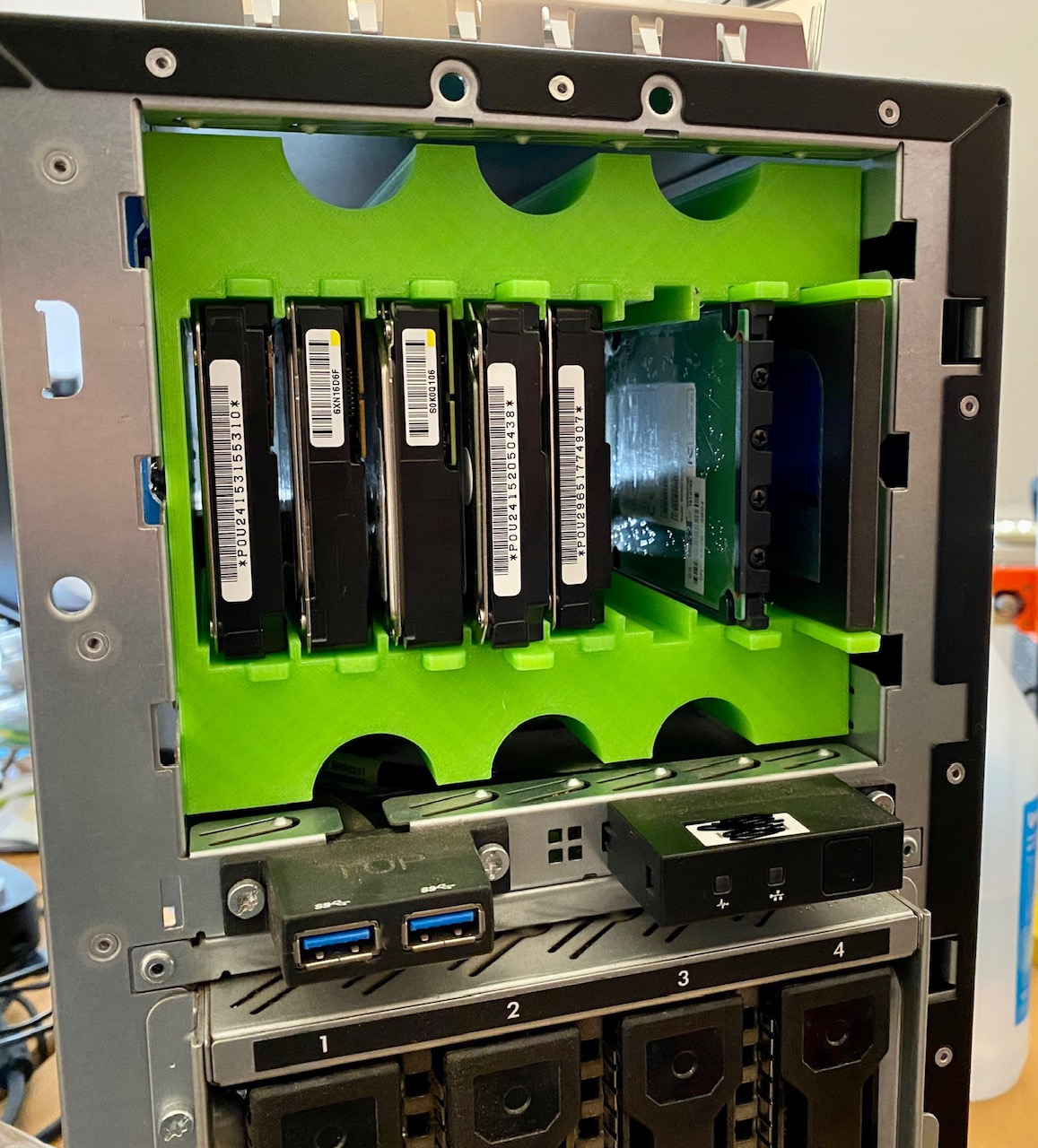 Cần một cái khung để chứa 8 ổ SSD/HDD 2.5" vào vị trí 5.25" trên server. Thiết kế có thêm chỗ gắn quạt 120mm và yêu cầu ấn nhẹ ổ cứng. Rất phù hợp cho nhu cầu lưu trữ của phòng lab.