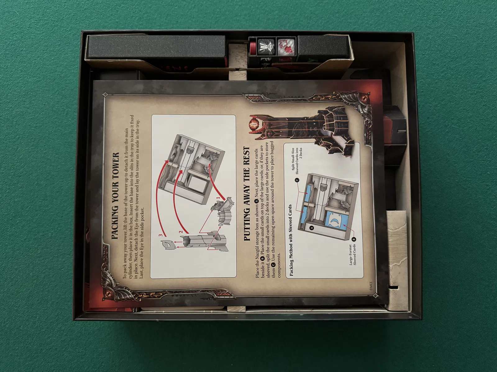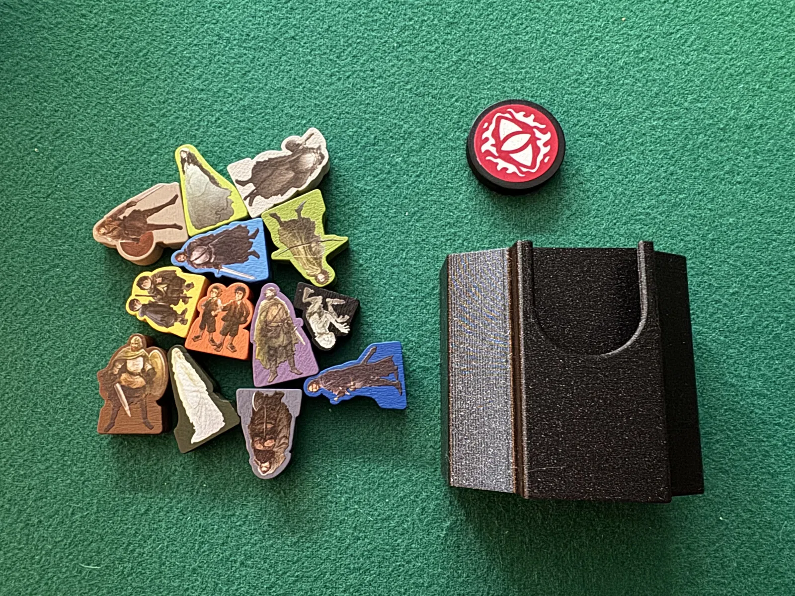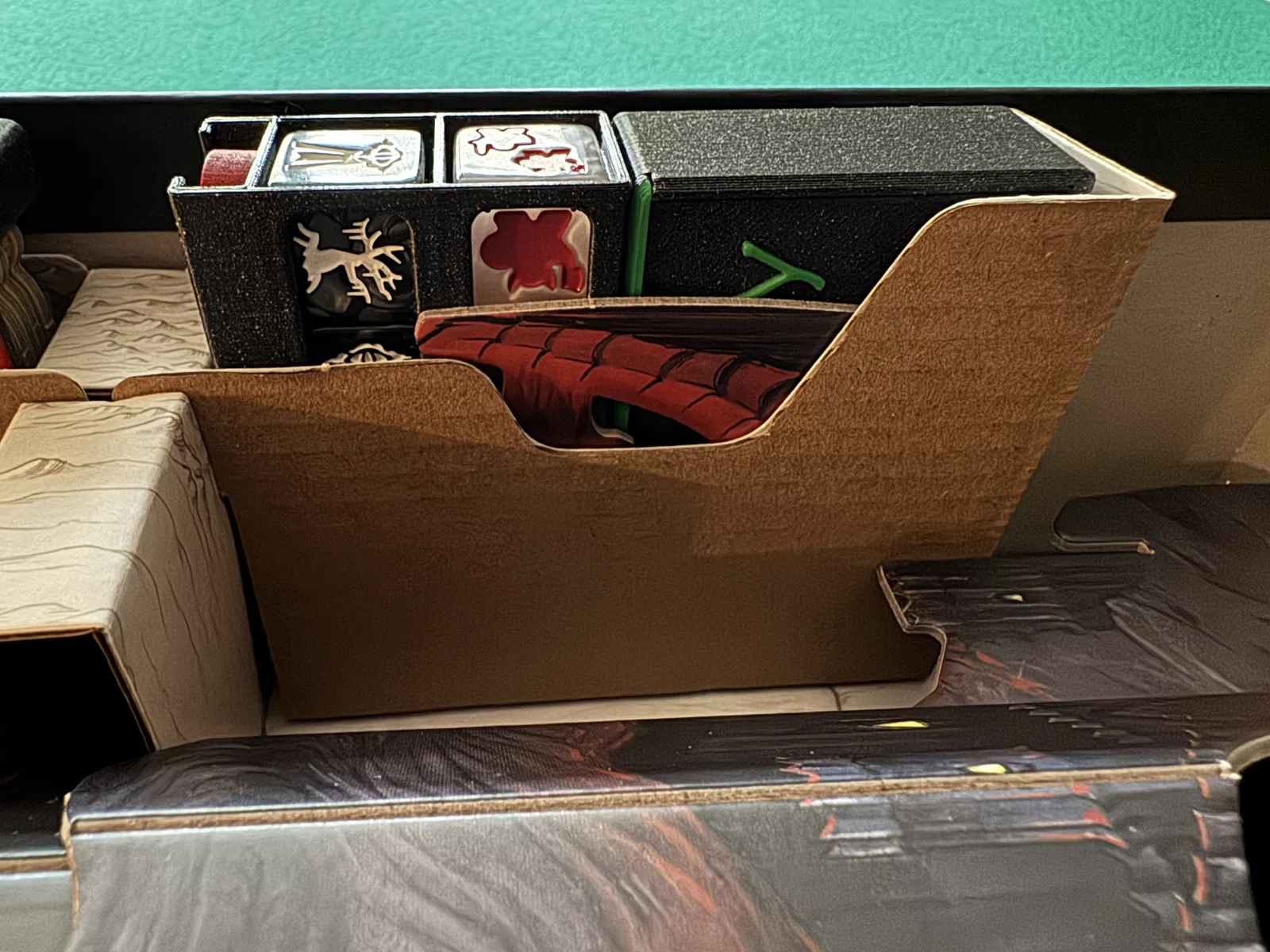 Hộp đựng token với các quân bóng tối được thiết kế để đặt cạnh bàn chơi, sắp xếp các token và quân lính mà không được đặt trực tiếp trên bàn. Các hộp khác chứa các thành phần được đặt trên bàn khi setup, và có thể cất lại vào hộp để tiết kiệm không gian sau khi setup.