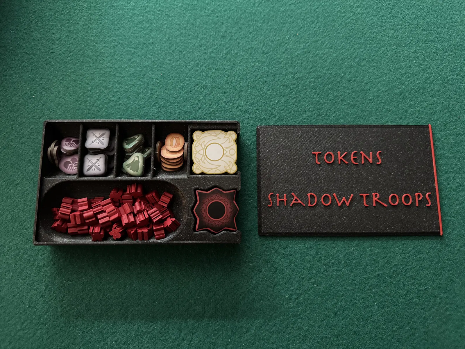 • TokenBox: Chứa các token biểu tượng và quân bóng tối. Được cất trong khe hộp giấy dài hơn trong khay hộp gốc. In mô hình này cho hộp có cơ chế nắp khóa, hoặc in TokenBoxNoLock cho phiên bản không khóa.