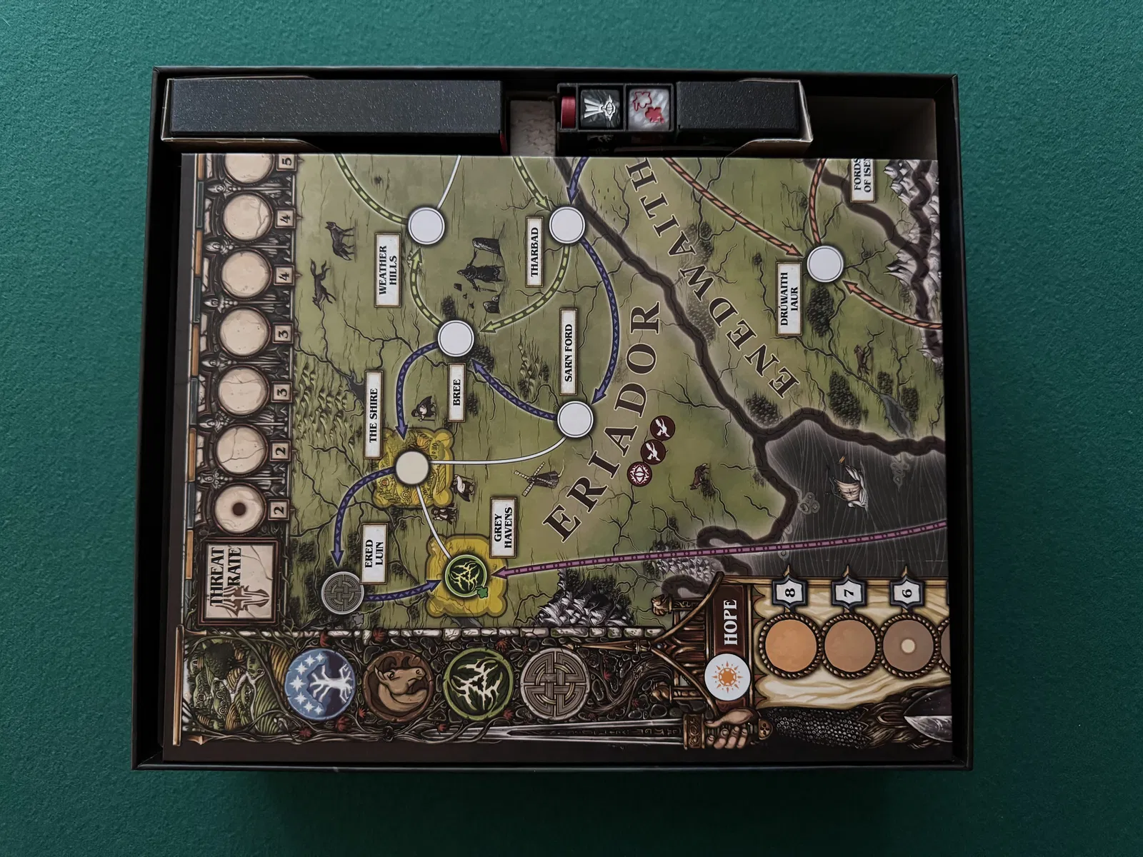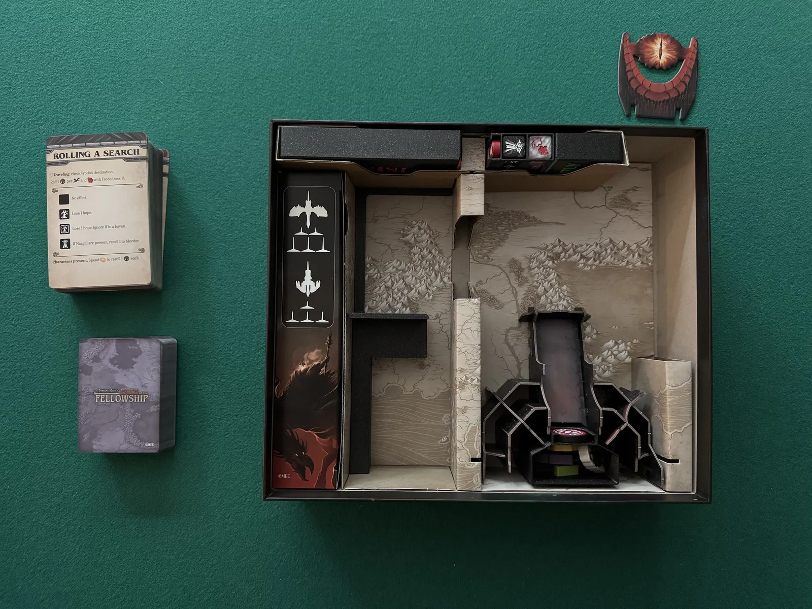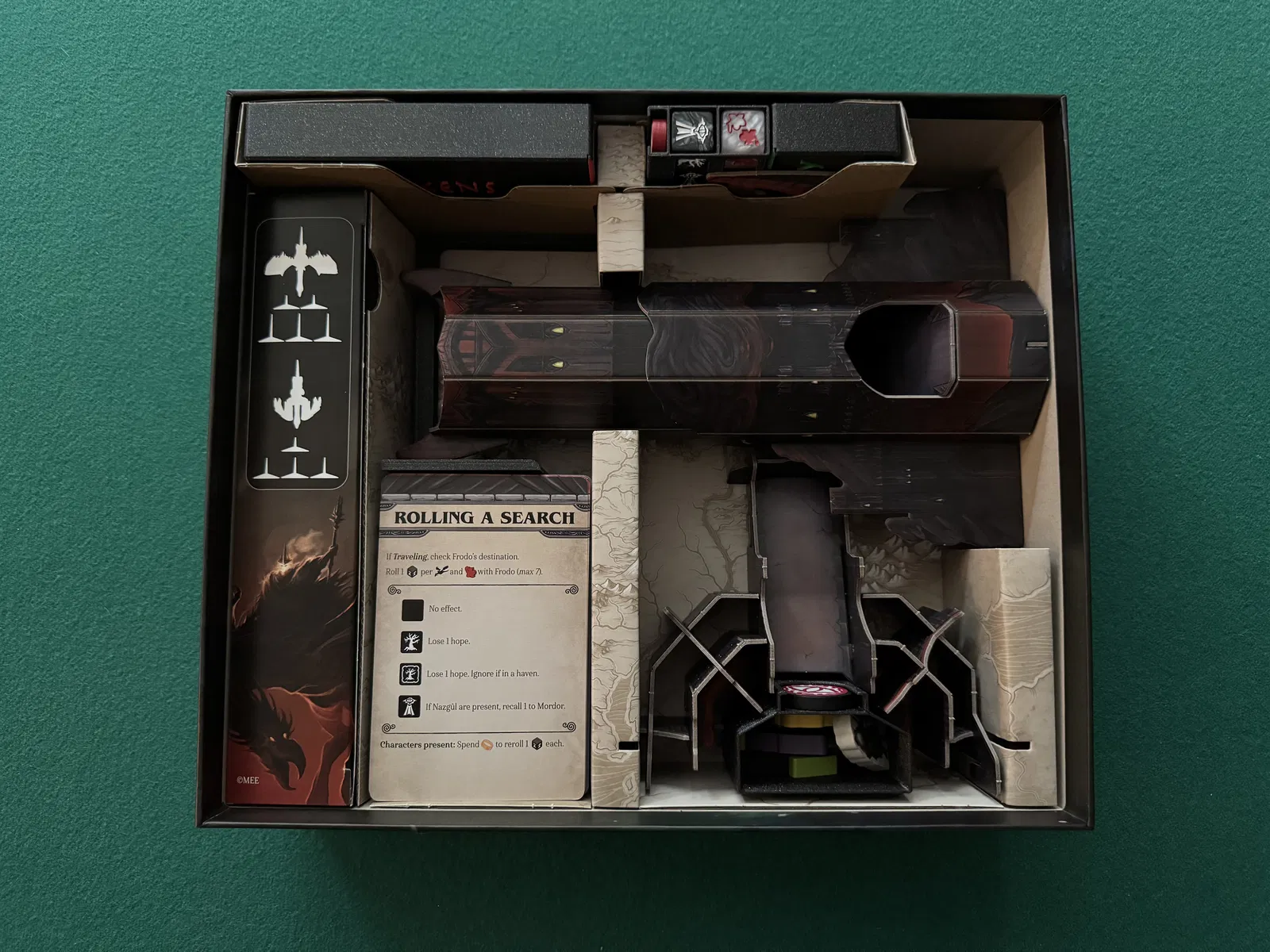 • DiceBox: Chứa xúc xắc, chỉ số vòng thread, chỉ số hope và chỉ số solo. Được cất trong khe hộp giấy ngắn hơn trong khay hộp gốc, bên cạnh hộp quân lính thân thiện. Có chỗ để cất phần nắp hộp giấy của tháp xúc xắc (Mắt Diều Hâu) trong cùng khe hộp giấy này.