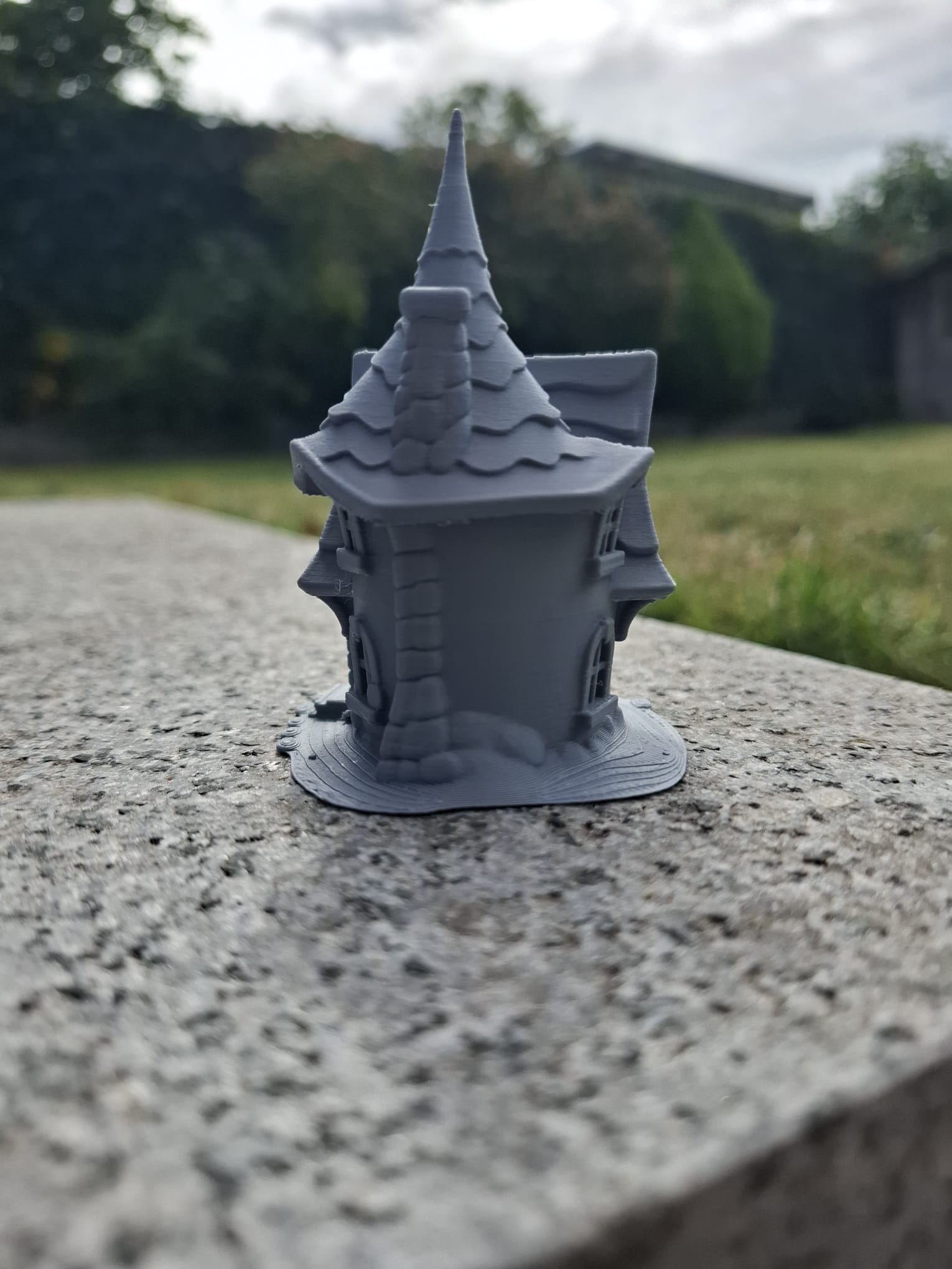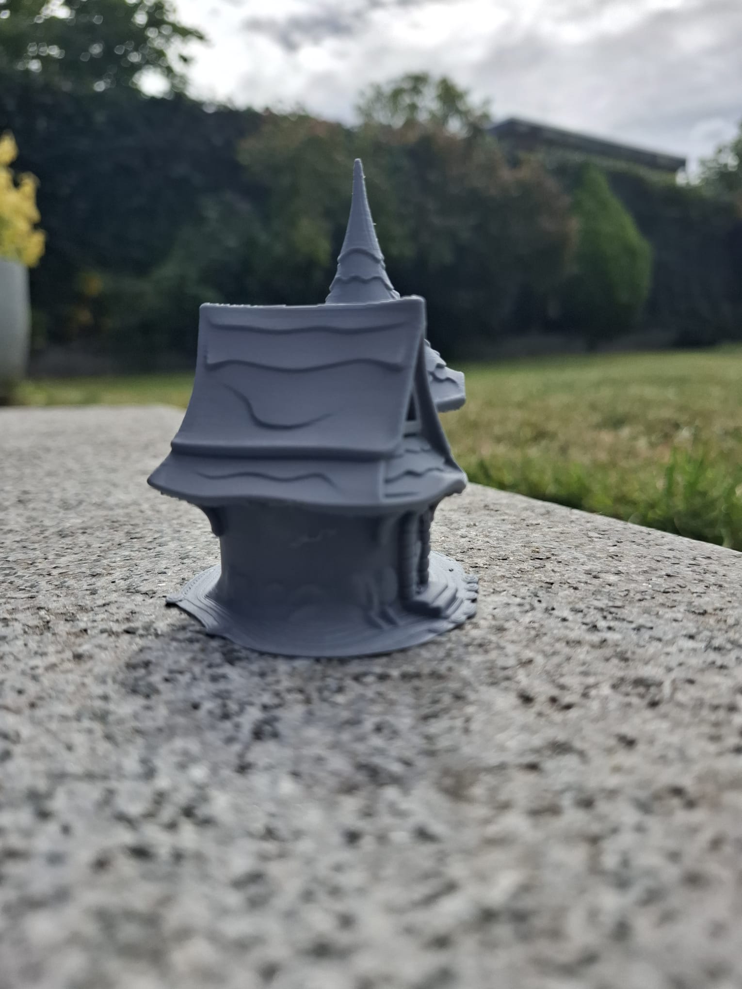 Ngôi nhà phù thủy nhỏ xinh cho mô hình hoặc để trang trí. Ngôi nhà nhỏ xiêu vẹo y như bước ra từ truyện cổ tích với tháp xoắn, mái lượn sóng, vừa ma mị vừa dễ thương. Thích hợp để trưng bày hoặc làm một phần của mô hình, làng Halloween.