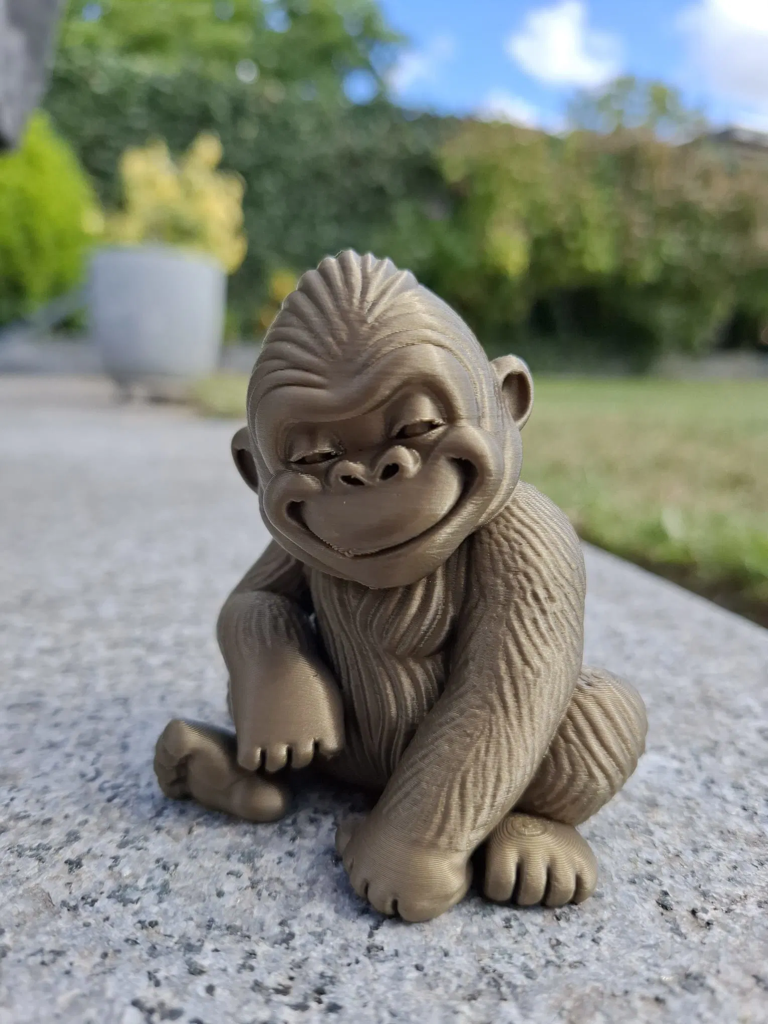 Chú gorilla con này có nụ cười "Con không có làm đâu nha" siêu đáng yêu. Hoàn hảo làm bạn đồng hành trên bàn làm việc, người gác chậu cây, hay linh vật trên kệ sách. In ra một mảnh với vân lông sắc nét và nụ cười hài lòng.
