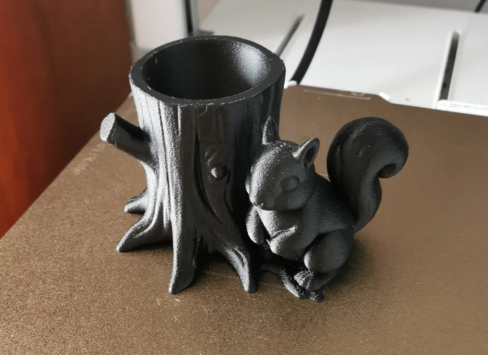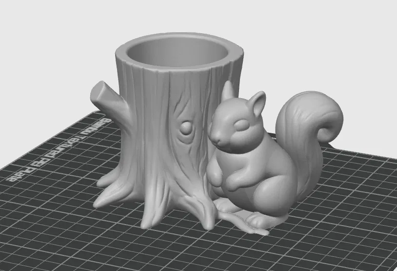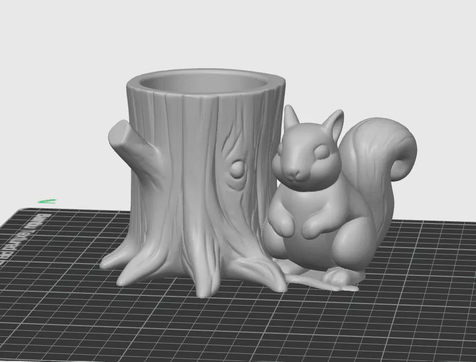 Dễ thương này, một món đồ trang trí bàn làm việc theo chủ đề rừng núi: gốc cây có hình chú sóc - để đựng bút chì. Cần phải có support nha. Tui đã in thử bằng chế độ Fuzzy Skin. Bạn có thể tùy chỉnh kích thước cho to lên hoặc thu nhỏ lại đều được.