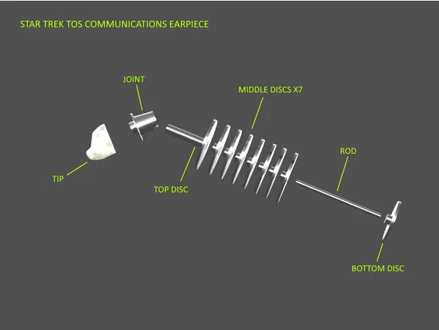 Mô hình tai nghe liên lạc Star Trek TOS, phiên bản đeo bởi Uhura. Dễ in, không cần hỗ trợ, chi tiết được cải thiện cho độ chính xác cao. Có thể in theo dạng trưng bày hoặc đeo, với vật liệu PLA tùy chọn.