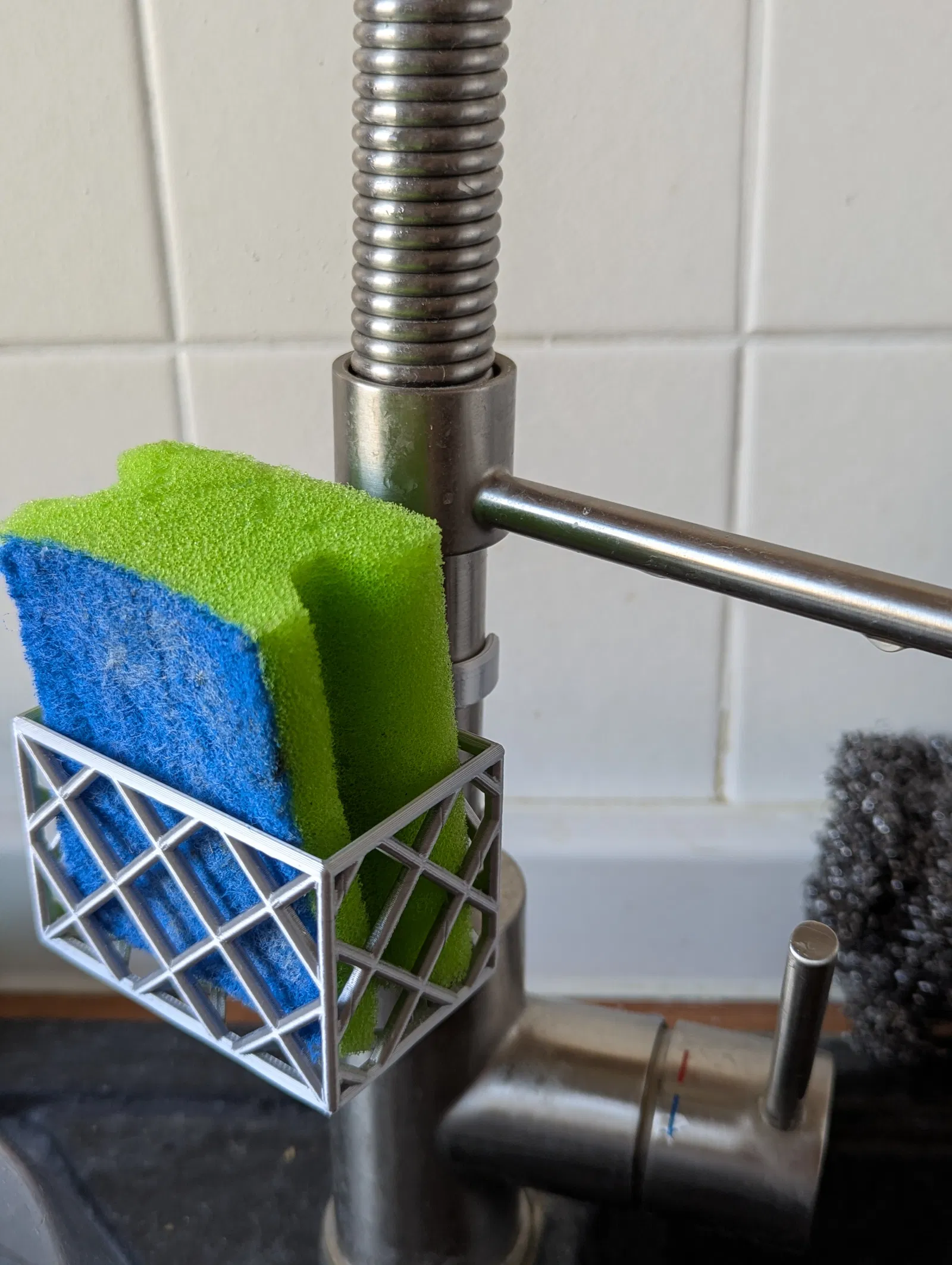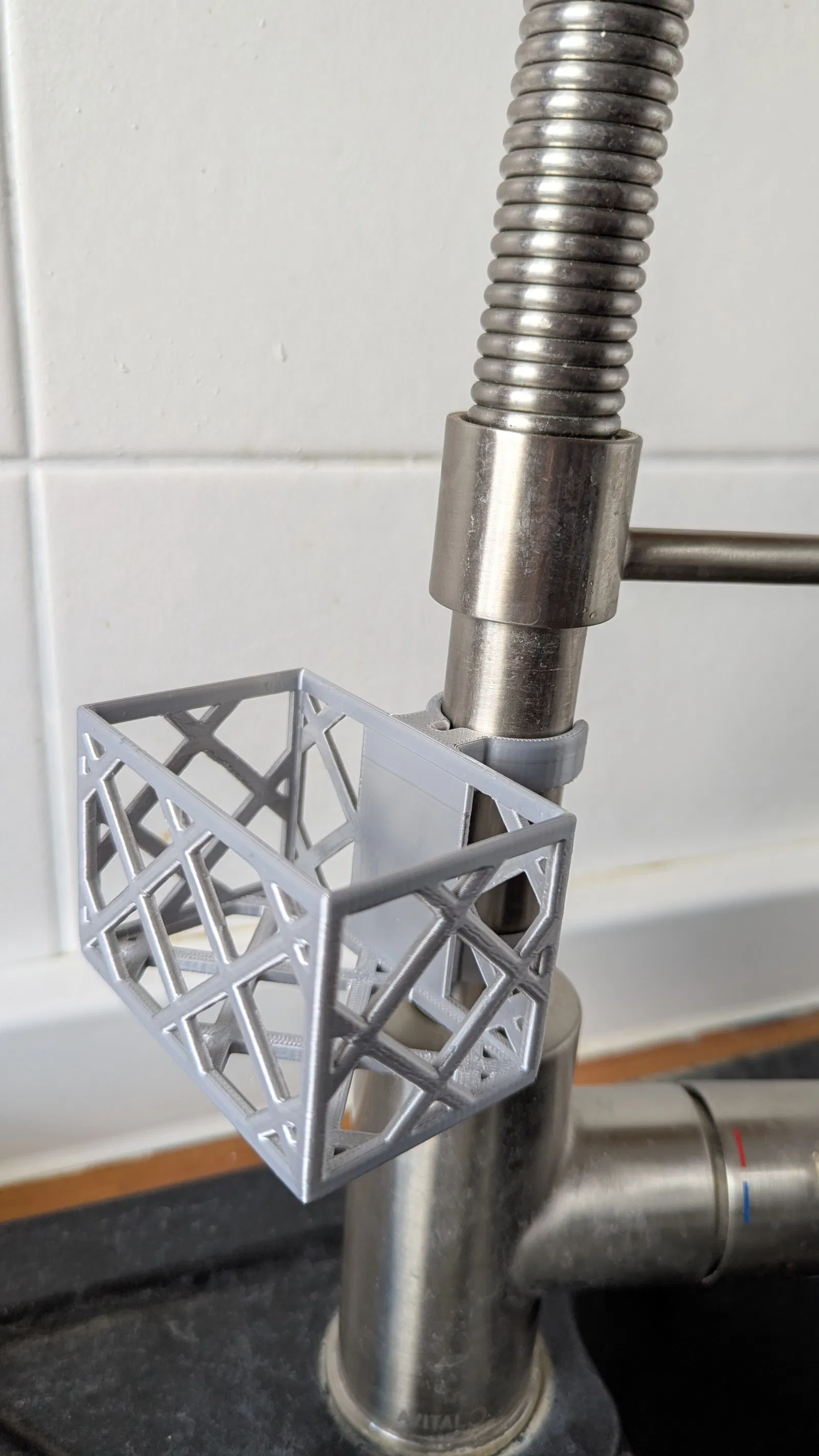 Kệ treo bọt biển chắc chắn, chỉ tốn 26g nhựa in, tiết kiệm không gian. In với support cây cho phần móc phía trên và dùng PLA bạc bóng nha.