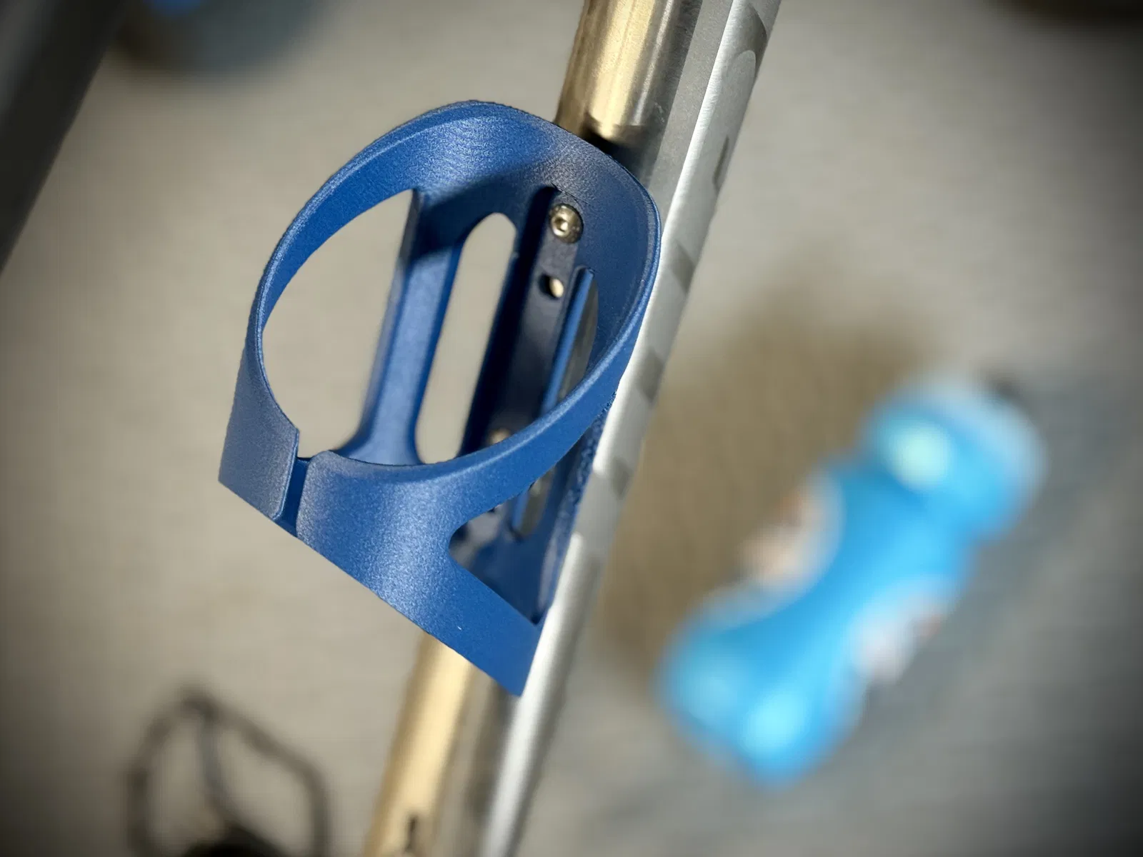 Kệ giữ bình nước xe đạp đơn giản, ôm vừa vặn. Thiết kế cho đường kính bình tiêu chuẩn 73mm. Chất liệu PETG-CF cho độ bền và độ dẻo tốt, bề mặt đẹp.