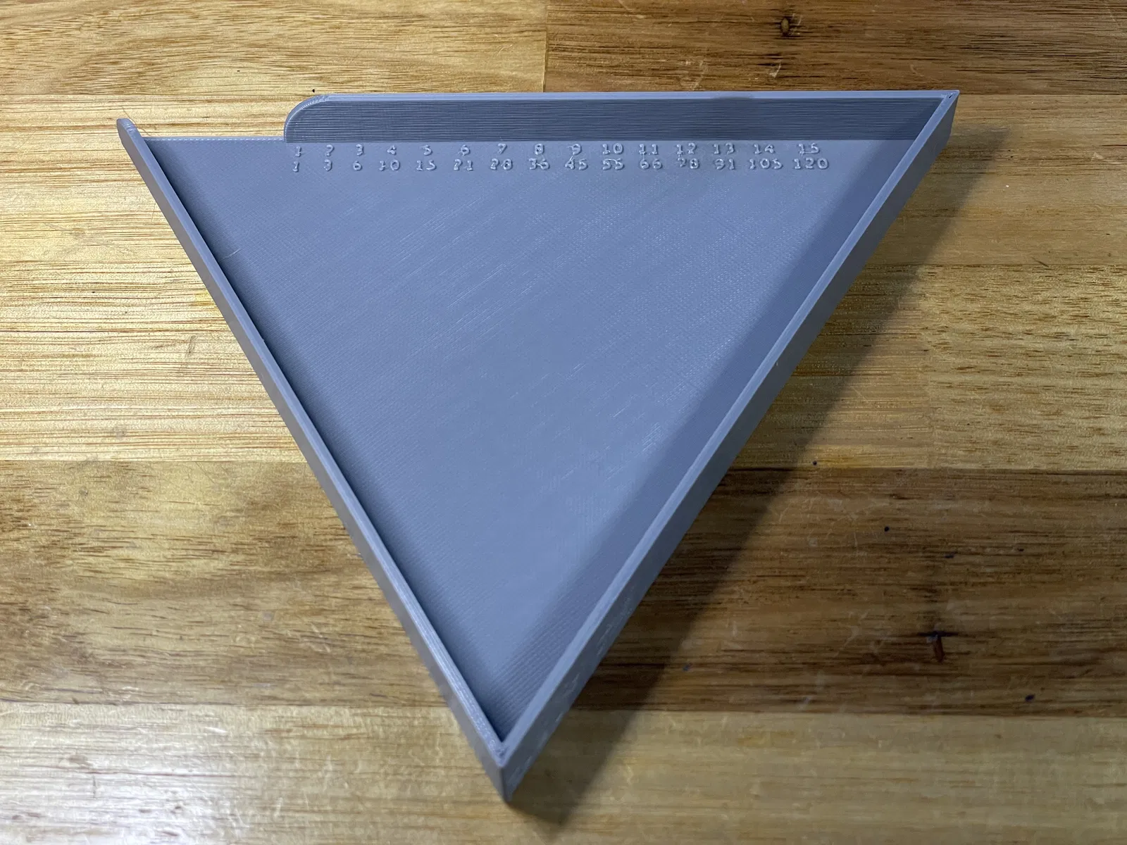 Tôi đã đính kèm một mô hình không có chữ trên đó, để bạn có thể in bằng bất kỳ kích thước đầu phun nào ở bất kỳ độ cao lớp nào, và chỉ cần tra cái bảng để biết số lượng. Tôi đã đính kèm một file PDF có bảng này, bạn có thể in ra, cắt nó ra và dán vào bên trong thành sau bằng một miếng băng keo.