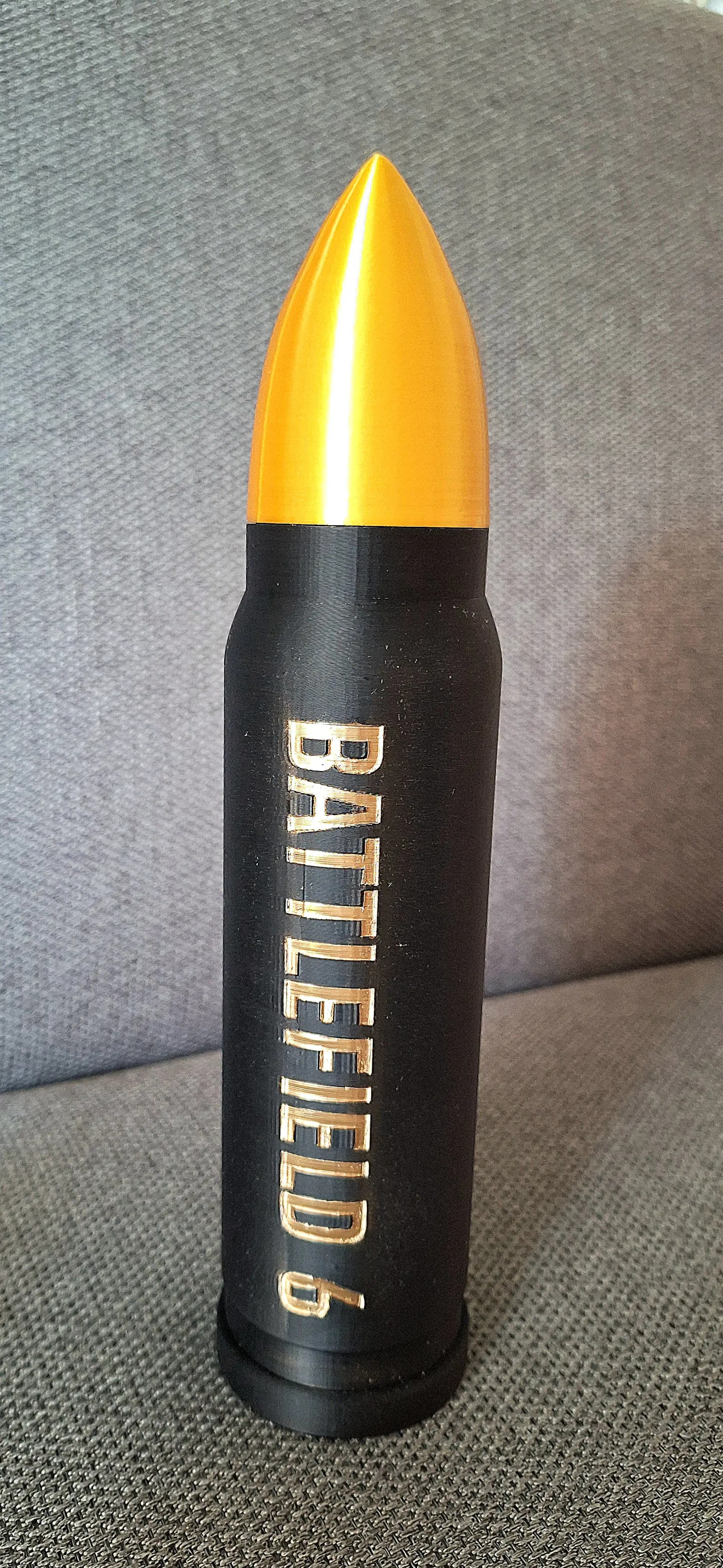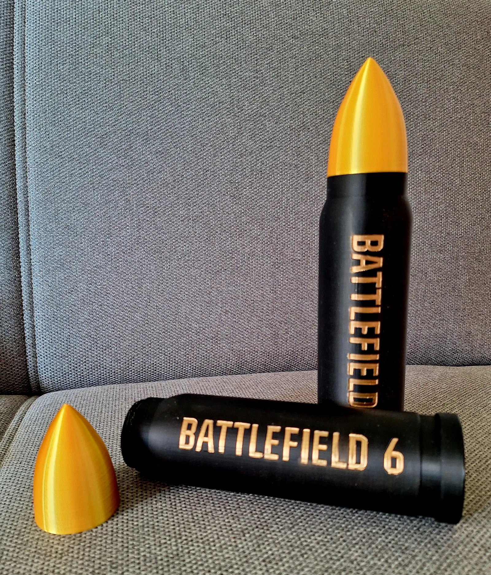 Hộp đựng hình viên đạn có nắp vặn. Cao 27 cm. Lấy cảm hứng từ Battlefield 6.