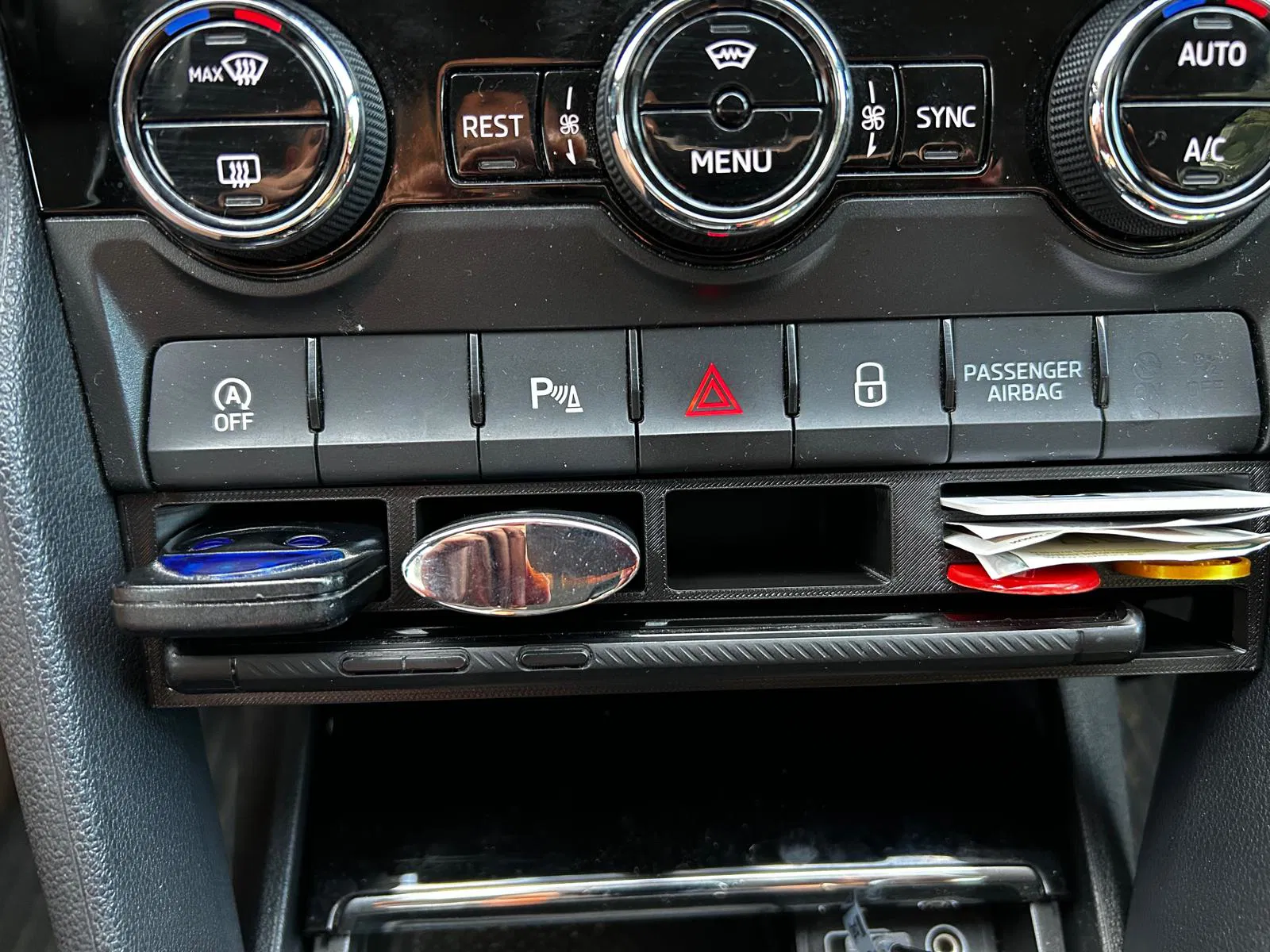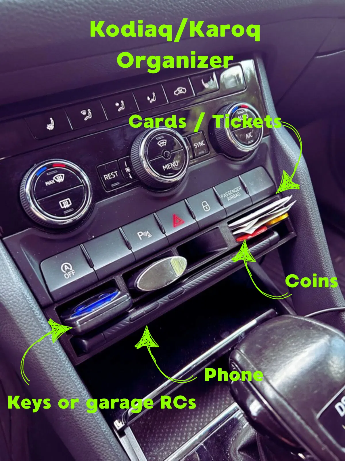Bộ tổ chức siêu tiện lợi để dưới bảng điều khiển AC trên Skoda Kodiaq và Karoq thế hệ 1. Dễ dàng in ấn, có chỗ để tiền xu, thẻ, remote và điện thoại, kèm lỗ cắm sạc. In bằng PETG để chịu nhiệt tốt.
