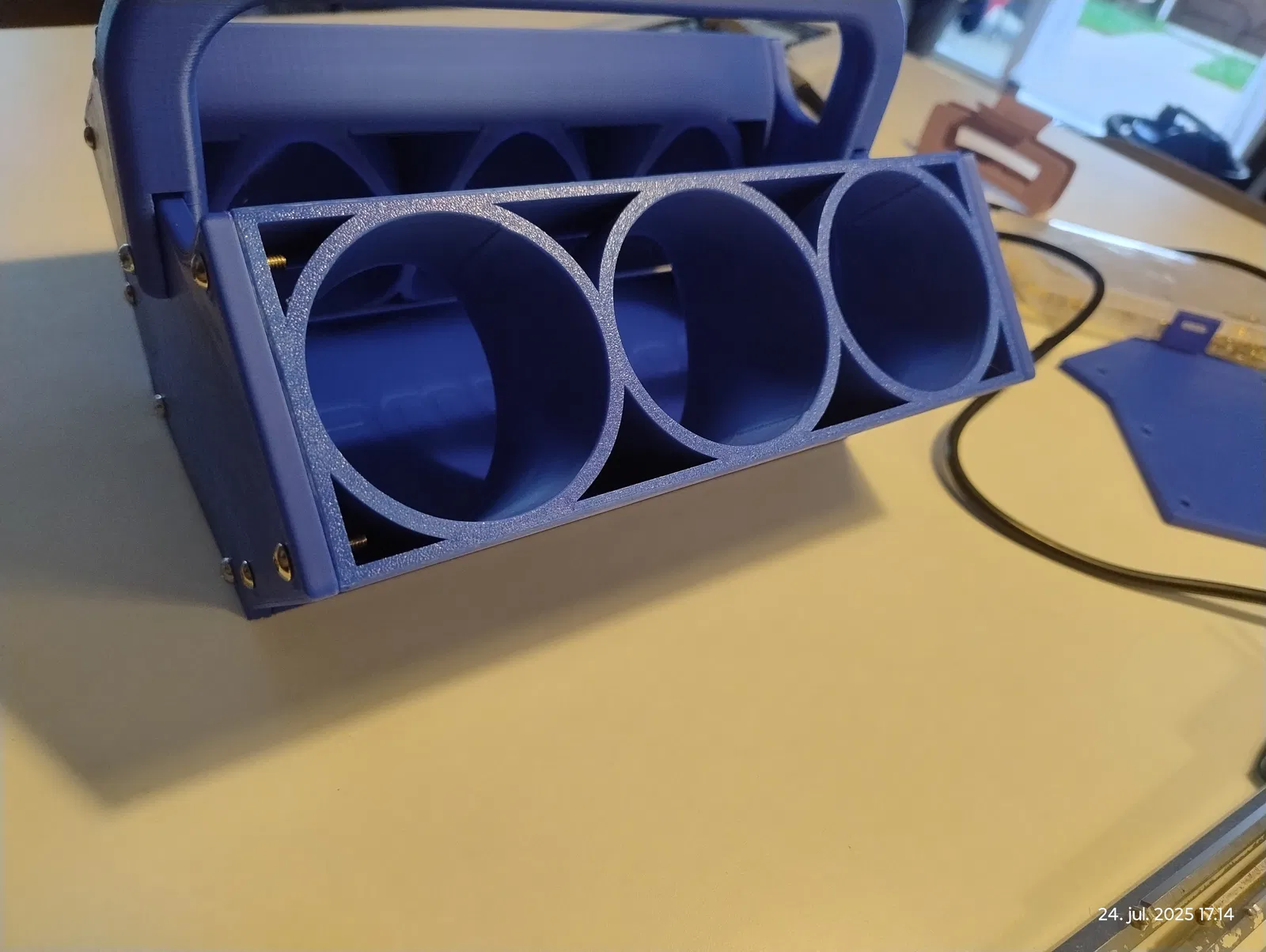 Tôi thiết kế để có thể in trên khay 220x220mm, bạn chỉnh hướng in sao cho phù hợp với các bộ phận nha. Mấy cái trụ và đáy có gắn sẵn ốc nhiệt (ren M4, đường kính ngoài 5.4mm, mua trên aliexpress), mấy cạnh bên thì bắt vít (tối thiểu M4x10mm để bắt cho chắc), tui cũng gắn ốc nhiệt ở mặt trong của tay cầm luôn.
