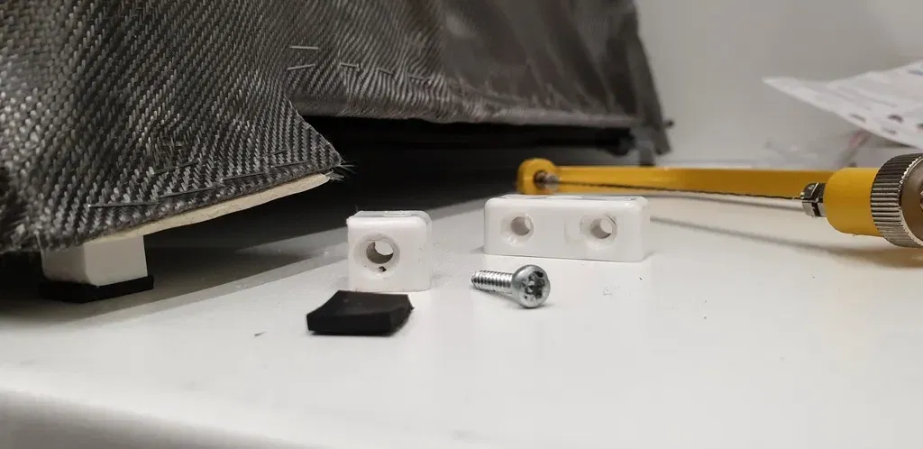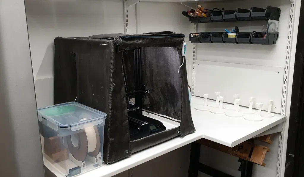 Một vỏ bọc cho máy in 3D, có khung làm từ các thanh tent bằng sợi thủy tinh và một lớp vỏ bằng sợi thủy tinh.