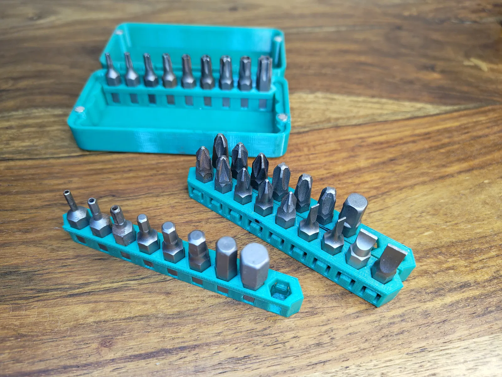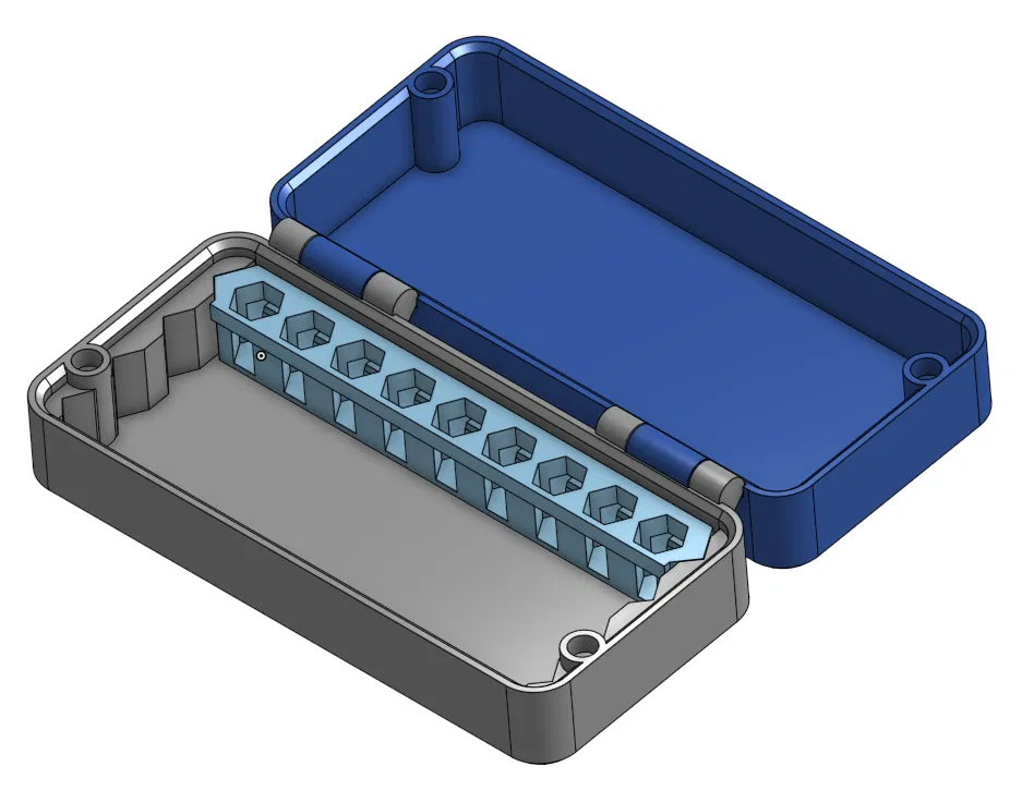 Phần hộp chính được in liền khối (print-in-place) và sử dụng nam châm D4 mm × 1.5 mm hoặc dày 3 mm để giữ hộp đóng chắc chắn. Các lẫy lò xo ở mỗi hàng giữ cho các mũi lục giác không bị rơi ra, nhưng vẫn dễ dàng lấy ra khi cần.